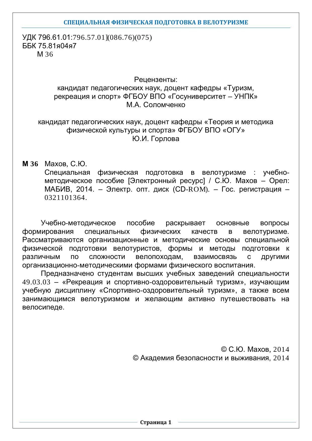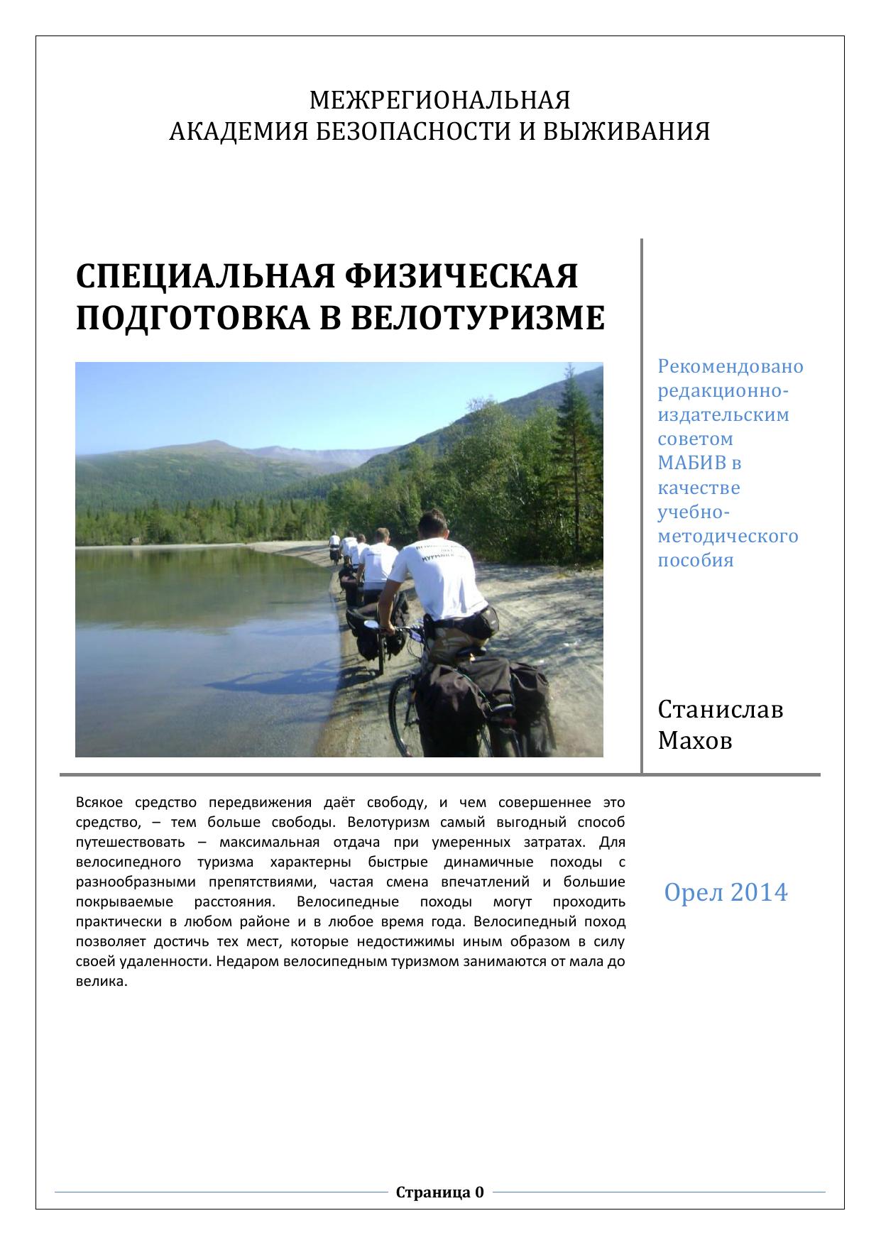 Учебно-методическое пособие раскрывает основные вопросы формирования специальных физических качеств в велотуризме. Рассматриваются организационные и методические основы специальной физической подготовки велотуристов, формы и методы подготовки к различным по сложности велопоходам, взаимосвязь с другими организационно-методическими формами физического воспитания.