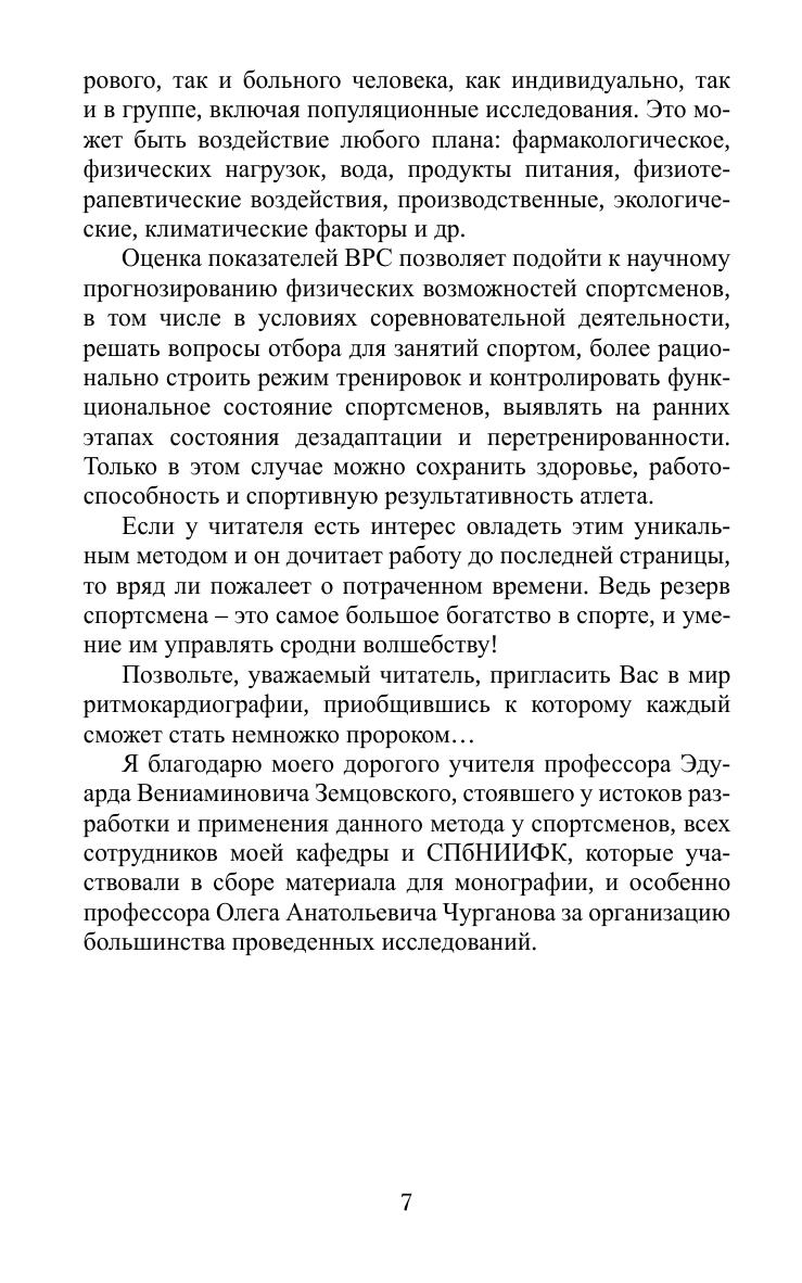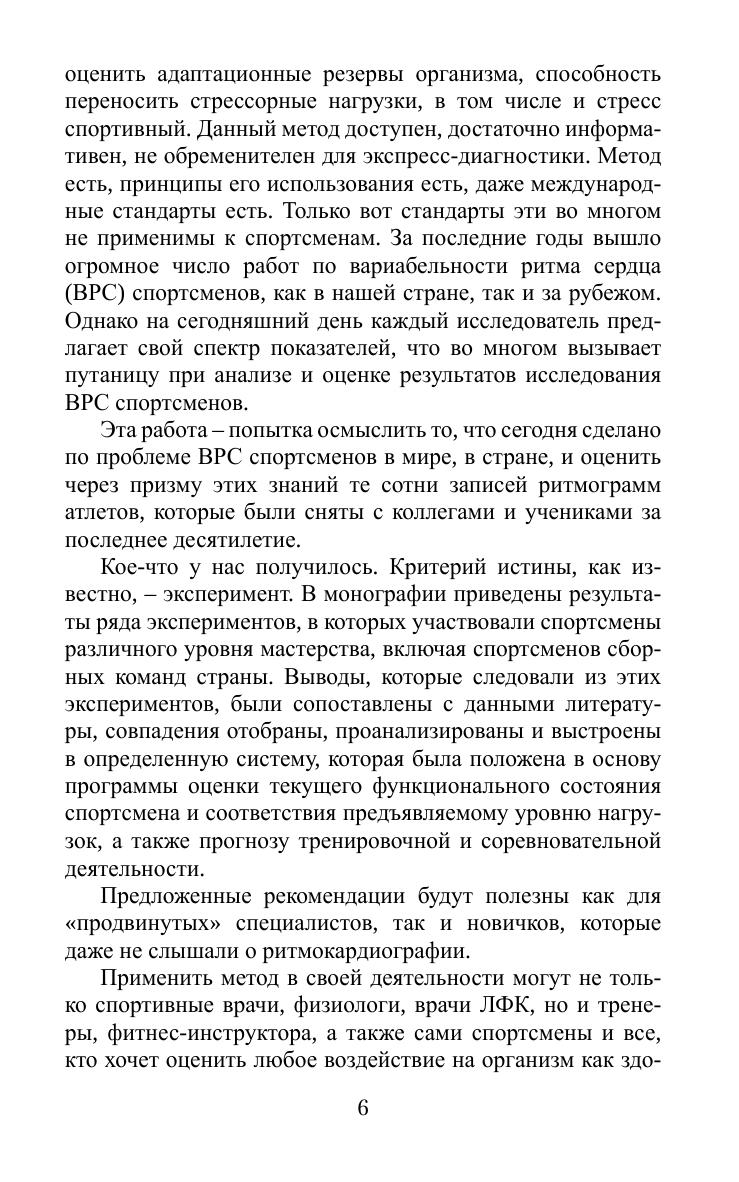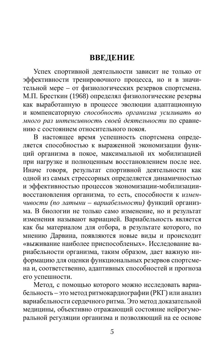 Монография посвящена решению ряда прикладных задач спортивной подготовки: отбор, контроль за тренировочным процессом, прогноз соревновательной деятельности и развития состояний перетренированности через изучение вариабельности ритма сердца у спортсменов. В работе приведен исчерпывающий обзор литературы по использованию ритмокардиографии в спорте – одного из самых стрессорных видов деятельности человека, а также ряд собственных исследований ритмограмм спортсменов различного уровня мастерства, включая спортсменов сборных команд страны. Предложена авторская методика оценки текущего функционального состояния спортсмена на разных этапах подготовки и соответствия предъявляемому уровню нагрузок, а также прогноза тренировочной и соревновательной деятельности. Монография будет полезна как «продвинутым» специалистам, так и новичкам. Издание представляет интерес для спортивных врачей, спортивных физиологов, тренеров, фитнес-инструкторов, а также спортсменов.