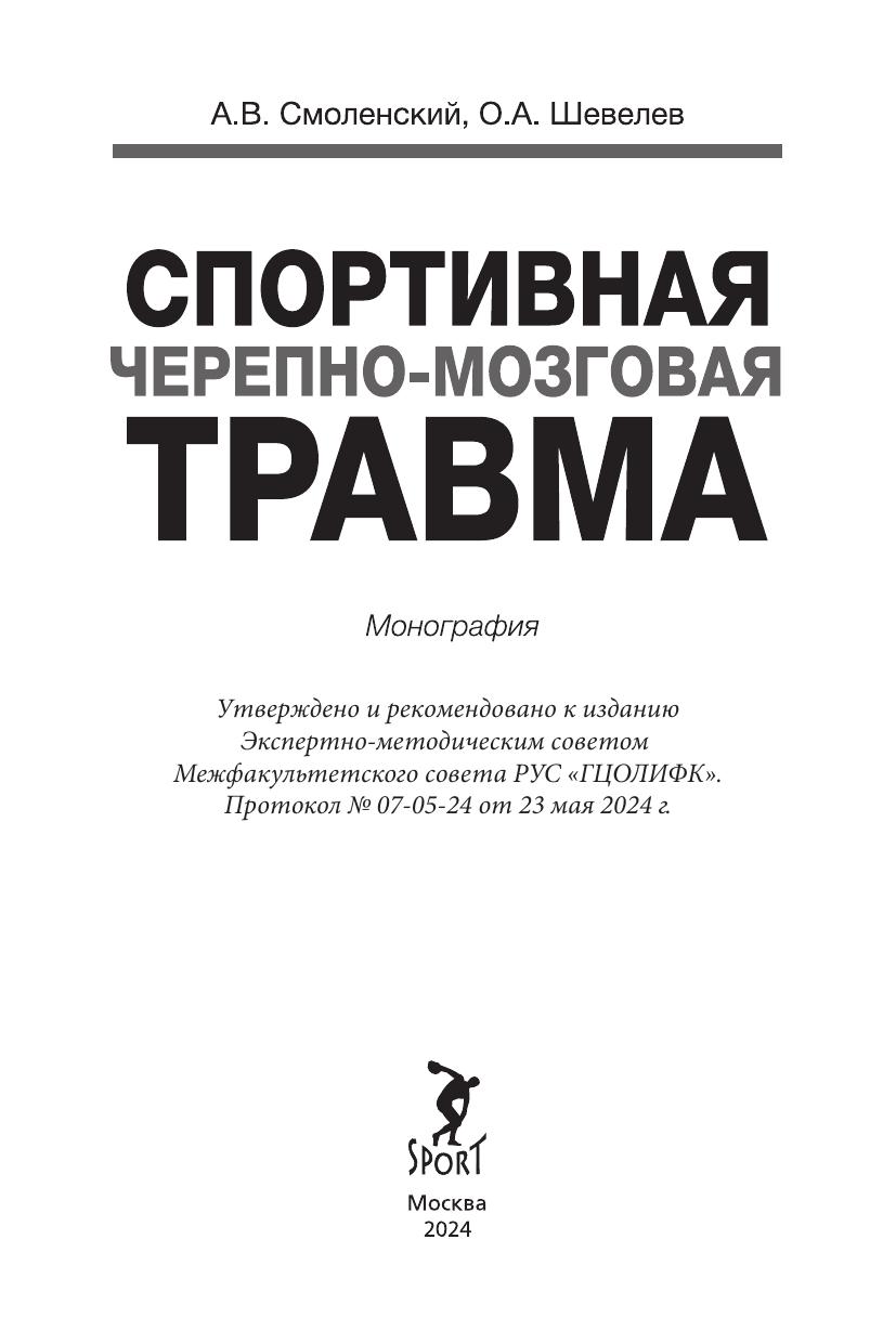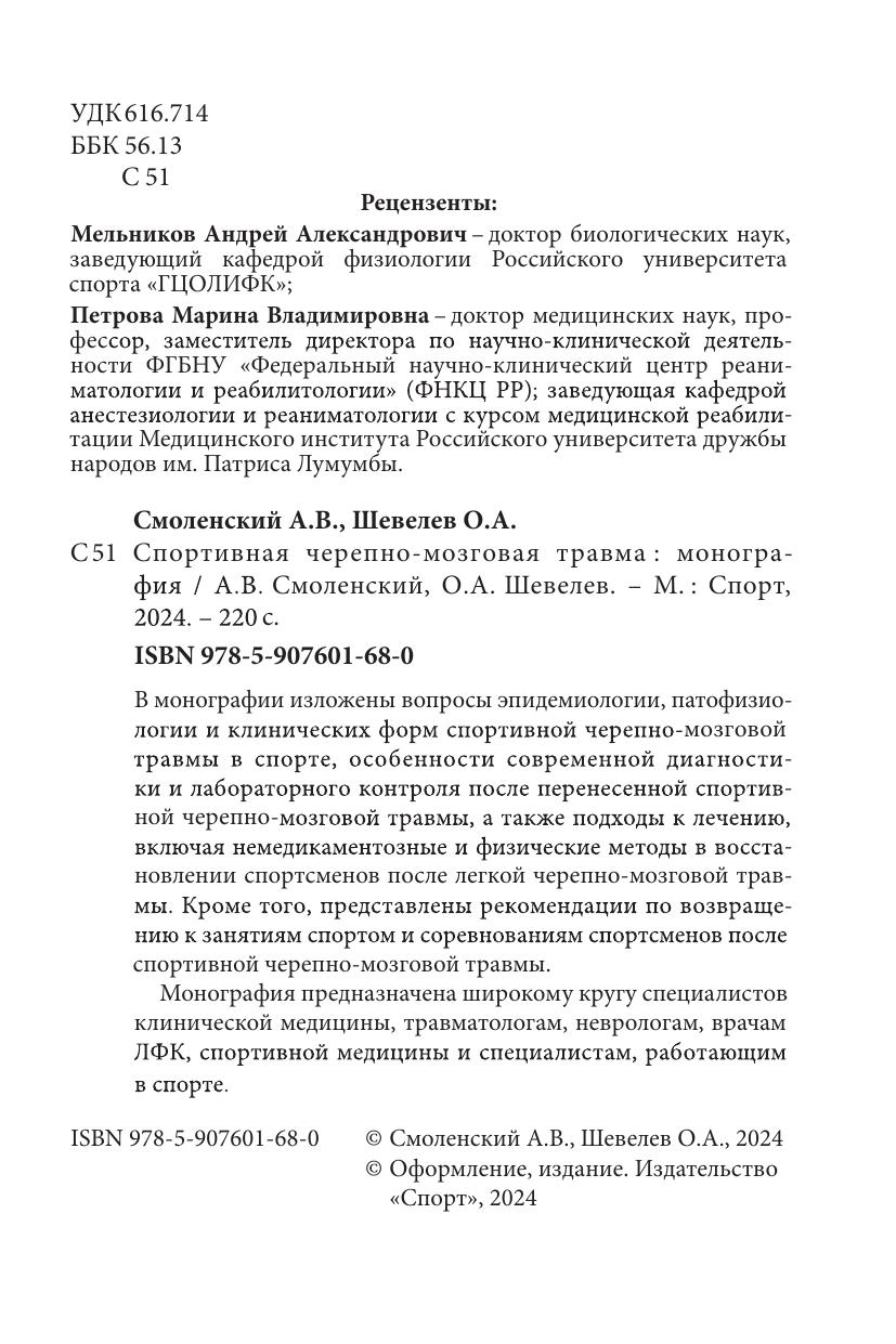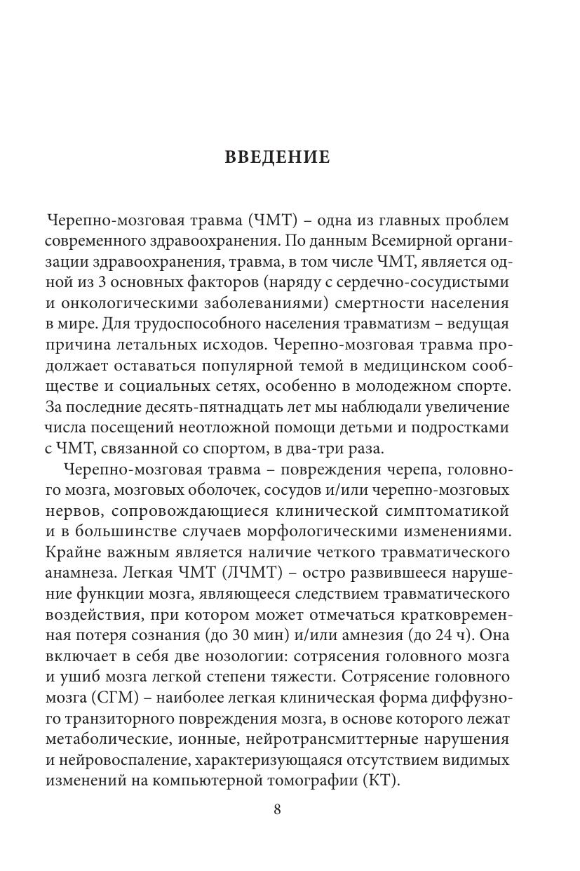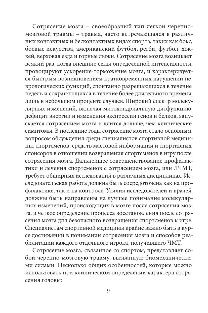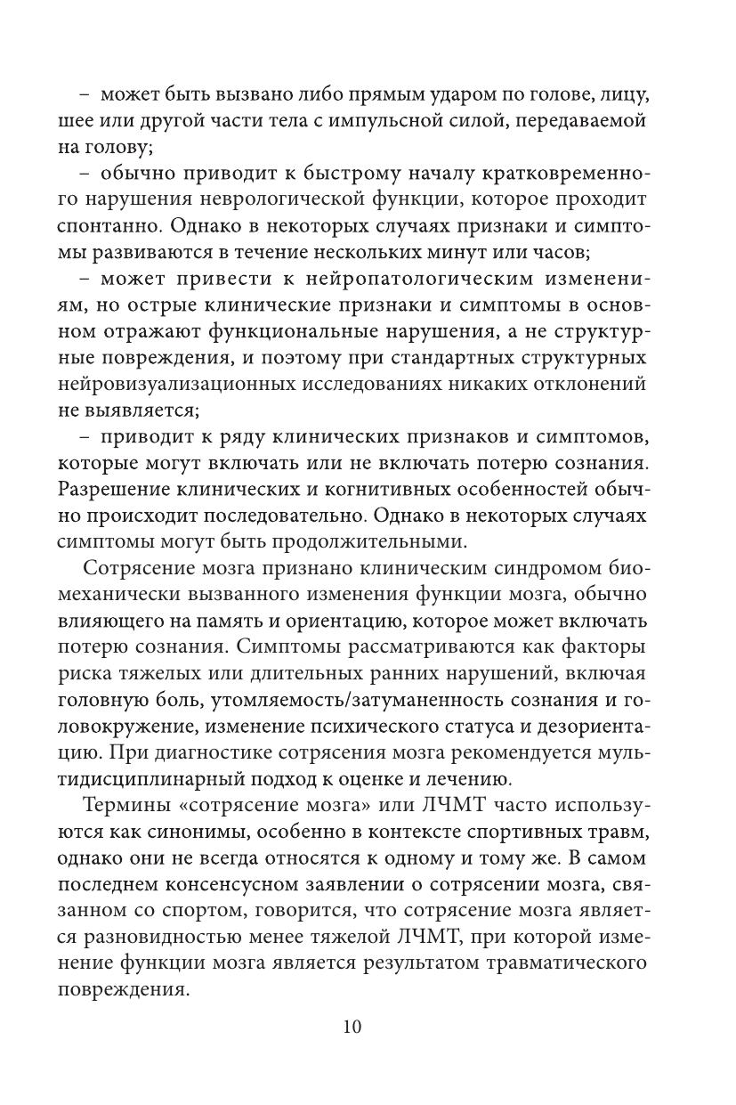 В монографии изложены вопросы эпидемиологии, патофизиологии и клинических форм спортивной черепно-мозговой травмы в спорте, особенности современной диагностики и лаболаторного контроля после перенесенной черепно-мозговой травмы, а также подходы к лечению, включая немедикоментозные и физические методы в восстановленииспортсменов после легкой черепно-мозговой травмы. Кроме того представлены рекомендации по возвращению к занятиям спортом и соревнованиям спортсменов после спортивной черепно-мозговой травмы. Монография предназначена широкому кругу специалистов клинической медицины, травмотологам, неврологам, врачам ЛФК, спортивной медицины и специалистам, работающим в спорте.