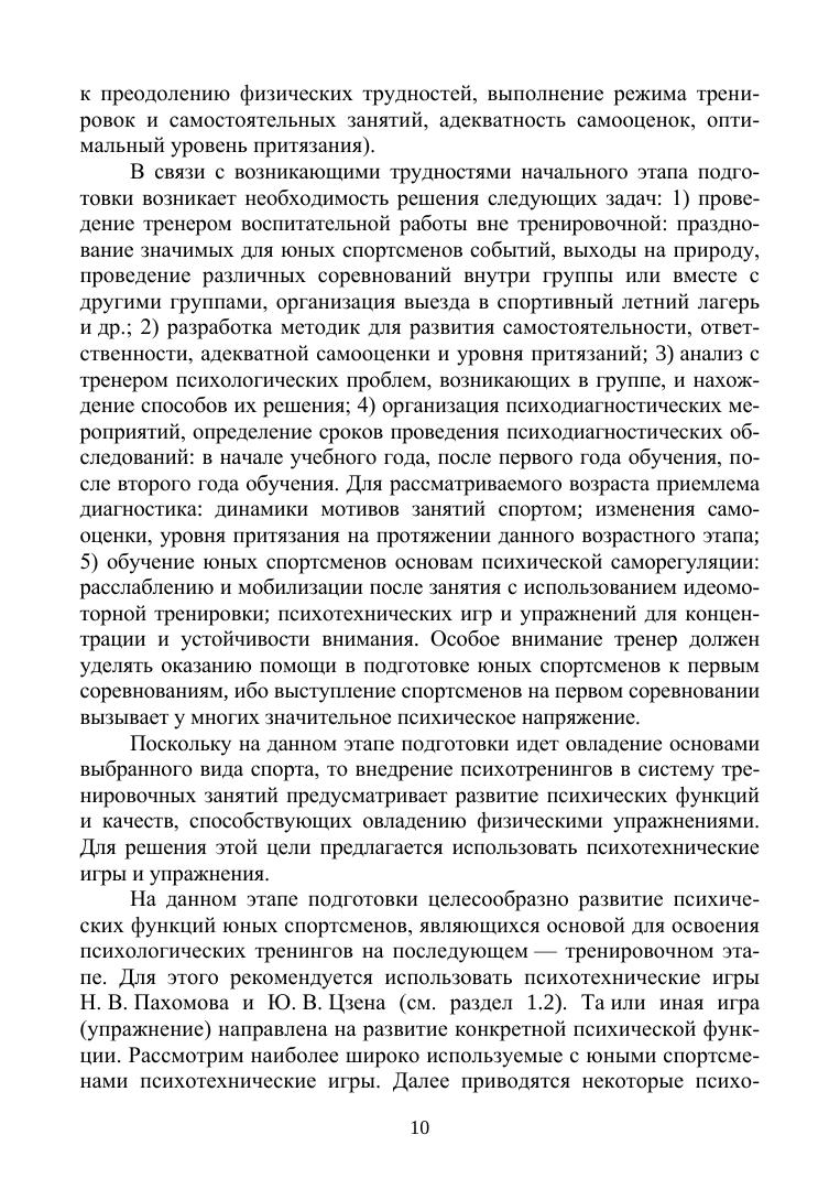 В учебном пособии излагается комплекс психологических тренингов для под-готовки спортсменов к соревнованиям: формирования спортивной мотивации (сорев-новательной мотивации, мотивации достижения успеха), развития психических функций (внимания, восприятия, ощущения и др.) и ряда психологических качеств, определяющих овладение спортивными упражнениями и успешное выступление на соревнованиях (рефлексивности, способности к психорегуляции, адаптации к сорев-новательной деятельности).