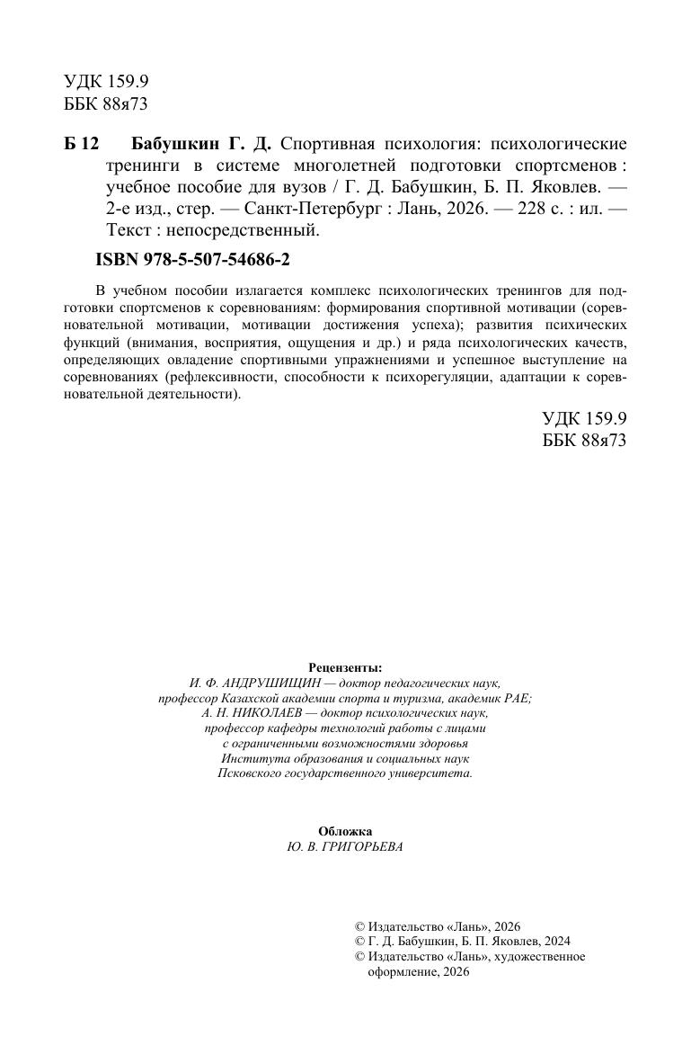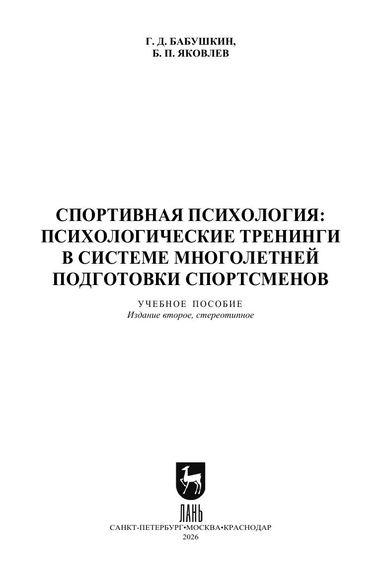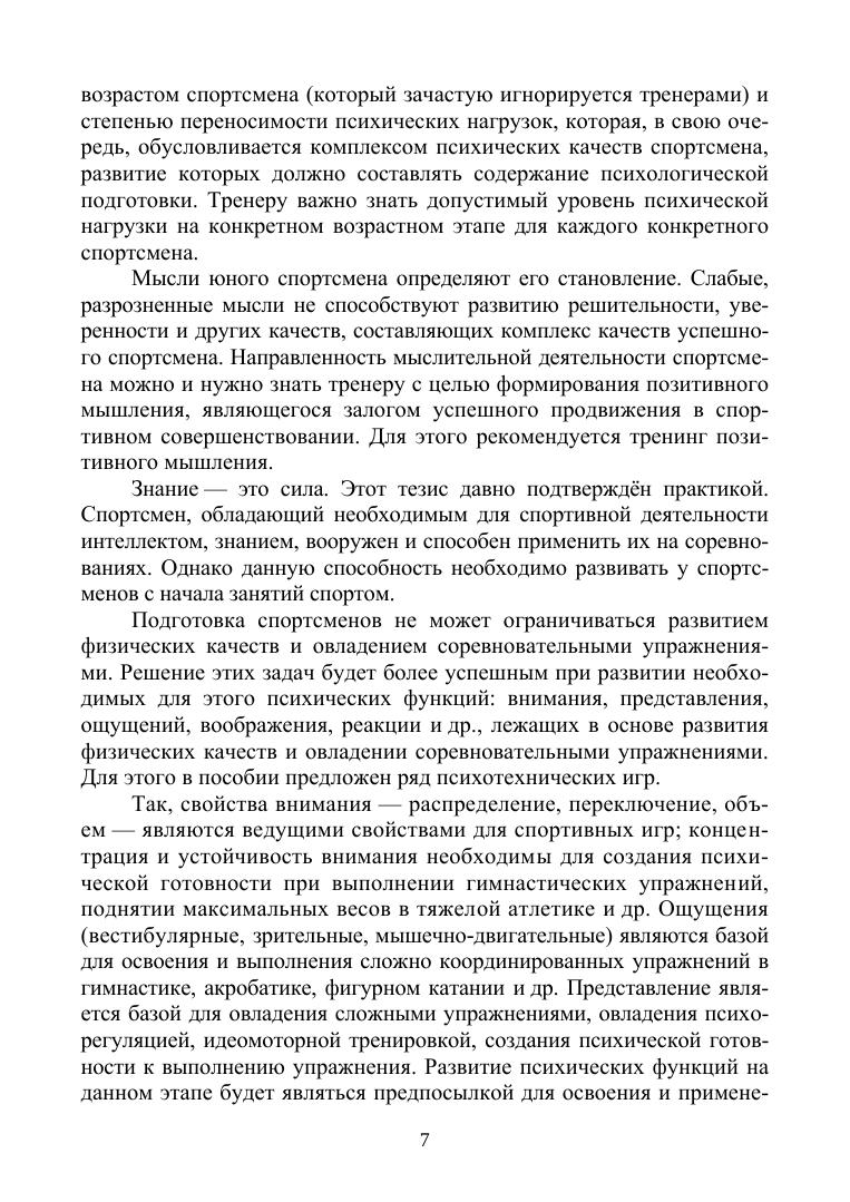 В учебном пособии излагается комплекс психологических тренингов для под-готовки спортсменов к соревнованиям: формирования спортивной мотивации (сорев-новательной мотивации, мотивации достижения успеха), развития психических функций (внимания, восприятия, ощущения и др.) и ряда психологических качеств, определяющих овладение спортивными упражнениями и успешное выступление на соревнованиях (рефлексивности, способности к психорегуляции, адаптации к сорев-новательной деятельности).