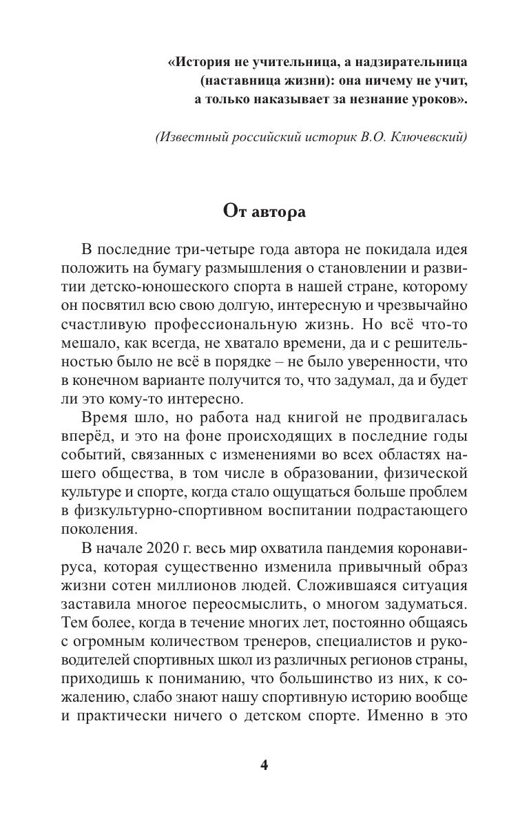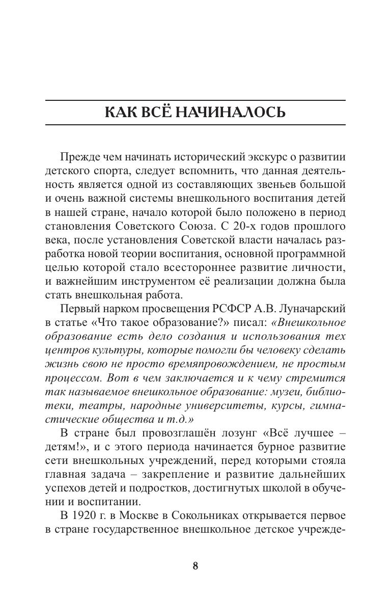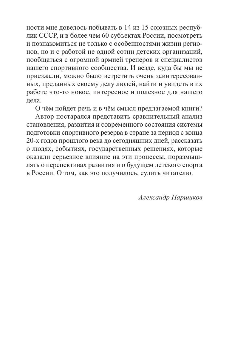 Книга посвящена детско-юношескому спорту, истории создания и развития спортивных школ в нашей стране с середины 20-х годов прошлого столетия по сегодняшний день. На основе многолетнего опыта работы изложена точка зрения автора на подготовку спортивного резерва. За это время неоднократно менялись правовые, организационные и методические аспекты деятельности спортивных школ в русле тех трансформаций, которые происходили в обществе. Анализируются принятые на разных этапах важные государственные решения, которые существенным образом повлияли на основные тенденции в развитии организационной структуры спортивных школ и содержание многолетней подготовки спортсменов. Книга предназначена для руководителей и сотрудников органов исполнительной власти в области образования, физической культуры и спорта разных уровней, директоров, специалистов и тренеров спортивных школ, а также других образовательных и физкультурно-спортивных организаций. Данное исследование может быть использована в качестве учебного пособия для студентов специальных профессиональных и высших учебных заведений физкультурно-спортивной направленности.