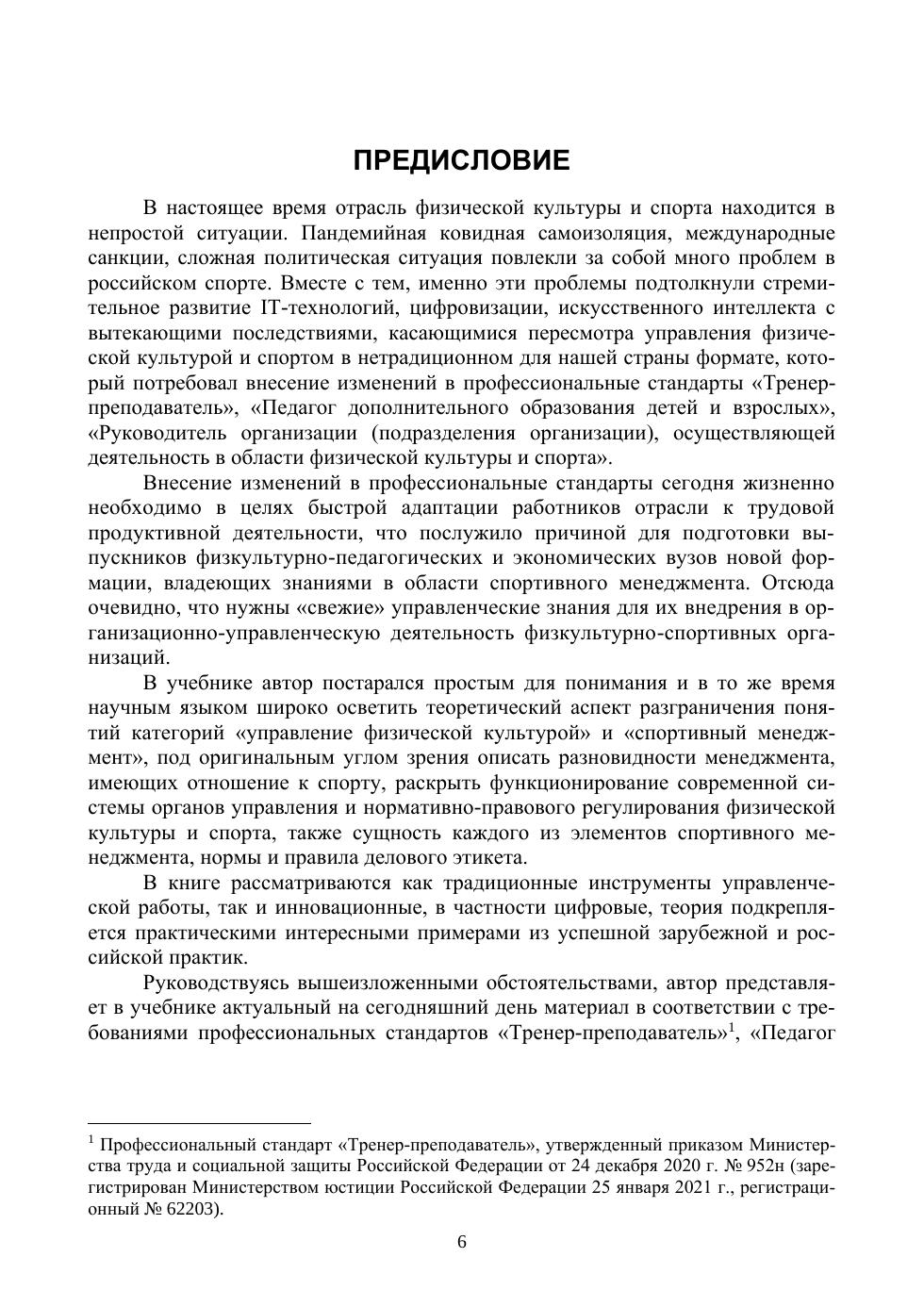 В учебнике изложен краткий экскурс в историю управления физической культурой и спортивного менеджмента, раскрыты разновидности и принципы отраслевого менеджмента, особенности современной системы органов управления и нормативно-правового регулирования физической культуры, спорта в РФ, конкретизирована работа цифровых технологий в государственном и муниципальном управлении, негосударственных цифровых систем, применяемых в менеджменте физкультурно-спортивных организаций.