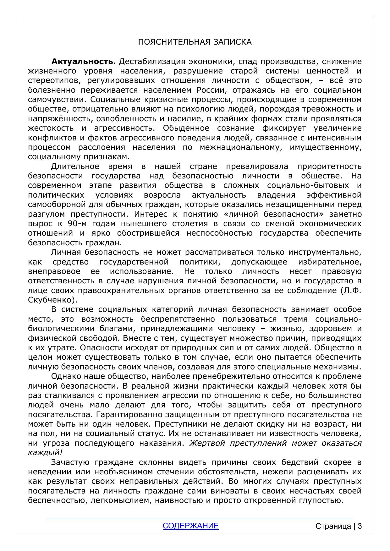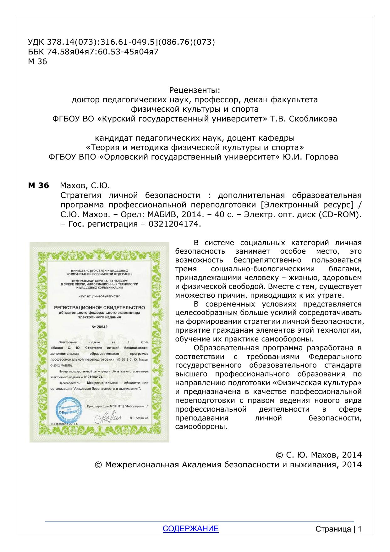 В системе социальных категорий личная безопасность занимает особое место, это возможность беспрепятственно пользоваться тремя социально-биологическими благами, принадлежащими человеку – жизнью, здоровьем и физической свободой. Вместе с тем, существует множество причин, приводящих к их утрате. В современных условиях представляется целесообразным больше усилий сосредотачивать на формировании стратегии личной безопасности, привитие гражданам элементов этой технологии, обучение их практике самообороны. Образовательная программа разработана в соответствии с требованиями Федерального государственного образовательного стандарта высшего профессионального образования по направлению подготовки «Физическая культура» и предназначена в качестве профессиональной переподготовки с правом ведения нового вида профессиональной деятельности в сфере преподавания личной безопасности, самообороны.