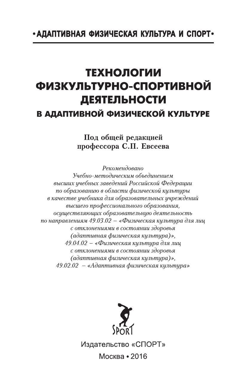 Гриф: Рекомендовано Учебно-методическим объединением высших учебных заведений Российской Федерации по образованию в области физической культуры в качестве учебника для образовательных учреждений высшего профессионального образования, осуществляющих образовательную деятельность по направлениям 49.03.02 - «Физическая культура для лиц с отклонениями в состоянии здоровья (адаптивная физическая культура)», 49.04.02 - «Физическая культура для лиц с отклонениями в состоянии здоровья (адаптивная физическая культура)», 49.02.02 - «Адаптивная физическая культура»