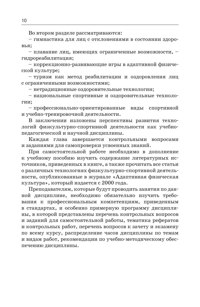 Учебник «Технологии физкультурно-спортивной деятельности в адаптивной физической культуре» раскрывает содержание наиболее важных профессиональных компетенций государственных образовательных стандартов высшего и среднего профессионального образования по направлениям 49.03.01 – «Физическая культура», 49.03.02 – «Физическая культура для лиц с отклонениями в состоянии здоровья (адаптивная физическая культура)» и специальности 050142 – «Адаптивная физическая культура». Учебник предназначен для студентов высших учебных заведений, учащихся техникумов, училищ и колледжей, изучающих адаптивную физическую культуру, а также аспирантов и преподавателей, проводящих научно-исследовательскую работу в этой области.