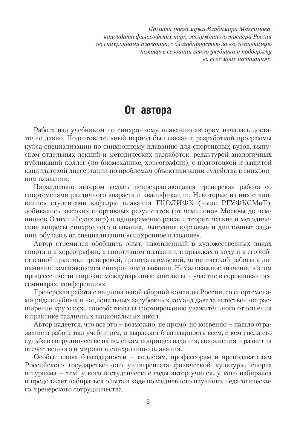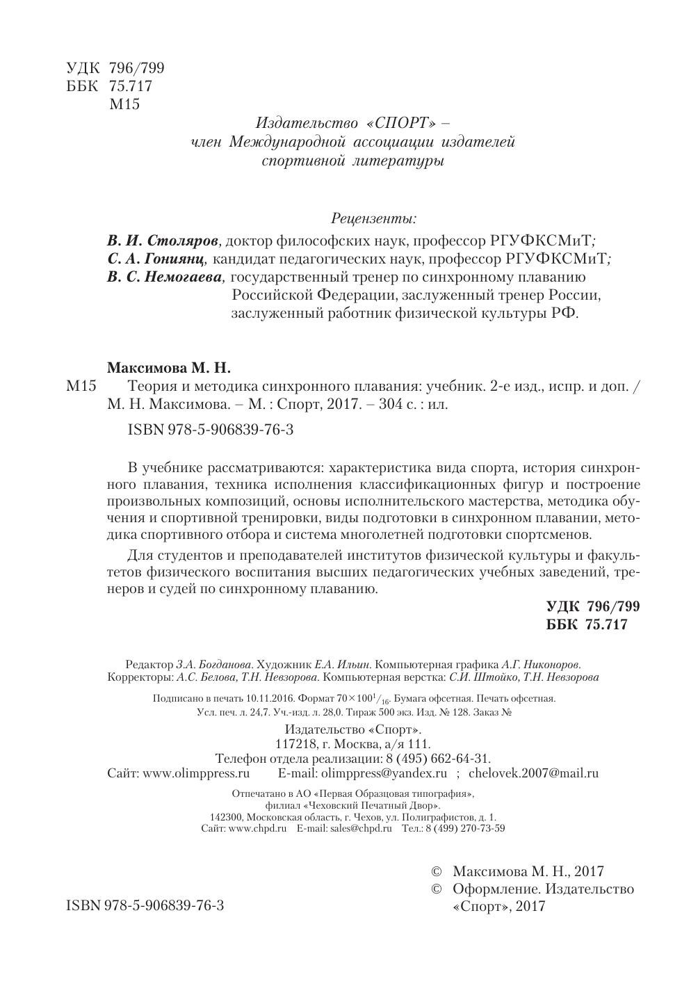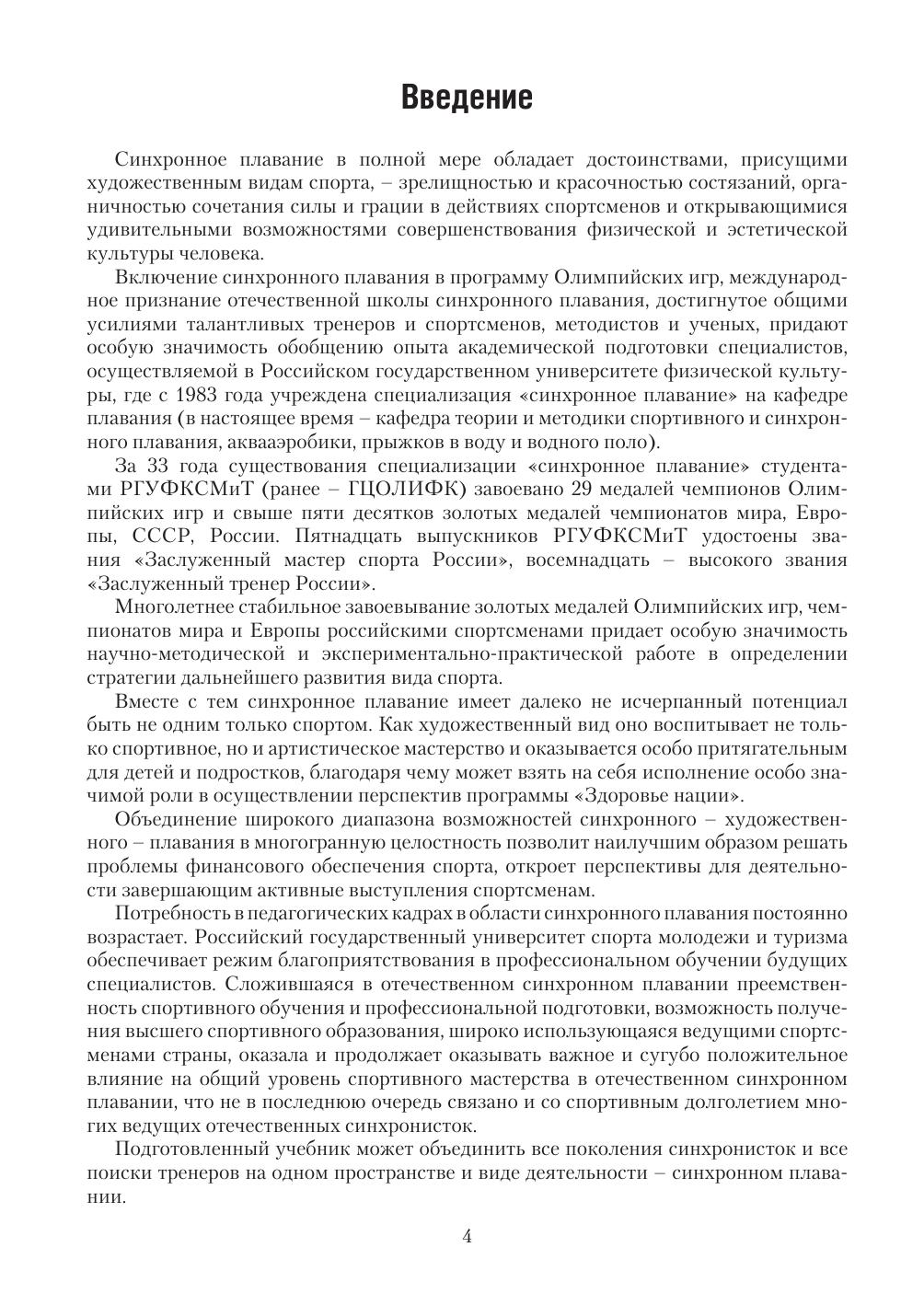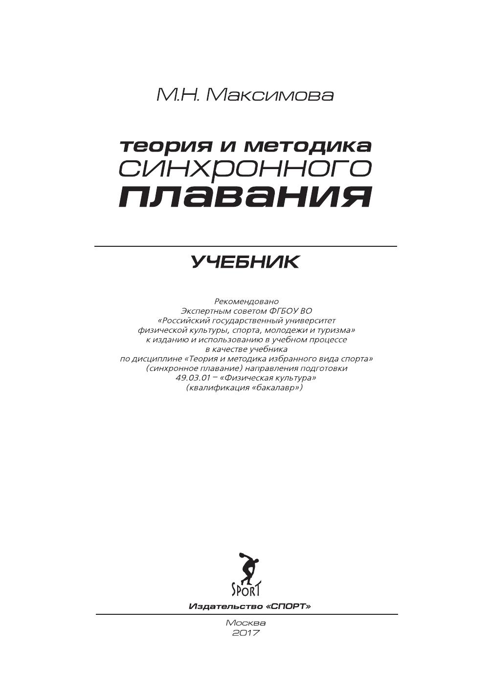 Гриф: Рекомендовано Экспертным советом ФГБОУ ВО «Российский государственный университет физической культуры, спорта, молодежи и туризма» к изданию и использованию в учебном процессе в качестве учебника по дисциплине «Теория и методика избранного вида спорта» (синхронное плавание) направления подготовки 49.03.01 ~ «Физическая культура» (квалификация «бакалавр»)