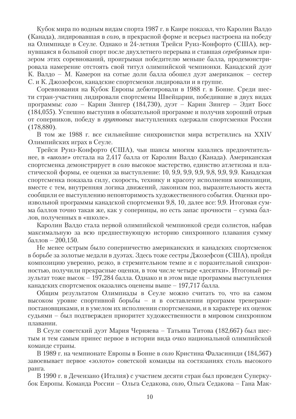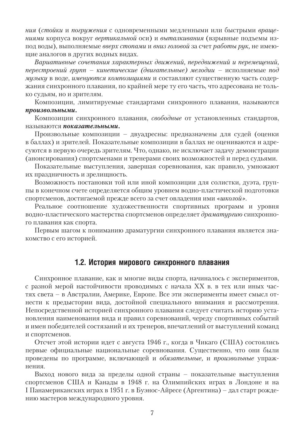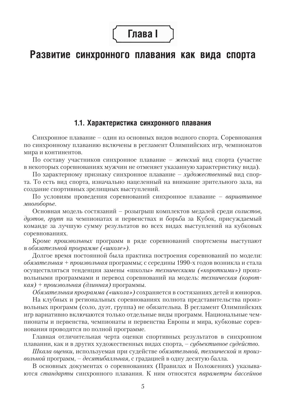 В учебнике рассматриваются: характеристика вида спорта, история синхронного плавания, техника исполнения классификационных фигур и построение произвольных композиций, основы исполнительского мастерства, методика обучения и спортивной тренировки, виды подготовки в синхронном плавании, методика спортивного отбора и система многолетней подготовки спортсменов.