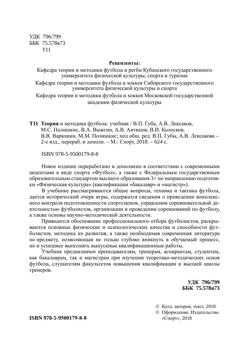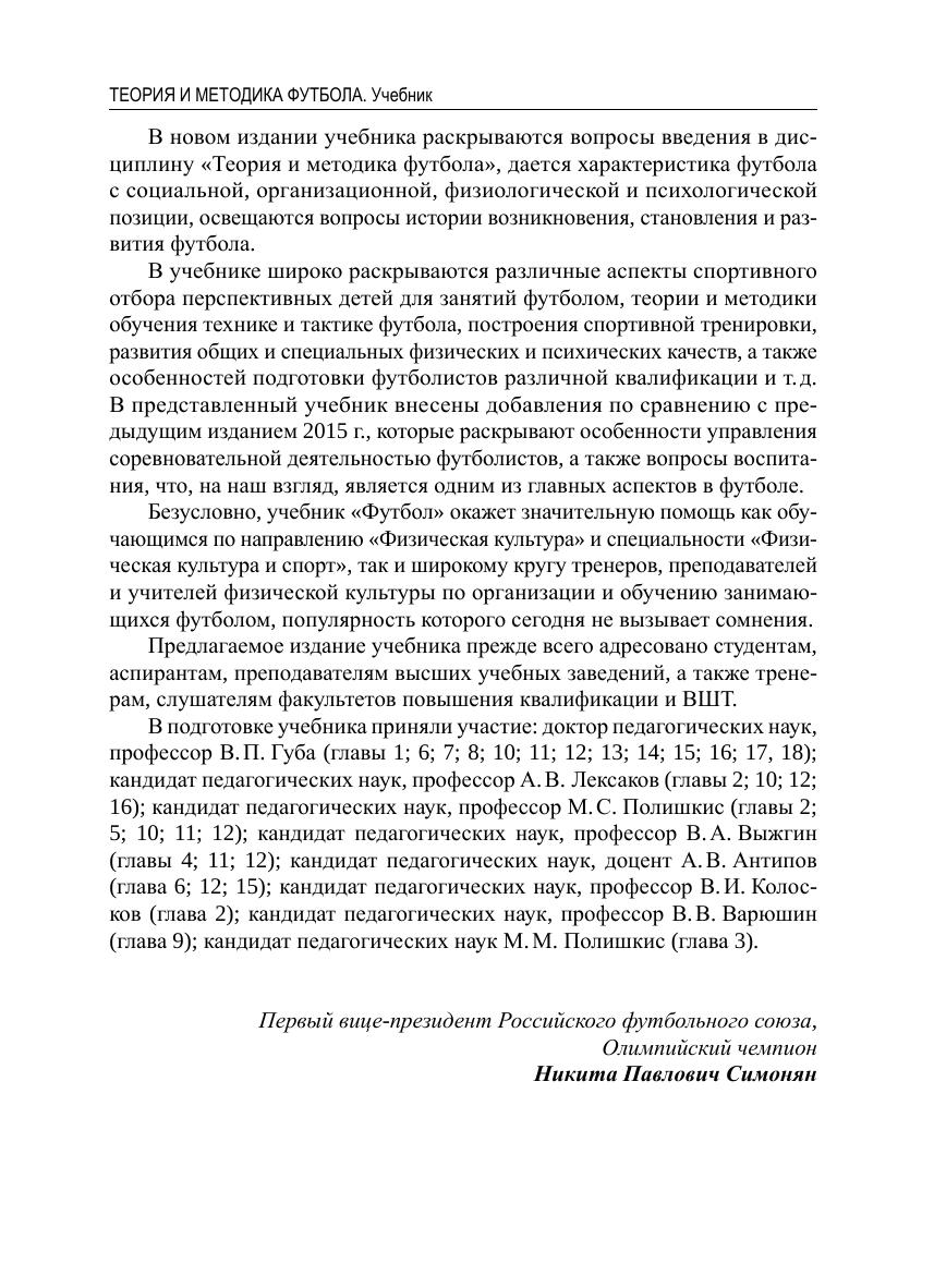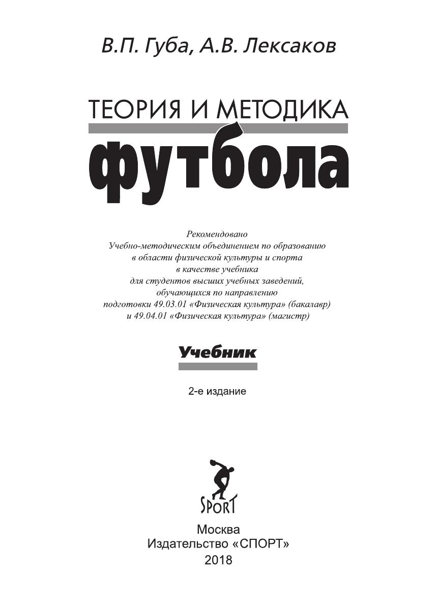 Учебник предназначен преподавателям, тренерам, аспирантам, студентам, как бакалаврам, так и магистрам при изучении теоретико-методических основ футбола, слушателям факультетов повышения квалификации и высшей школы тренеров.