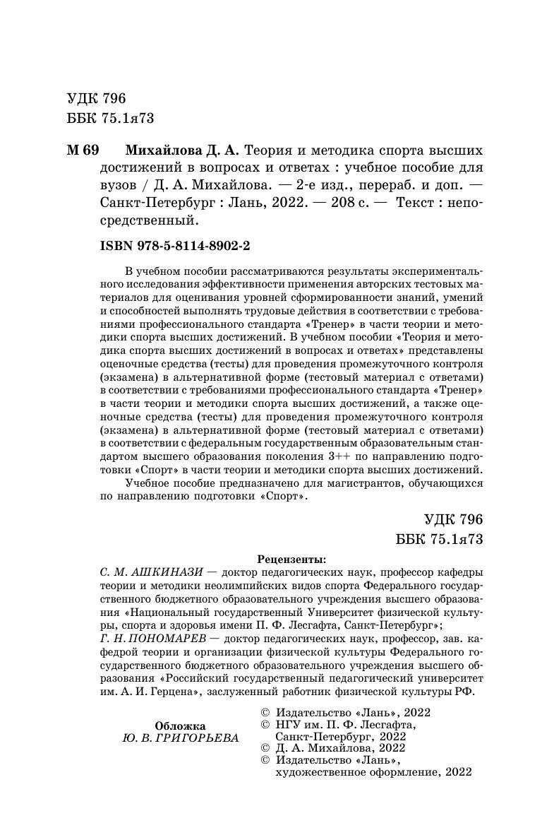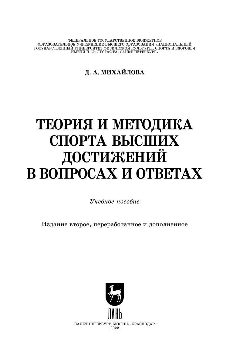 В учебном пособии рассматриваются результаты эксперименталь-ного исследования эффективности применения авторских тестовых ма-териалов для оценивания уровней сформированности знаний, умений и способностей выполнять трудовые действия в соответствии с требова-ниями профессионального стандарта «Тренер» в части теории и мето-дики спорта высших достижений. В учебном пособии «Теория и мето-дика спорта высших достижений в вопросах и ответах» представлены оценочные средства (тесты) для проведения промежуточного контроля (экзамена) в альтернативной форме (тестовый материал с ответами) в соответствии с требованиями профессионального стандарта «Тренер» в части теории и методики спорта высших достижений, а также оце-ночные средства (тесты) для проведения промежуточного контроля (экзамена) в альтернативной форме (тестовый материал с ответами) в соответствии с федеральным государственным образовательным стан-дартом высшего образования поколения 3++ по направлению подго-товки «Спорт» в части теории и методики спорта высших достижений.