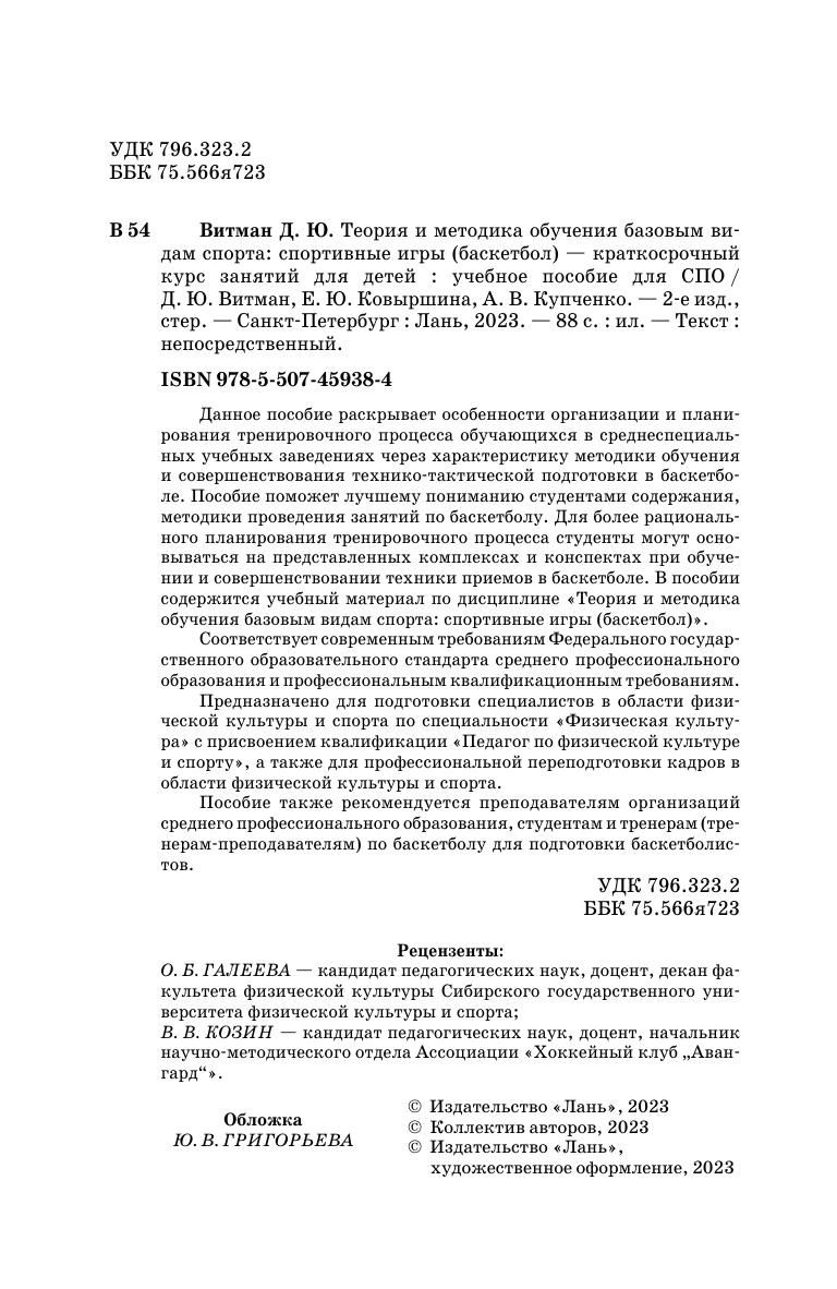 Данное пособие раскрывает особенности организации и планирования тренировочного процесса обучающихся в средне-специальных учебных заведениях через характеристику методики обучения и совершенствования технико-тактической подготовки в баскетболе. Пособие поможет лучшему пониманию студентов содержания, методики проведения занятий по баскетболу. Для более рационального планирования тренировочного процесса студенты могут основываться на представленных комплексах и конспектах при обучении и совершенствовании техники приемов в баскетболе. В пособии содержится учебный материал по дисциплине «Теория и методика обучения базовым видам спорта: спортивные игры (баскетбол)». Соответствует современным требованиям Федерального государственного образовательного стандарта среднего профессионального образования и профессиональным квалификационным требованиям. Предназначено для подготовки специалистов в области физической культуры и спорта по специальности «Физическая культура» с присвоением квалификации «Педагог по физической культуре и спорту», а также для профессиональной переподготовки кадров в области физической культуры и спорта. Пособие также рекомендуется преподавателям организаций среднего профессионального образования, организациям высшего образования, студентами и тренерам (тренерам-преподавателям) по баскетболу для подготовки баскетболистов.