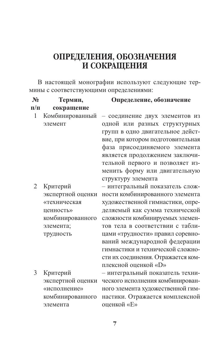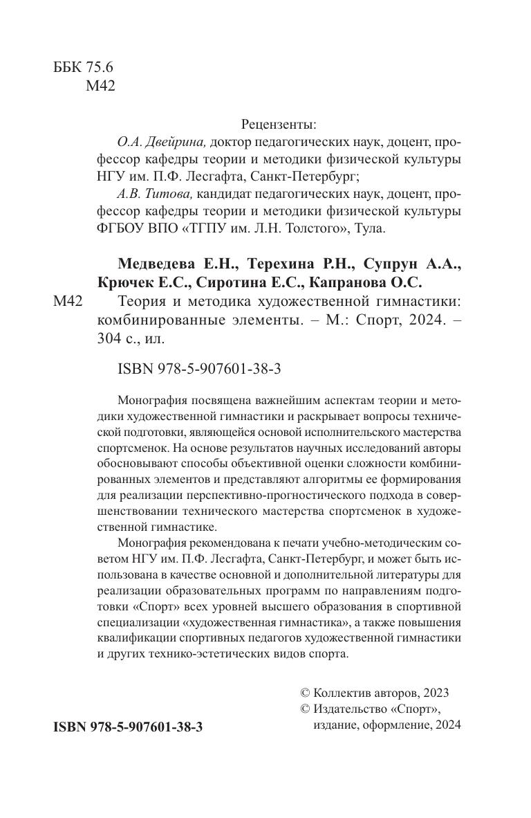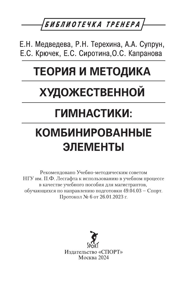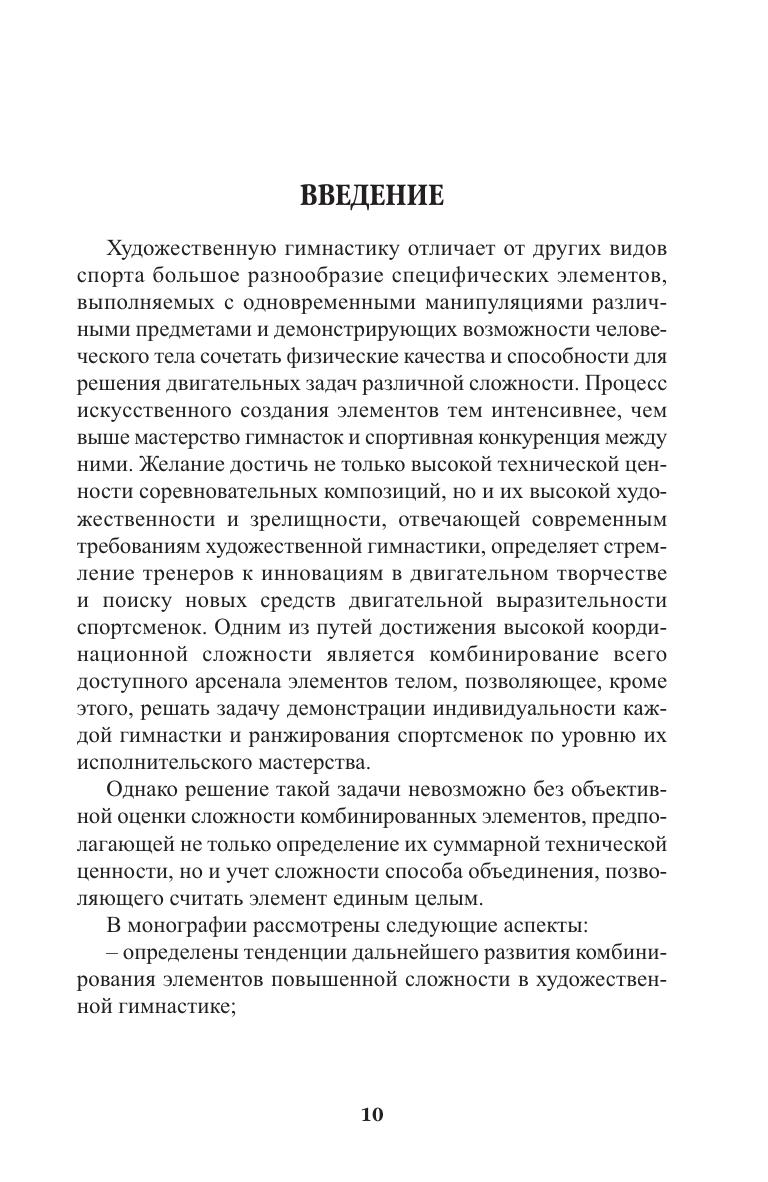 Монография посвящена важнейшим аспектам теории и методики художественной гимнастики и раскрывает вопросы технической подготовки, являющейся основой исполнительского мастерства спортсменок. На основе результатов научных исследований авторы обосновывают способы объективной оценки сложности комбинированных элементов и представляют алгоритмы ее формирования для реализации перспективно-прогностического подхода в совершенствовании технического мастерства спортсменок в художественной гимнастике. Монография рекомендована к печати учебно-методическим советом НГУ им. П.Ф. Лесгафта, Санкт-Петербург, и может быть использована в качестве основной и дополнительной литературы для