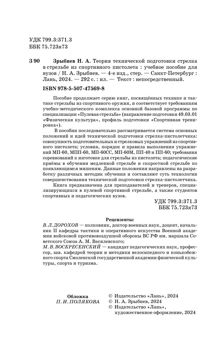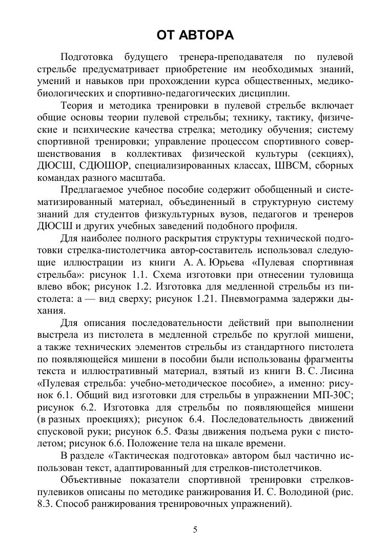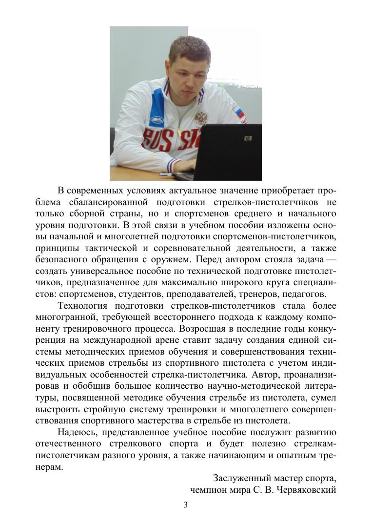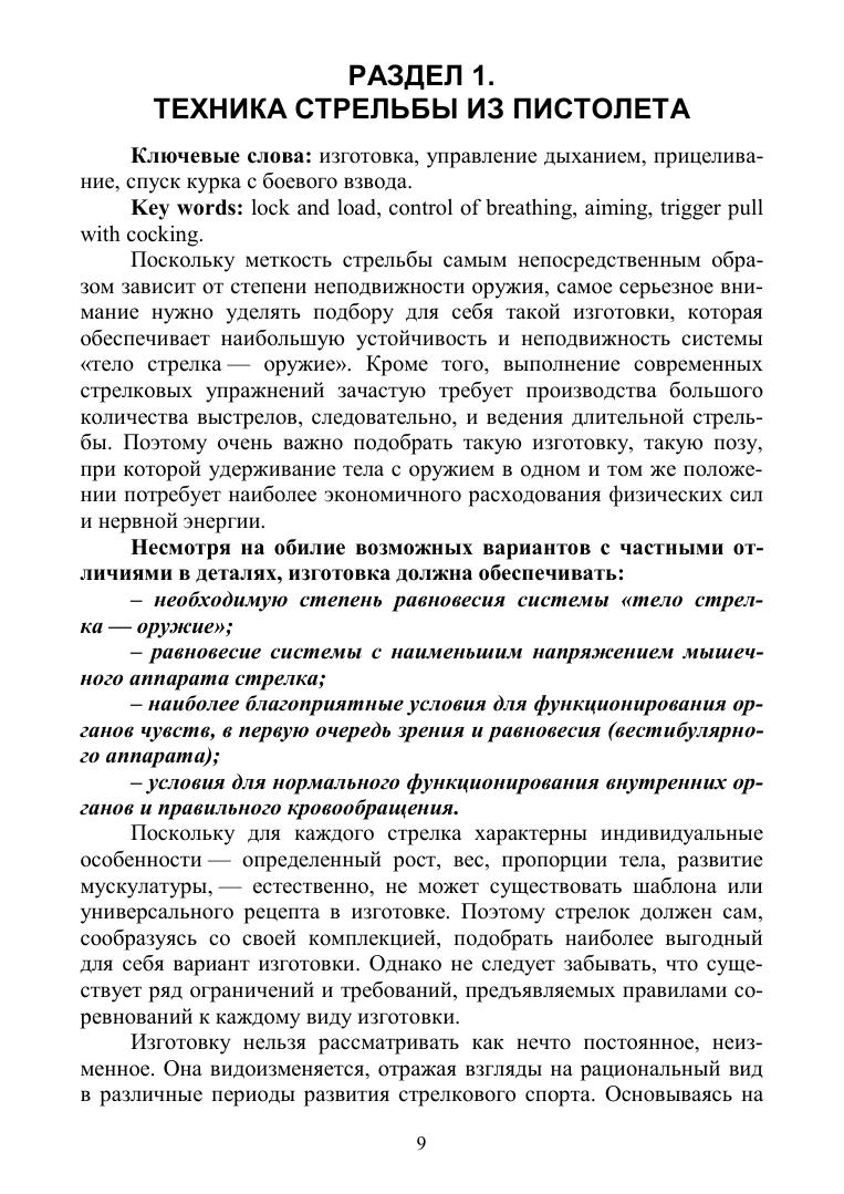 Пособие продолжает серию книг, посвящённых технике и тактике стрельбы из спортивного оружия, и соответствует требованиям Учебно-методического комплекса основной базовой программы по специализации «Пулевая стрельба» (направление подготовки 49.03.01 «Физическая культура», профиль подготовки «Спортивная тренировка»).В пособии последовательно рассматривается система основных положений и идей технической подготовки стрелка-пистолетчика: совокупность подготовительных и стрелковых упражнений из спортивного пистолета, условия, порядок и правила выполнения упражнений МП-60, МПП-60, МП-60СС, МП-60М, ПП-40 и ПП-60, требования соревнований к изготовке для стрельбы из пистолета, педагогические приёмы в обучении медленной стрельбе и скоростной стрельбе по появляющимся мишеням. Данные положения направлены на разработку различных методик обучения и составляют суть технологии совершенствования технической подготовки стрелка-пистолетчика.Книга предназначена для преподавателей и тренеров, специализирующихся в пулевой спортивной стрельбе, а также студентов спортивных и педагогических вузов.