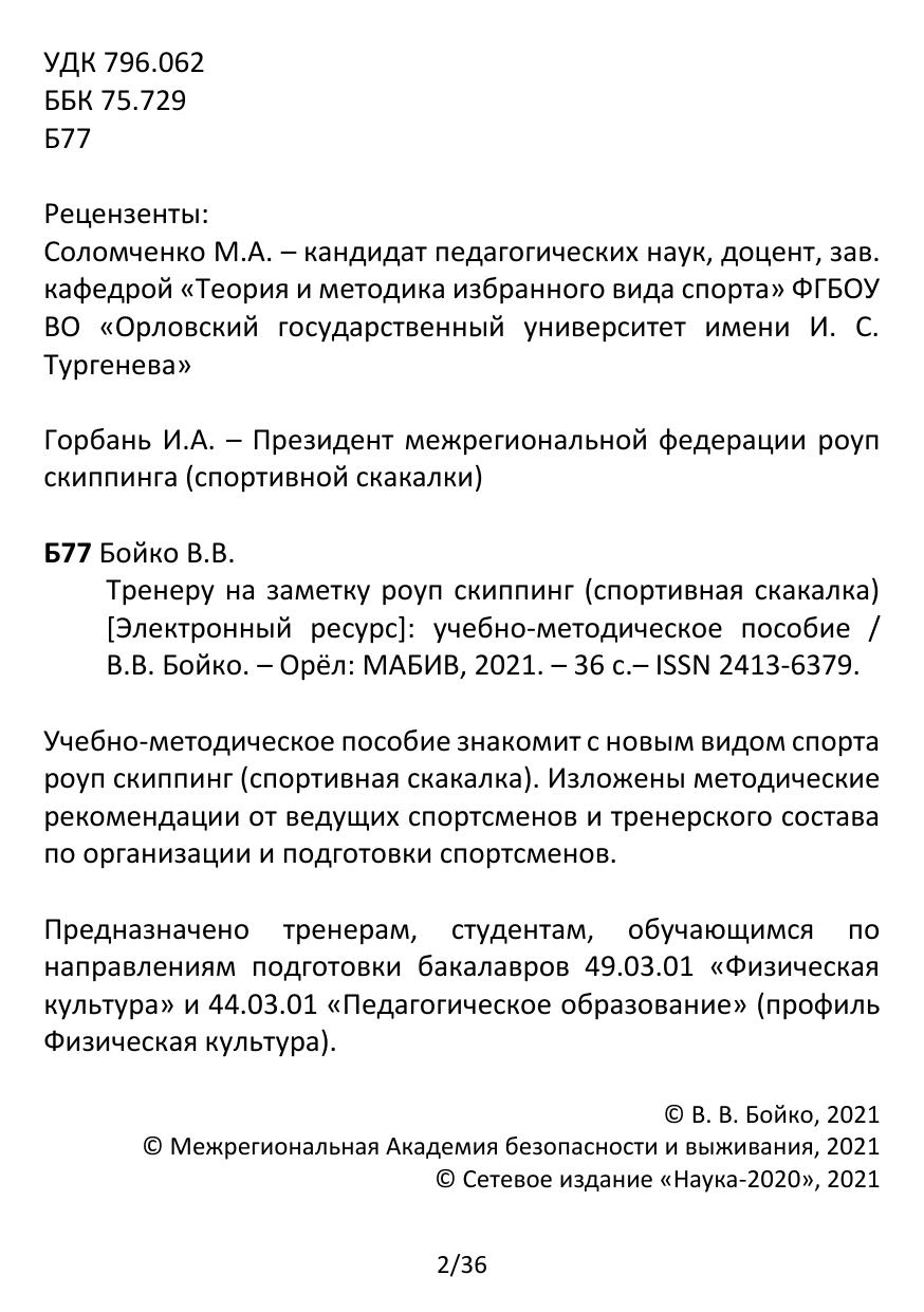 Учебно-методическое пособие знакомит с новым видом спорта роуп скиппинг (спортивная скакалка). Изложены методические рекомендации от ведущих спортсменов и тренерского состава по организации и подготовки спортсменов. Предназначено тренерам, студентам, обучающимся по направлениям подготовки бакалавров 49.03.01 «Физическая культура» и 44.03.01 «Педагогическое образование» (профиль Физическая культура).