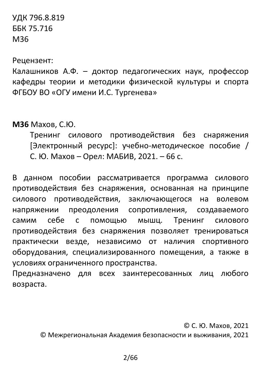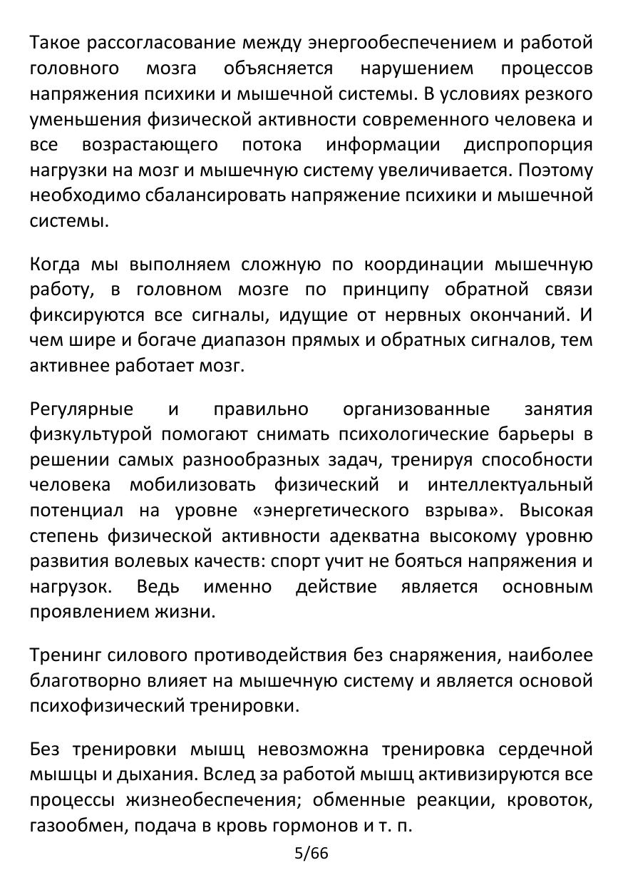 В данном пособии рассматривается программа силового противодействия без снаряжения, основанная на принципе силового противодействия, заключающегося на волевом напряжении преодоления сопротивления, создаваемого самим себе с помощью мышц. Тренинг силового противодействия без снаряжения позволяет тренироваться практически везде, независимо от наличия спортивного оборудования, специализированного помещения, а также в условиях ограниченного пространства. Предназначено для всех заинтересованных лиц любого возраста.