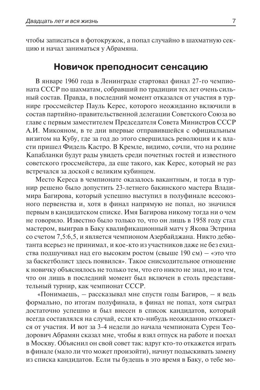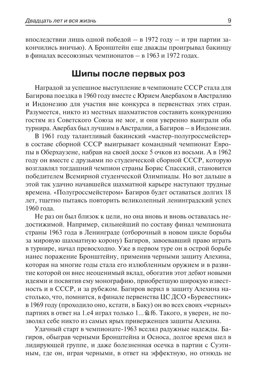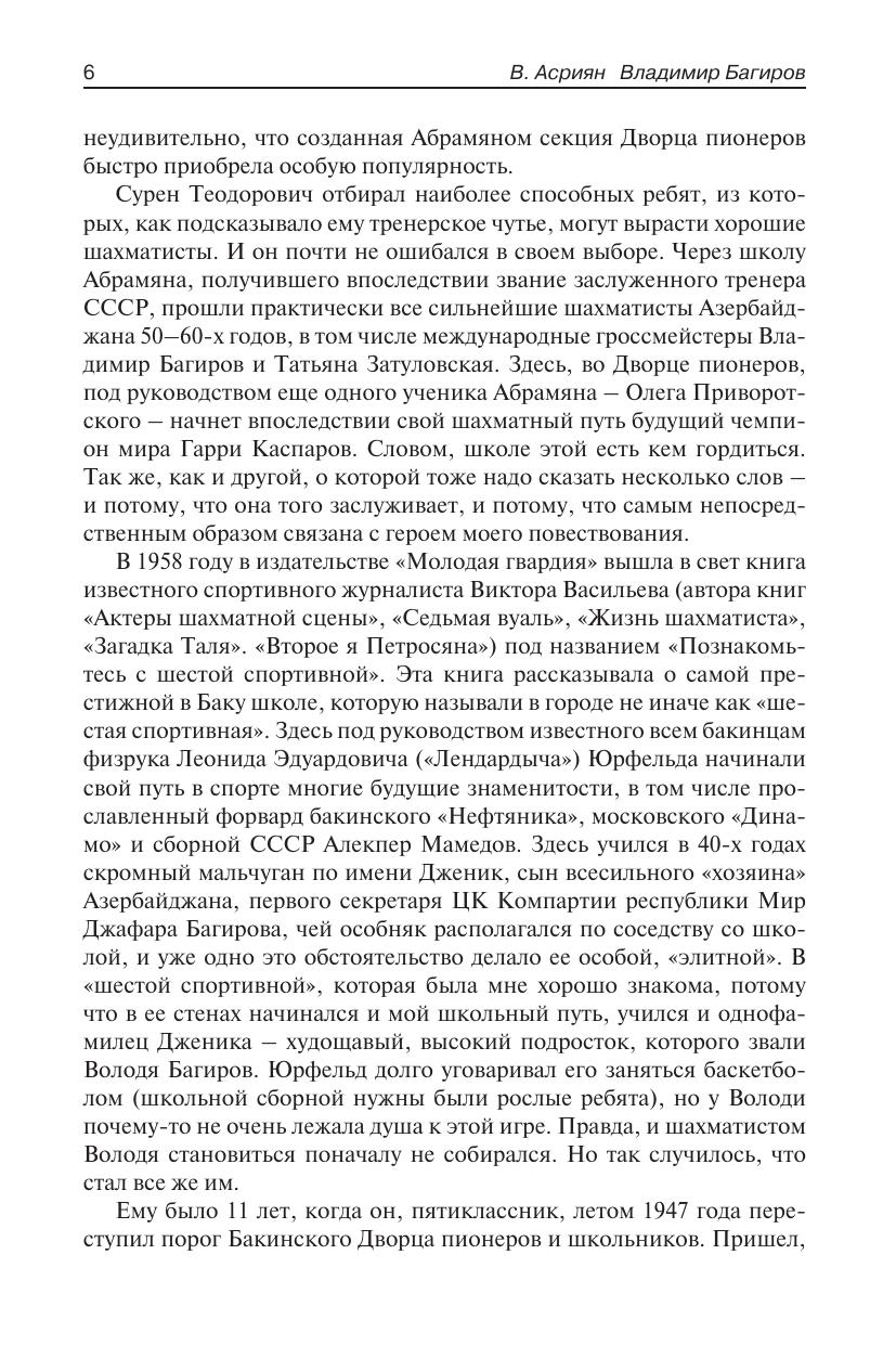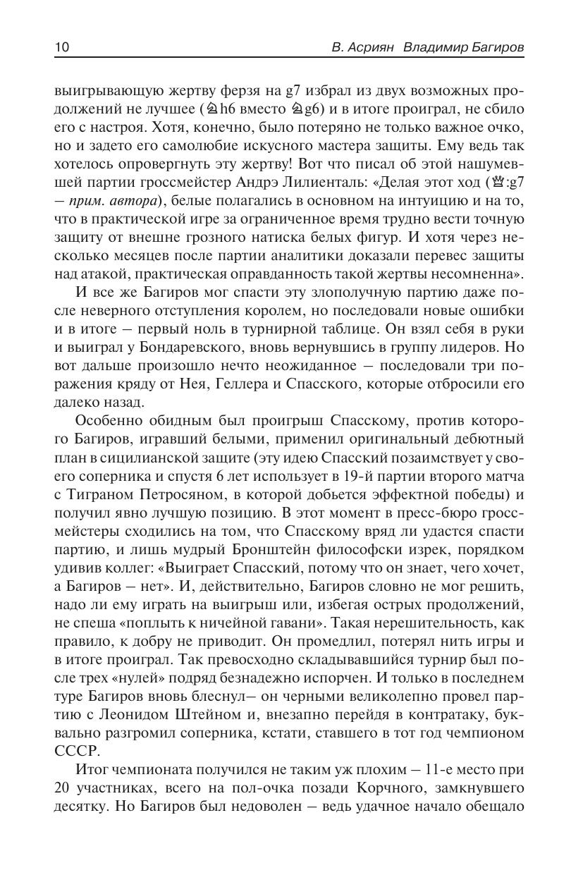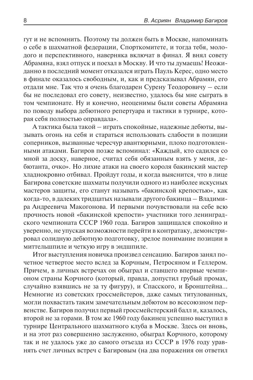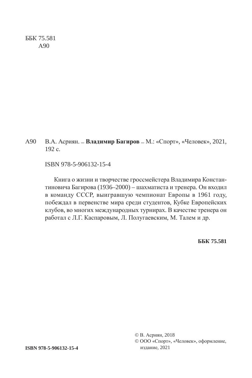 Книга о жизни и творчестве гроссмейстера Владимира Константиновича Багирова (1936–2000) – шахматиста и тренера. Он входил в команду СССР, выигравшую чемпионат Европы в 1961 году, побеждал в первенстве мира среди студентов, Кубке Европейских клубов, во многих международных турнирах. В качестве тренера он работал с Л.Г. Каспаровым, Л. Полугаевским, М. Талем и др.