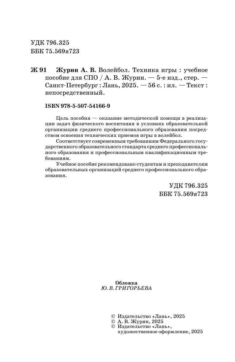 Цель пособия — оказание методической помощи в реализации волейбола как средства физического воспитания в условиях образовательной организации, посредством освоения арсенала технических приемов игры в нападении и защите. Соответствует современным требованиям Федерального государственного образовательного стандарта среднего профессионального образования и профессиональным квалификационным требованиям. Учебное пособие рекомендовано студентам колледжей, изучающим технику игры в волейбол.