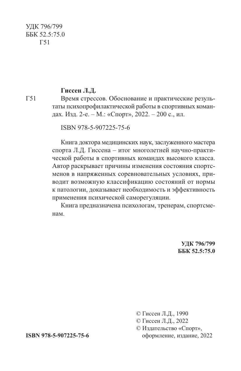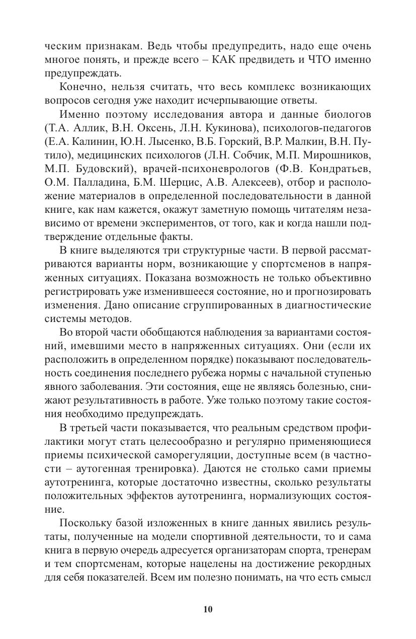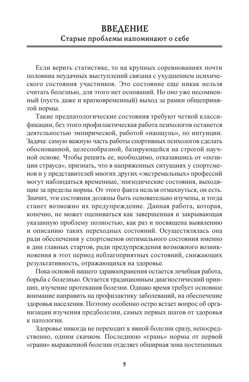 Книга доктора медицинских наук, заслуженного мастера спорта Л.Д. Гиссена – итог многолетней научно-практической работы в спортивных командах высокого класса. Автор раскрывает причины изменения состояния спортсменов в напряженных соревновательных условиях, приводит возможную классификацию состояний от нормы к патологии, доказывает необходимость и эффективность применения психической саморегуляции. Книга предназначена психологам, тренерам, спортсменам.