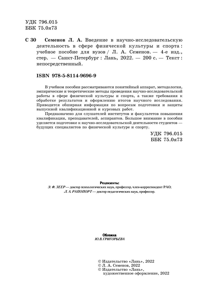 В учебном пособии рассматриваются понятийный аппарат, методология, эмпирические и теоретические методы проведения научно-исследовательской работы в сфере физической культуры и спорта, а также требования к обработке результатов и оформлению итогов научного исследования. Приводится обширная информация по вопросам подготовки и защиты выпускной квалификационной и курсовых работ.