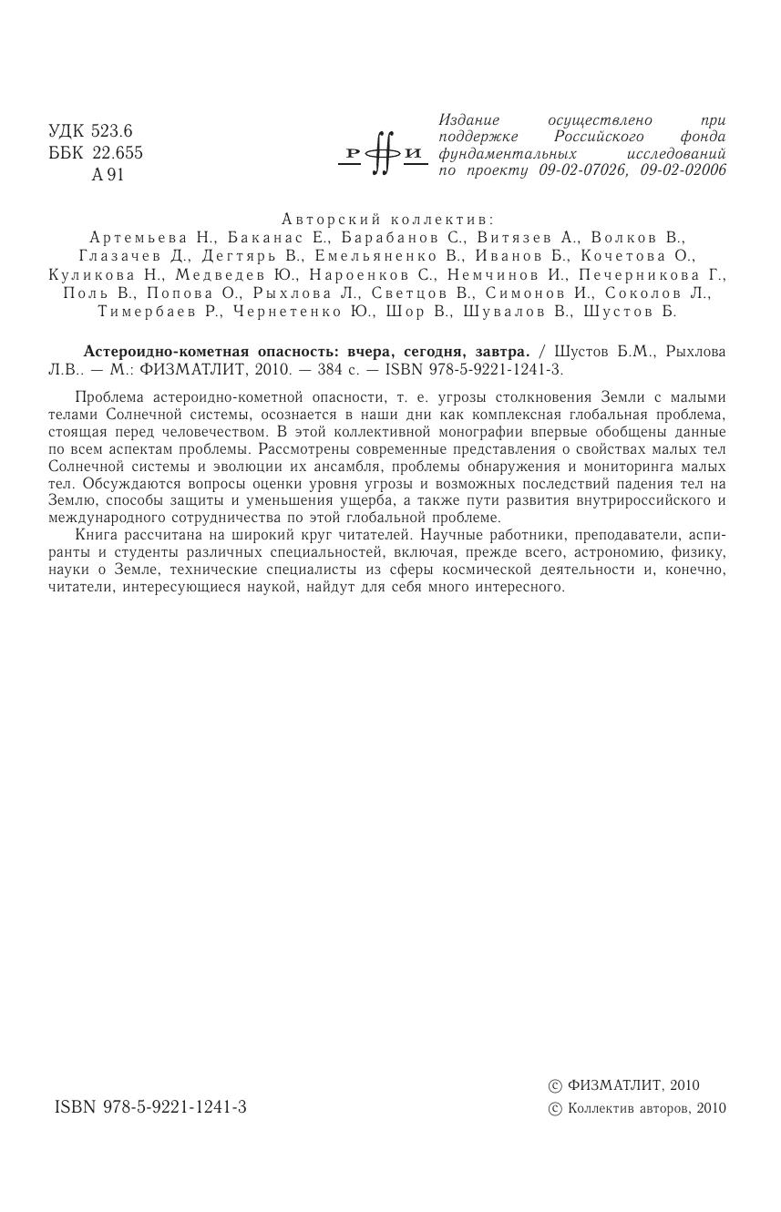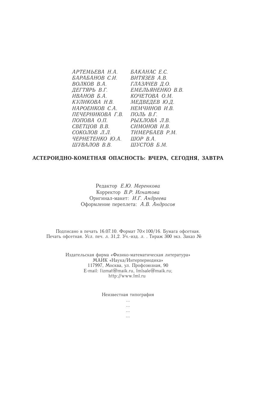 Проблема астероидно-кометной опасности, т. е. угрозы столкновения Земли с малыми телами Солнечной системы, осознается в наши дни как комплексная глобальная проблема, стоящая перед человечеством. В этой коллективной монографии впервые обобщены данные по всем аспектам проблемы. Рассмотрены современные представления о свойствах малых тел Солнечной системы и эволюции их ансамбля, проблемы обнаружения и мониторинга малых тел. Обсуждаются вопросы оценки уровня угрозы и возможных последствий падения тел на Землю, способы защиты и уменьшения ущерба, а также пути развития внутрироссийского и международного сотрудничества по этой глобальной проблеме.Книга рассчитана на широкий круг читателей. Научные работники, преподаватели, аспиранты и студенты различных специальностей, включая, прежде всего, астрономию, физику, науки о Земле, технические специалисты из сферы космической деятельности и, конечно, читатели, интересующиеся наукой, найдут для себя много интересного.