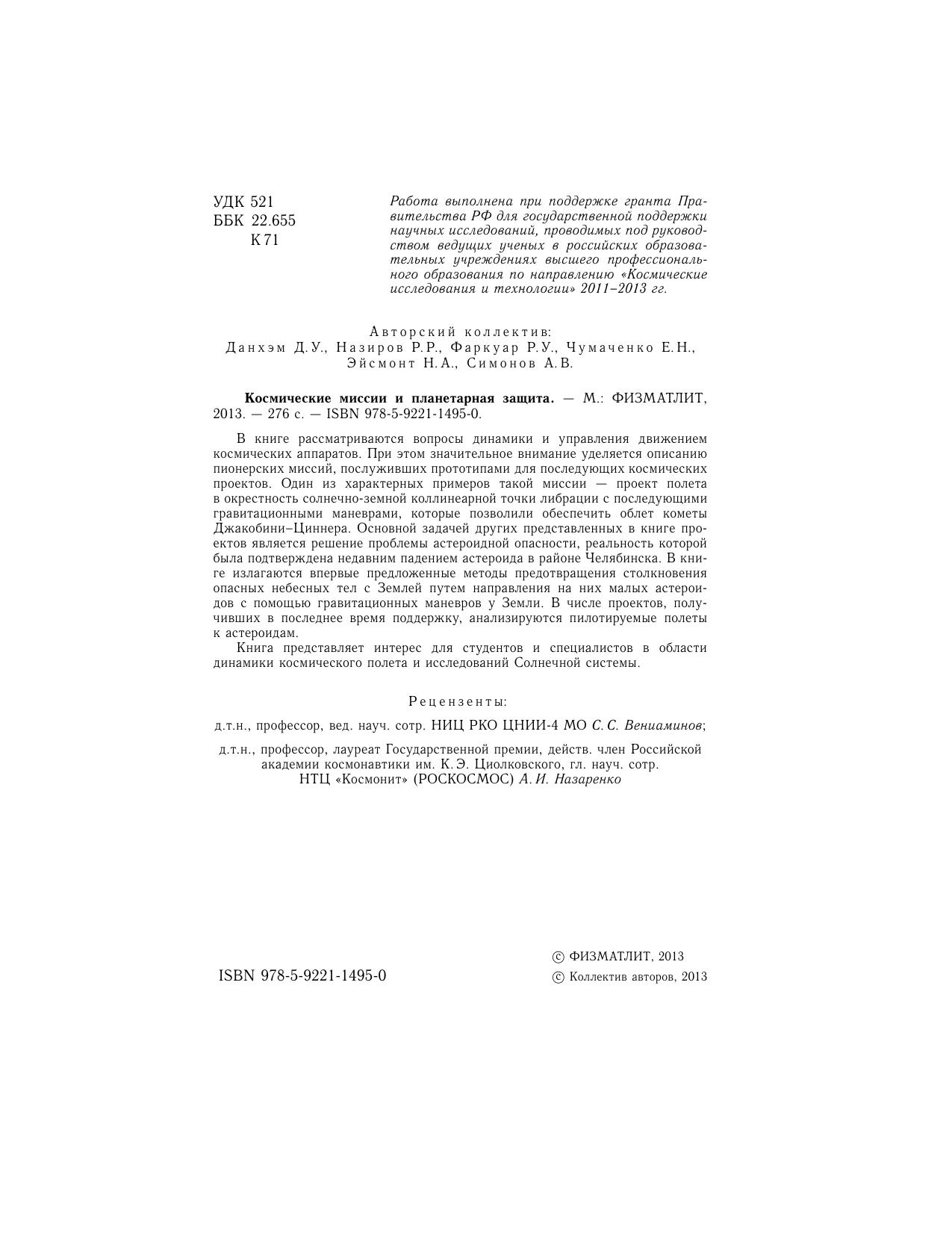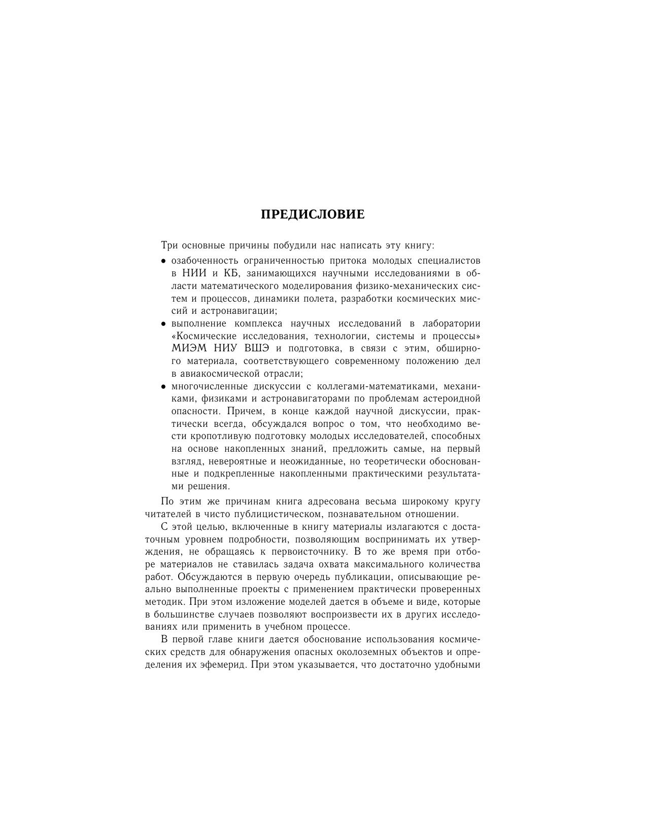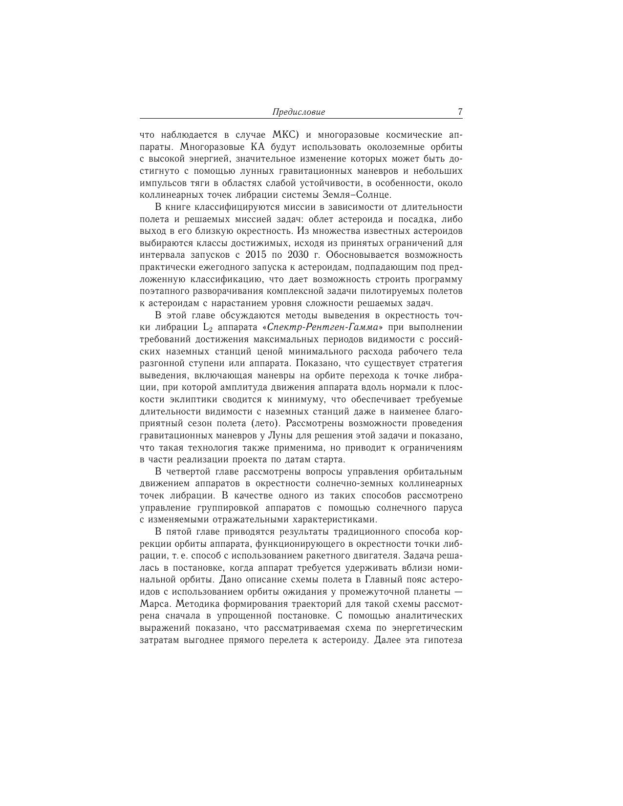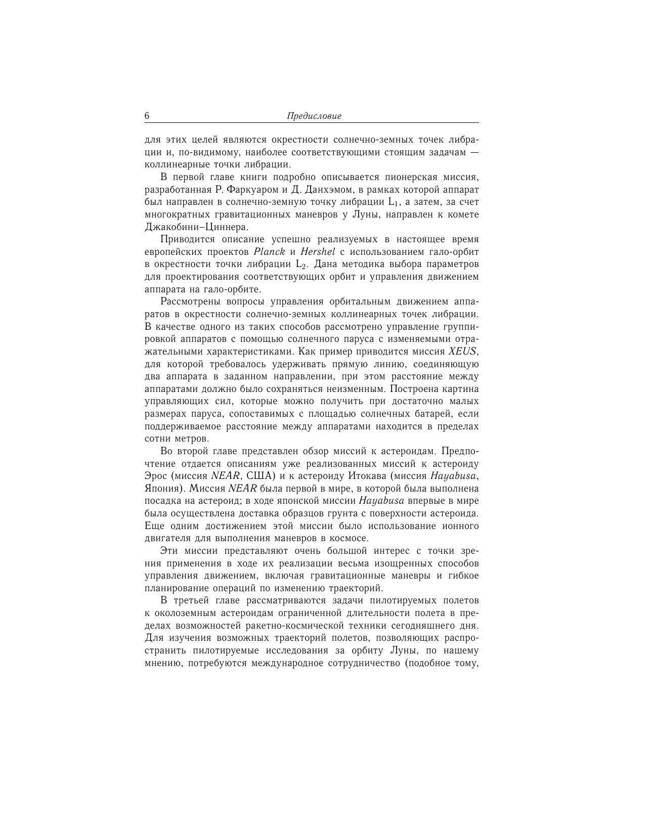 В книге рассматриваются вопросы динамики и управления движением космических аппаратов. При этом значительное внимание уделяется описанию пионерских миссий, послуживших прототипами для последующих космических проектов. Один из характерных примеров такой миссии — проект полета в окрестность солнечно-земной коллинеарной точки либрации с последующими гравитационными маневрами, которые позволили обеспечить облет кометы Джакобини–Циннера. Основной задачей других представленных в книге проектов является решение проблемы астероидной опасности, реальность которой была подтверждена недавним падением астероида в районе Челябинска. В книге излагаются впервые предложенные методы предотвращения столкновения опасных небесных тел с Землей путем направления на них малых астероидов с помощью гравитационных маневров у Земли. В числе проектов, получивших в последнее время поддержку, анализируются пилотируемые полеты к астероидам.