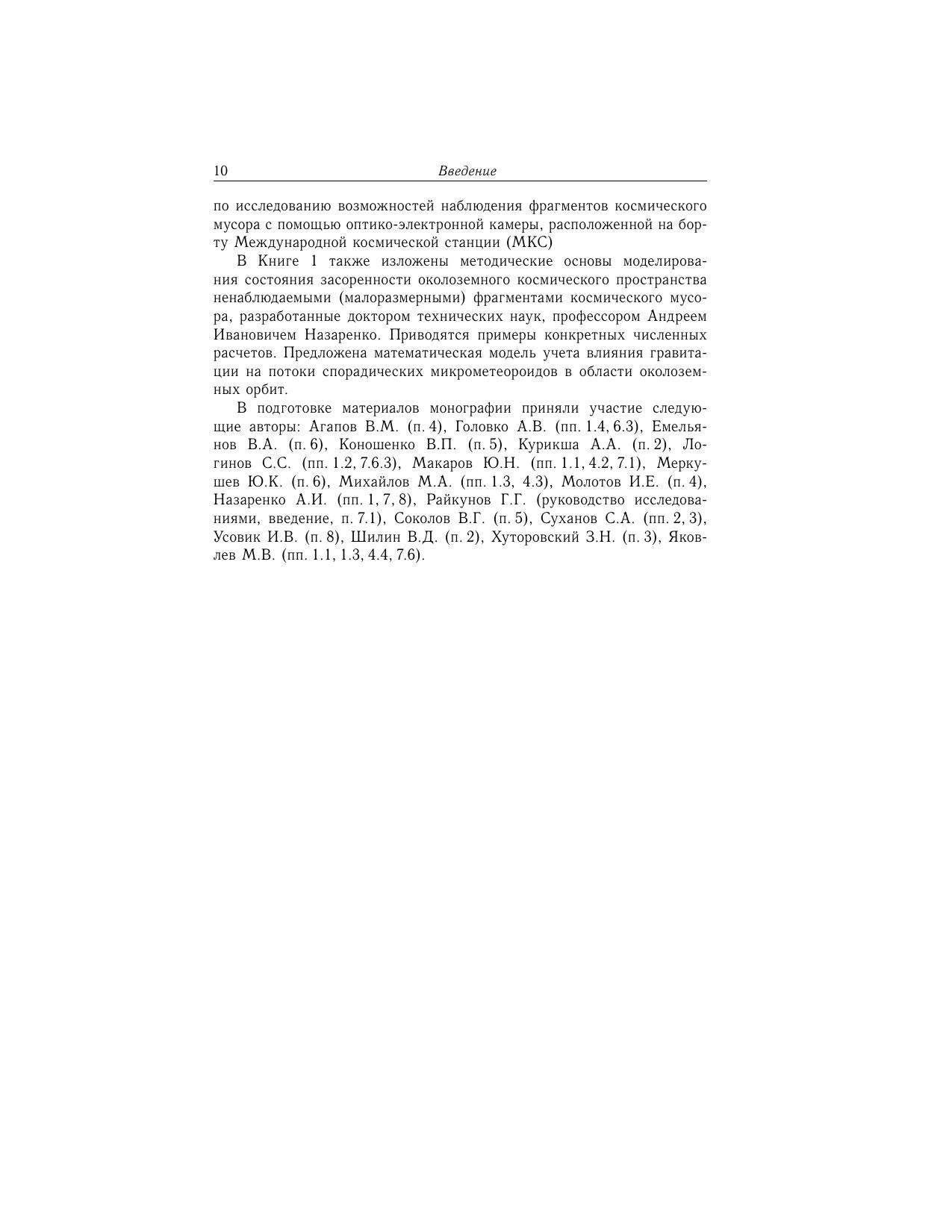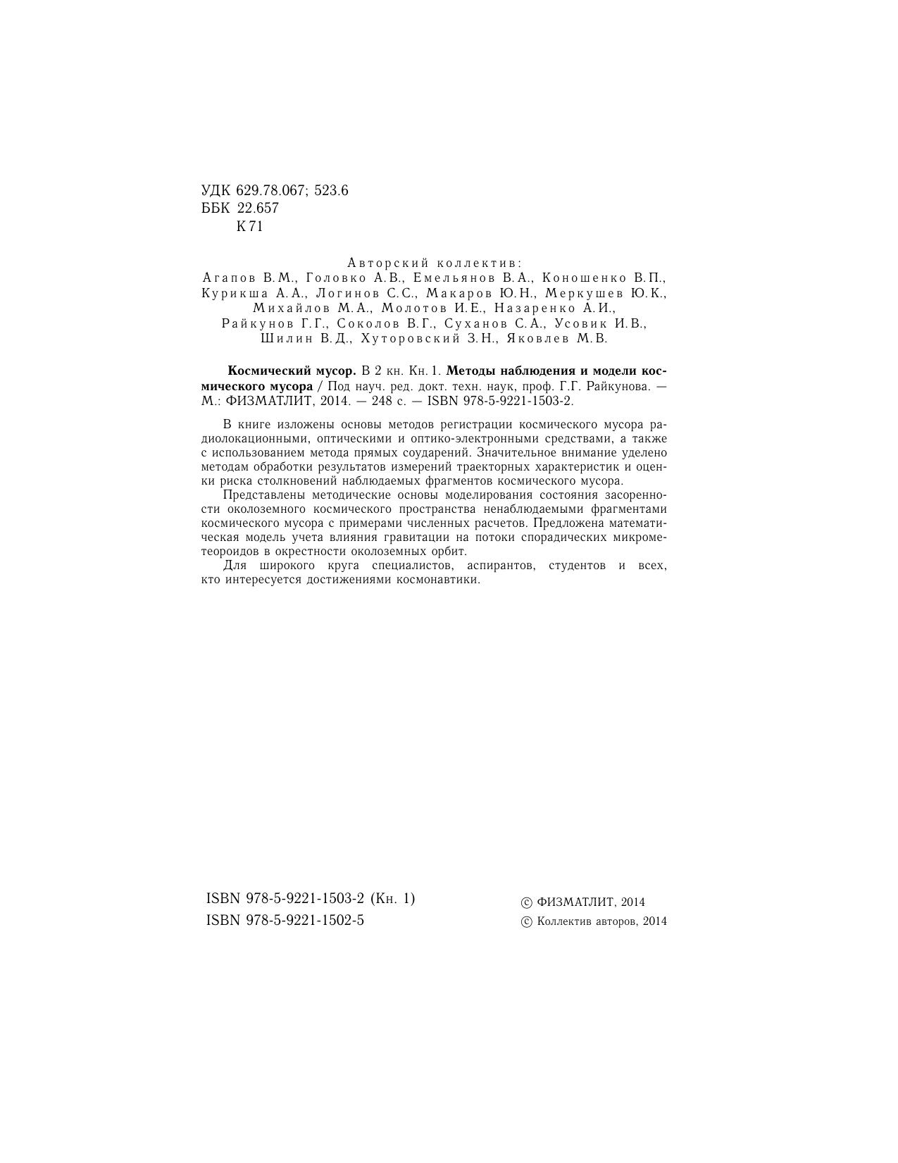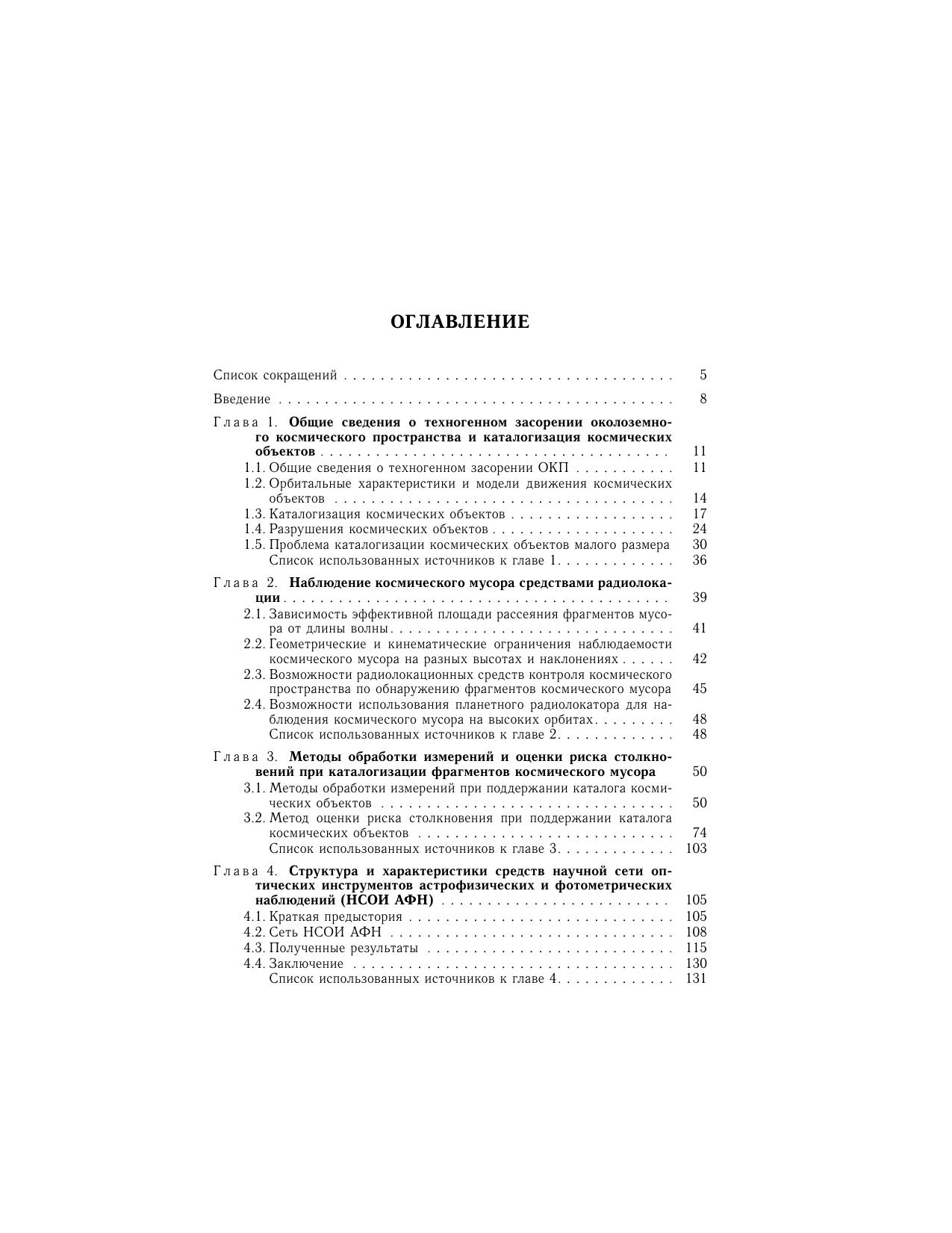 В книге изложены основы методов регистрации космического мусора радиолокационными, оптическими и оптико-электронными средствами, а также с использованием метода прямых соударений. Значительное внимание уделено методам обработки результатов измерений траекторных характеристик и оценки риска столкновений наблюдаемых фрагментов космического мусора. Представлены методические основы моделирования состояния засоренности околоземного космического пространства ненаблюдаемыми фрагментами космического мусора с примерами численных расчетов. Предложена математическая модель учета влияния гравитации на потоки спорадических микрометеороидов в окрестности околоземных орбит. Для широкого круга специалистов, аспирантов, студентов и всех, кто интересуется достижениями космонавтики.