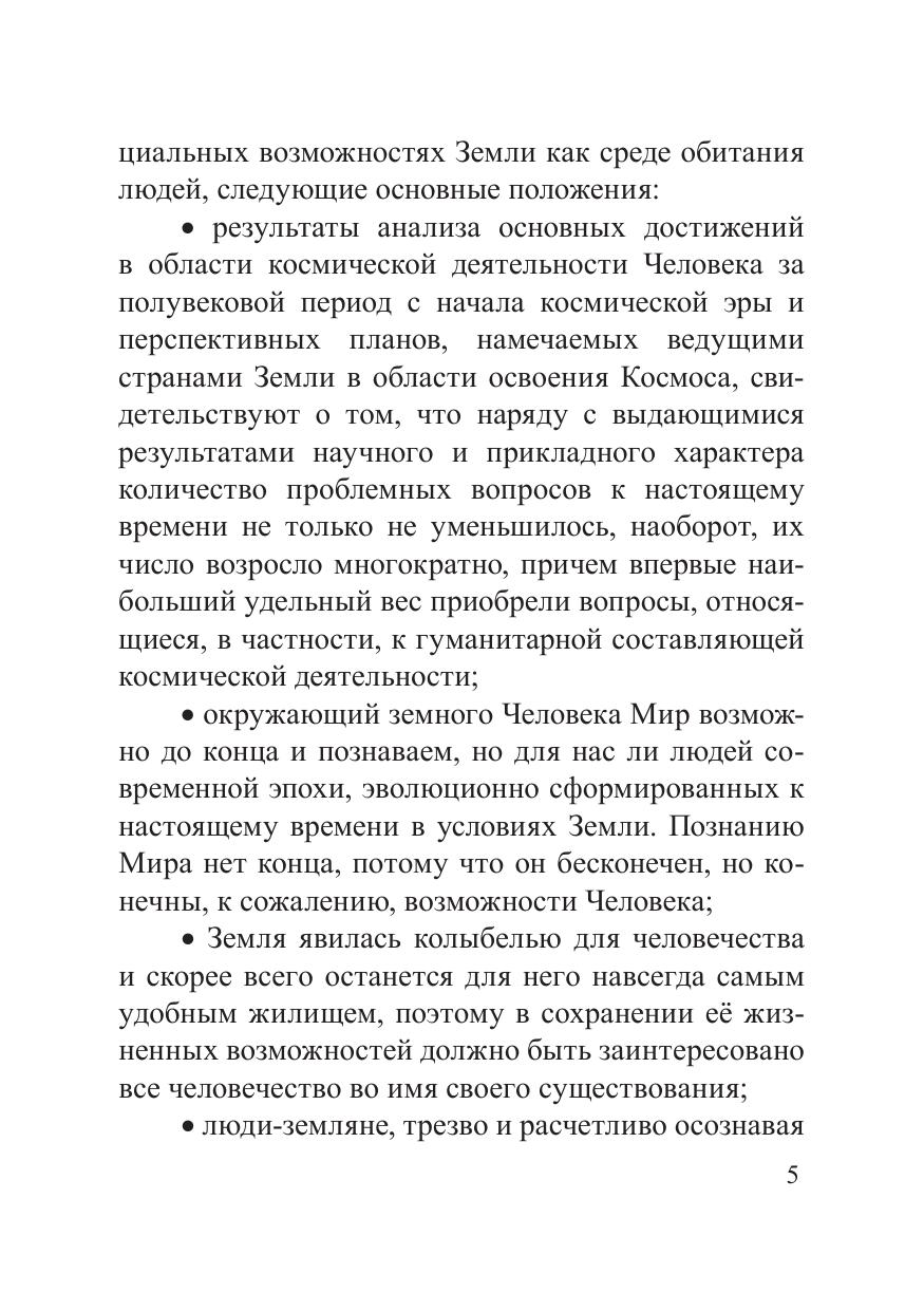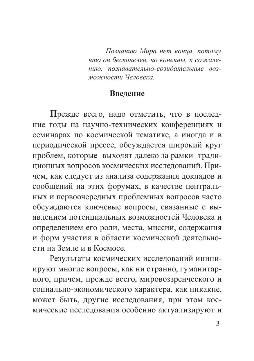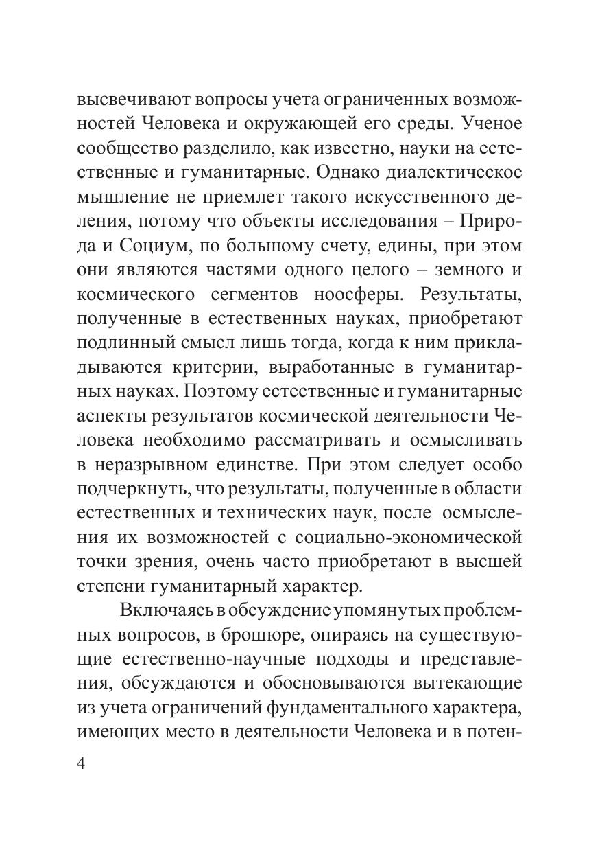 Ставятся и обсуждаются вопросы главным образом гуманитарного характера, вытекающие из анализа результатов космической деятельности, полученных за истекшие 50 лет с начала космической эры. Высказываются соображения и обсуждаются вопросы, связанные с ограниченностью ресурсов Земли и возможностей Человека, а также выясняется исключительно важная роль ограничений фундаментального характера, определяющих по существу границы возможностей людей в познавательной и созидательной деятельности. В качестве выхода из создавшейся ситуации с целью обеспечения устойчивого социально-экономического развития человеческого общества высказываются предложения о переходе к космическому мышлению, элементы которого формулируются в брошюре, и к соответствующим принципам практической деятельности людей и государств.