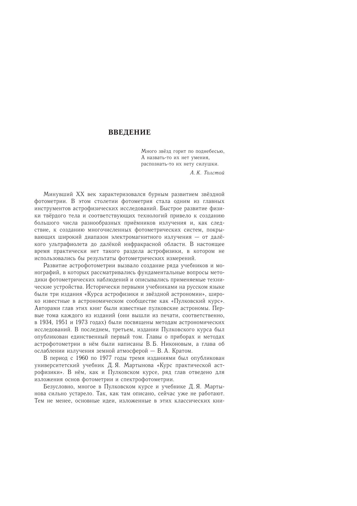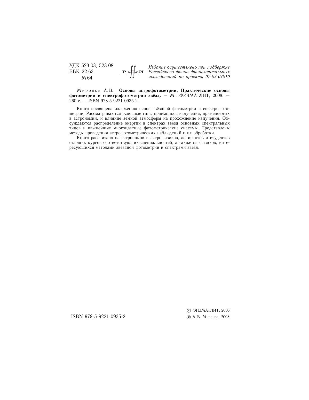 Книга посвящена изложению основ зв"ездной фотометрии и спектрофотометрии. Рассматриваются основные типы приемников излучения, применяемых в астрономии, и влияние земной атмосферы на прохождение излучения. Обсуждаются распределение энергии в спектрах звезд основных спектральных типов и важнейшие многоцветные фотометрические системы. Представлены методы проведения астрофотометрических наблюдений и их обработки. Книга рассчитана на астрономов и астрофизиков, аспирантов и студентов старших курсов соответствующих специальностей, а также на физиков, интересующихся методами зв"ездной фотометрии и в спектрами звезд.