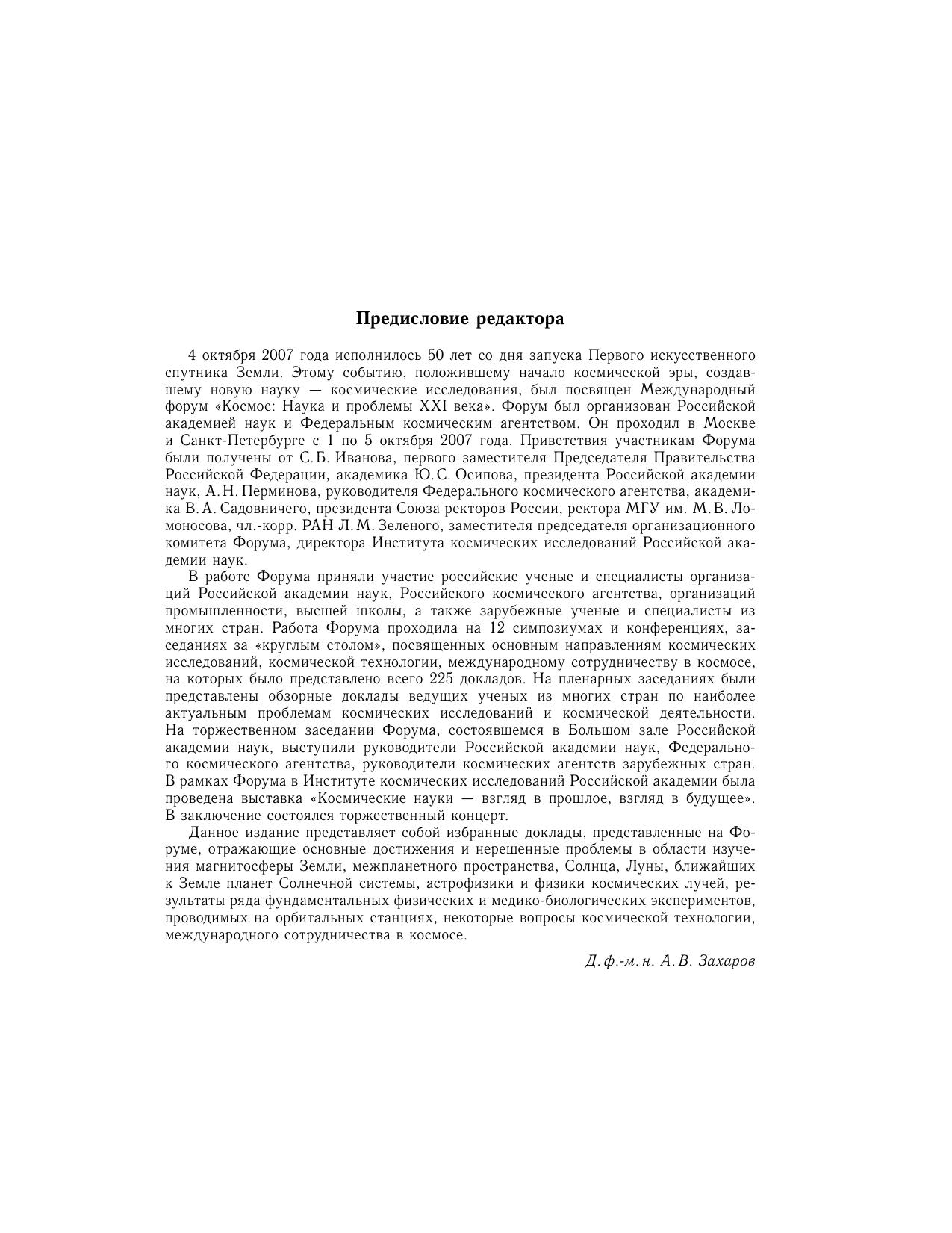 Сборник статей посвящен наиболее важным результатам первых пятидесяти лет фундаментальных космических исследований, начавшихся после запуска Первого искусственного спутника Земли в 1957 г. Сборник составляют статьи, основанные на избранных докладах торжественного и пленарных заседаний Международного форума <<Космос: наука и проблемы XXI века>> (Москва, 1--5 октября 2007г.), а также оригинальные работы. Авторы рассматривают основные достижения и нерешенные проблемы в области изучения земной магнитосферы, межпланетного пространства, Солнца, Луны, ближайших к Земле планет Солнечной системы, астрофизики и физики космических лучей, а также результаты ряда фундаментальных физических и медико-биологических экспериментов, проводимых на орбитальных станциях. Для широкого круга ученых, аспирантов и~студентов, специализирующихся в области космической физики.