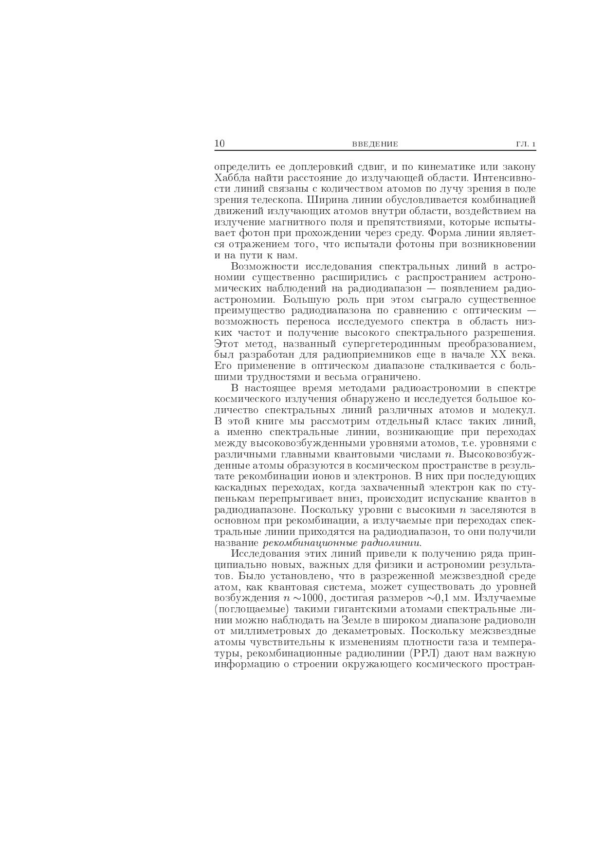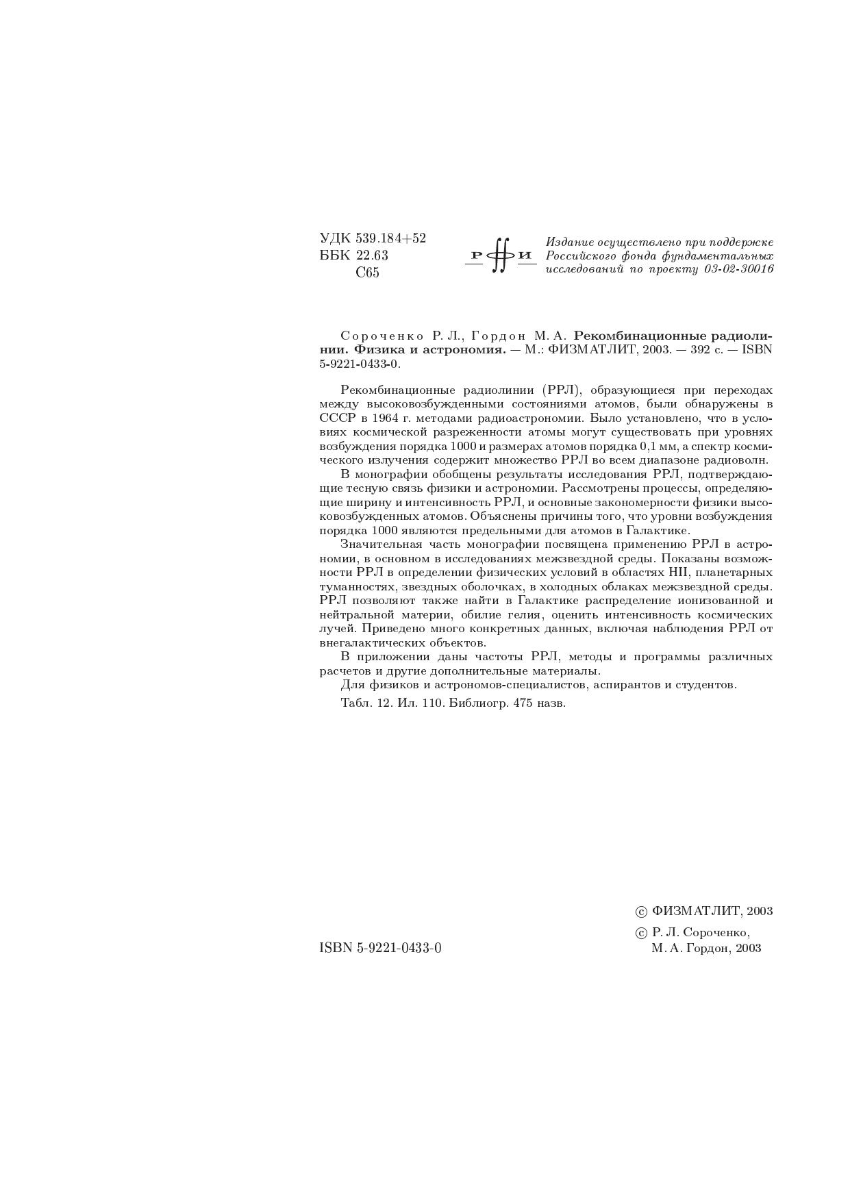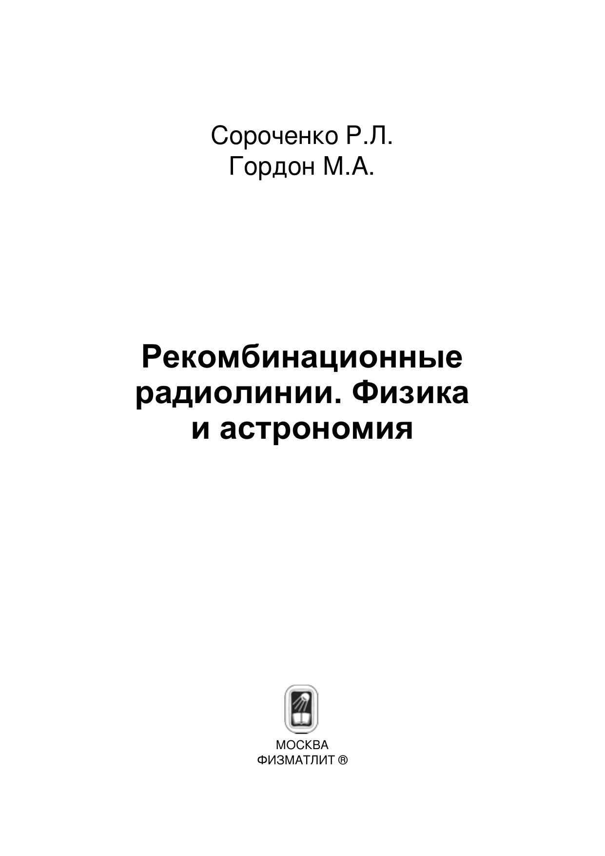 Рекомбинационные радиолинии (РРЛ), образующиеся при переходах между высоковозбужденными состояниями атомов, были обнаружены в СССР в 1964 г. методами радиоастрономии. Было установлено, что в условиях космической разреженности атомы могут существовать при уровнях возбуждения порядка 1000 и размерах атомов порядка 0,1 мм, а спектр космического излучения содержит множество РРЛ во всем диапазоне радиоволн. В монографии обобщены результаты исследования РРЛ, подтверждающие тесную связь физики и астрономии. Рассмотрены процессы, определяющие ширину и интенсивность РРЛ, и основные закономерности физики высоковозбужденных атомов. Объяснены причины того, что уровни возбуждения порядка 1000 являются предельными для атомов в Галактике. Значительная часть монографии посвящена применению РРЛ в астрономии, в основном в исследованиях межзвездной среды. Показаны возможности РРЛ в определении физических условий в областях HII, планетарных туманностях, звездных оболочках, в холодных облаках межзвездной среды. РРЛ позволяют также найти в Галактике распределение ионизованной и нейтральной материи, обилие гелия, оценить интенсивность космических лучей. Приведено много конкретных данных, включая наблюдения РРЛ от внегалактических объектов. В приложении даны частоты РРЛ, методы и программы различных расчетов и другие дополнительные материалы. Для физиков и астрономов-специалистов, аспирантов и студентов