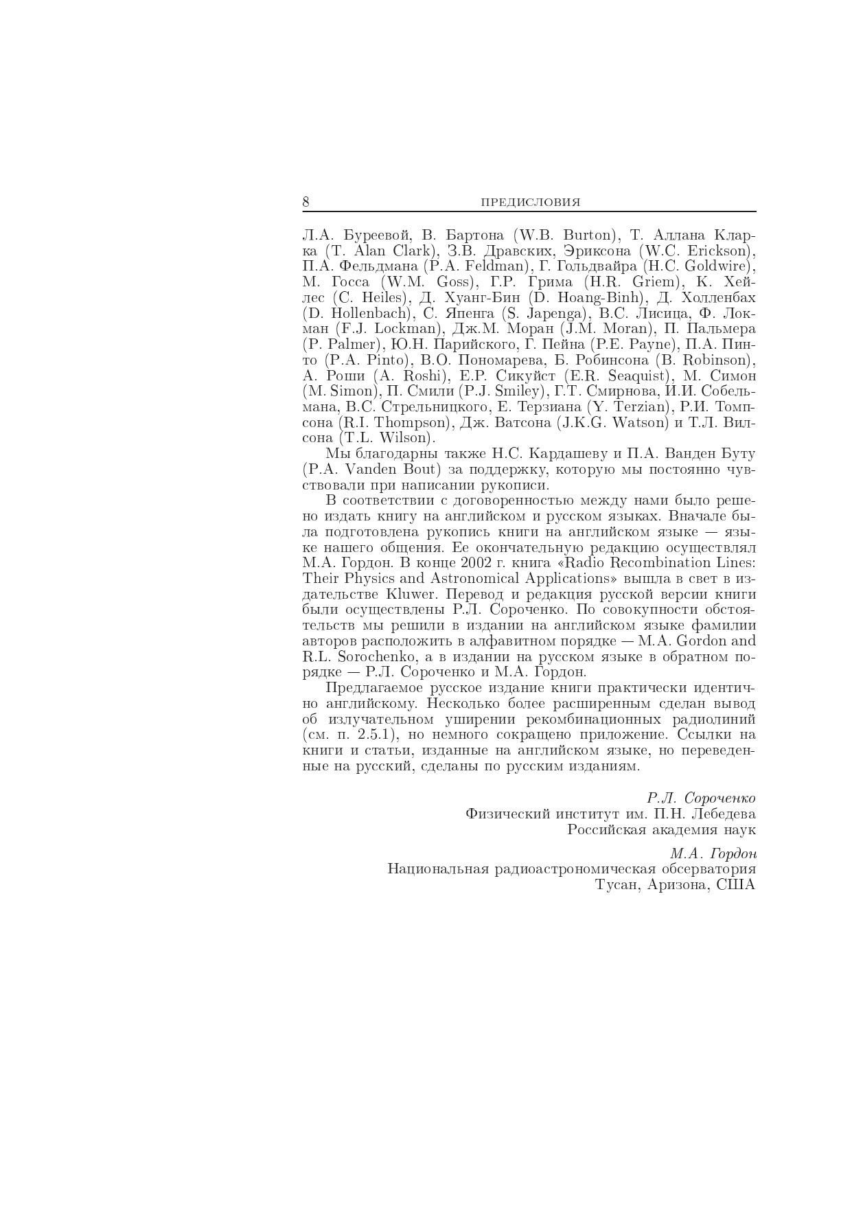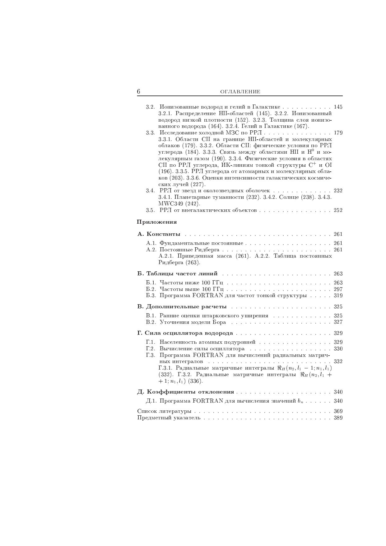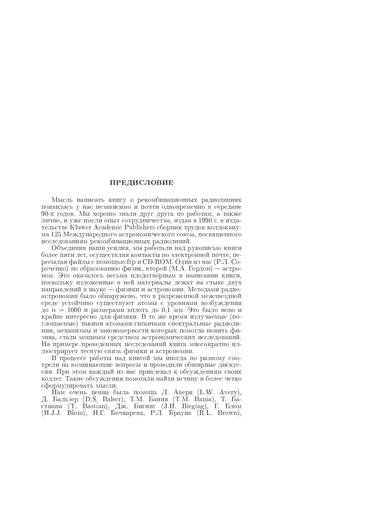 Рекомбинационные радиолинии (РРЛ), образующиеся при переходах между высоковозбужденными состояниями атомов, были обнаружены в СССР в 1964 г. методами радиоастрономии. Было установлено, что в условиях космической разреженности атомы могут существовать при уровнях возбуждения порядка 1000 и размерах атомов порядка 0,1 мм, а спектр космического излучения содержит множество РРЛ во всем диапазоне радиоволн. В монографии обобщены результаты исследования РРЛ, подтверждающие тесную связь физики и астрономии. Рассмотрены процессы, определяющие ширину и интенсивность РРЛ, и основные закономерности физики высоковозбужденных атомов. Объяснены причины того, что уровни возбуждения порядка 1000 являются предельными для атомов в Галактике. Значительная часть монографии посвящена применению РРЛ в астрономии, в основном в исследованиях межзвездной среды. Показаны возможности РРЛ в определении физических условий в областях HII, планетарных туманностях, звездных оболочках, в холодных облаках межзвездной среды. РРЛ позволяют также найти в Галактике распределение ионизованной и нейтральной материи, обилие гелия, оценить интенсивность космических лучей. Приведено много конкретных данных, включая наблюдения РРЛ от внегалактических объектов. В приложении даны частоты РРЛ, методы и программы различных расчетов и другие дополнительные материалы. Для физиков и астрономов-специалистов, аспирантов и студентов