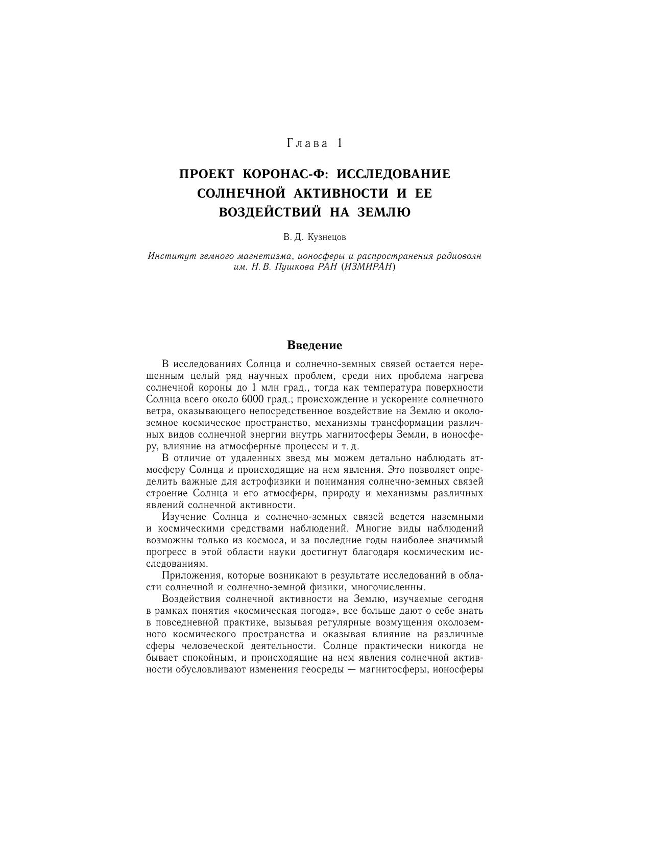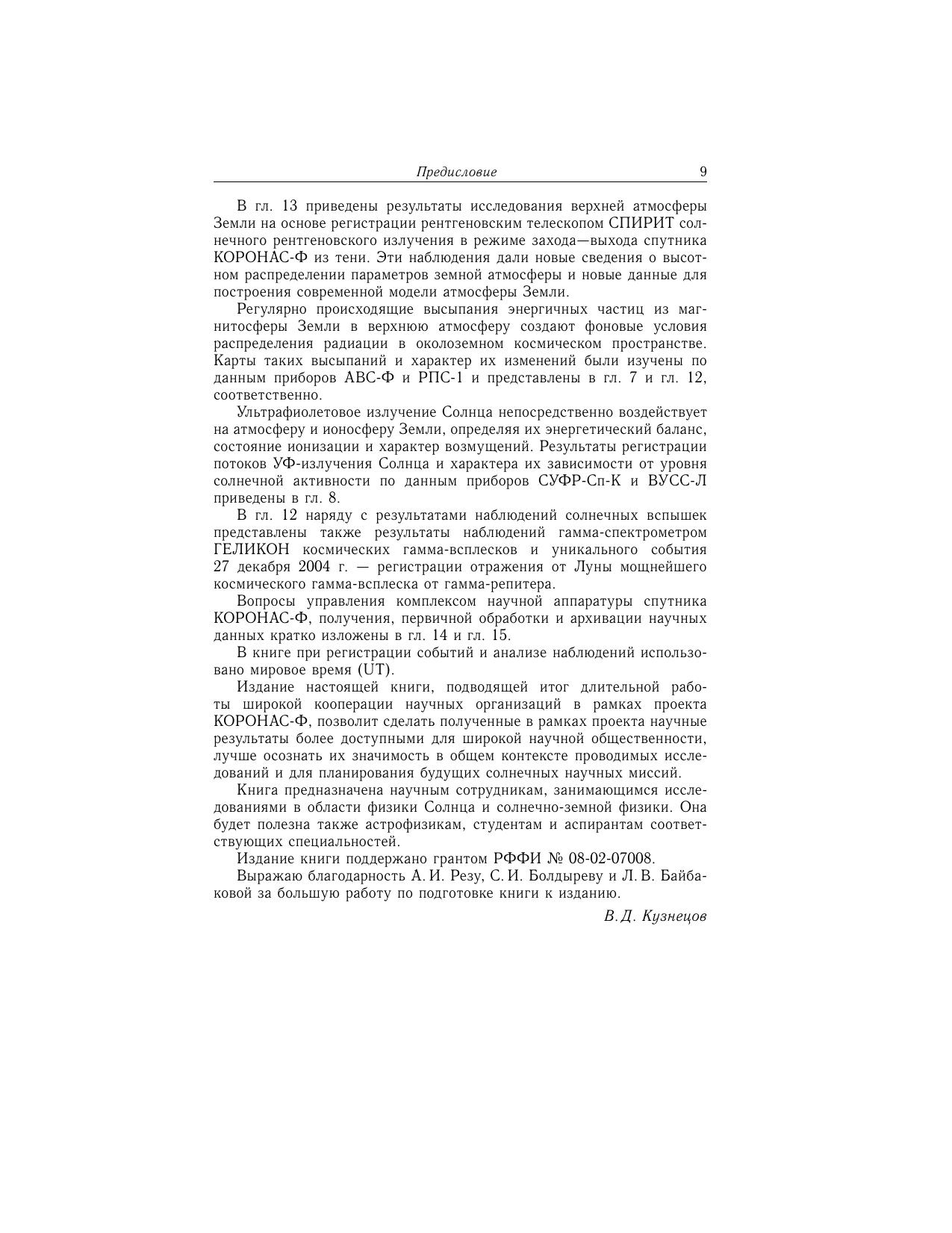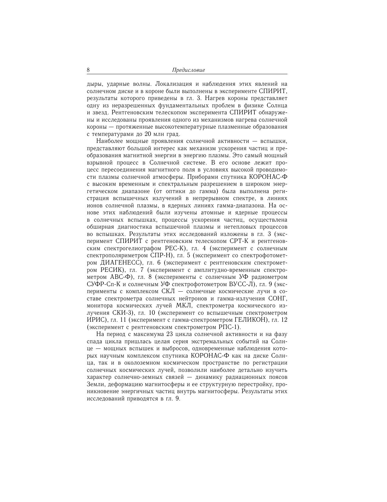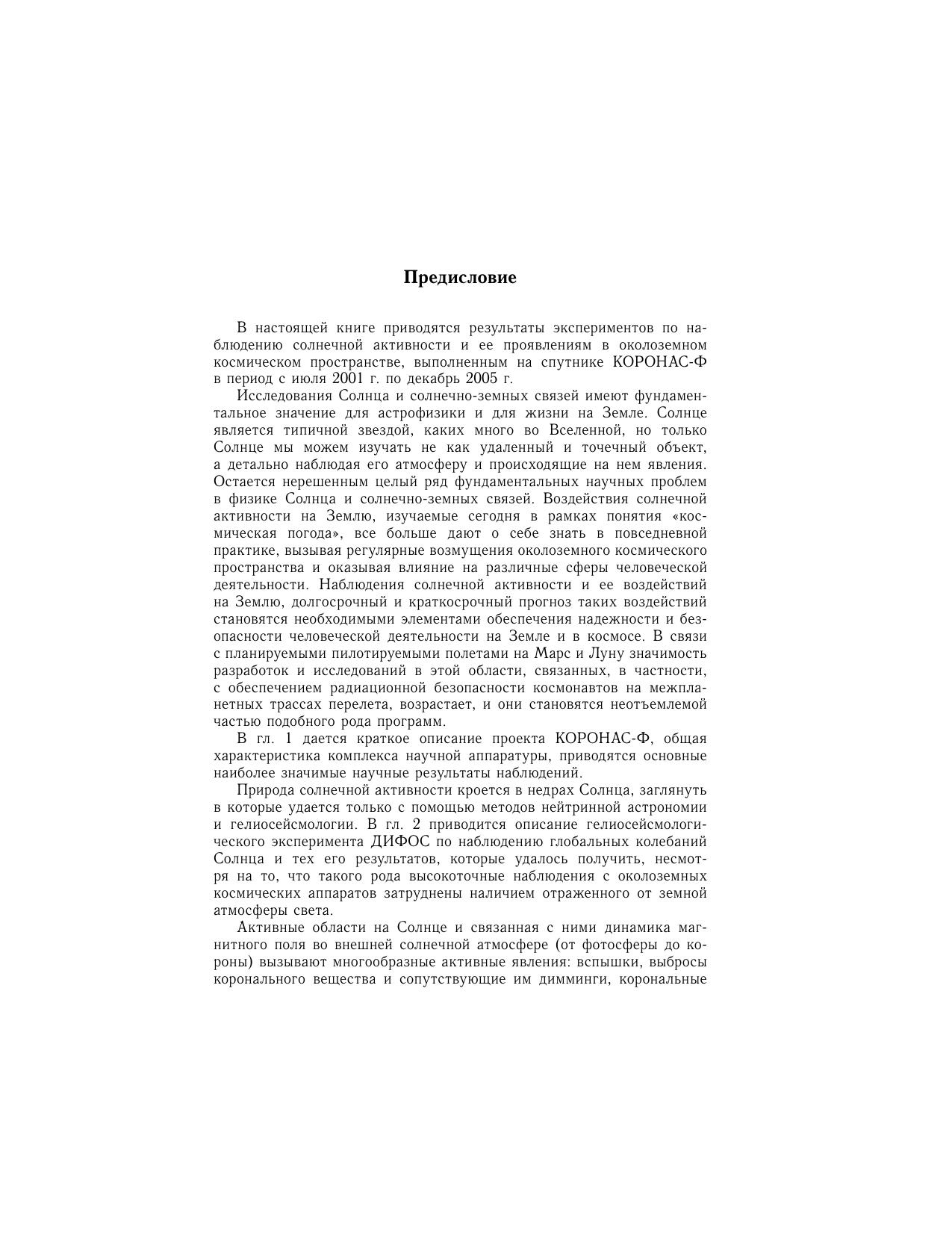 Приводятся результаты экспериментов по наблюдениям солнечной активности и ее проявлений в околоземном космическом пространстве, выполненных на спутнике КОРОНАС-Ф в период с июля 2001 по декабрь 2005 г. Дается общая характеристика комплекса научной аппаратуры проекта КОРОНАС-Ф, краткое описание экспериментов, приводятся основные наиболее значимые научные результаты наблюдений, относящиеся к глобальным колебаниям Солнца (р-моды), солнечной короне, вспышкам, солнечным космическим лучам, радиационным поясам Земли, верхней атмосфере Земли. Для научных сотрудников, занимающихся исследованиями в области физики Солнца и солнечно-земной физики, астрофизиков, студентов и аспирантов соответствующих специальностей.
