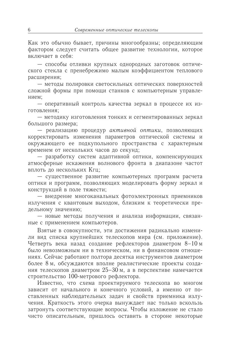 В течение четверти века суммарная площадь зеркал всех астрономических телескопов, работающих в оптическом диапазоне длин волн, возросла почти в 10 раз. Современные инструменты позволяют полу-ить более детальные изображения объектов, чем их предшественники, в частности преодолен «атмосферный барьер» качества изображений. Почему стал возможным столь быстрый прогресс? Как устроены новые телескопы? Какие проекты будут реализованы в ближайшие годы? Эти вопросы и обсуждаются в брошюре. Прослеживается историческая преемственность идей, определяющих развитие телескопостроения. Для студентов, специализирующихся в области астрономии, научых работников смежных специальностей и широкого круга людей, интересующихся естествознанием.