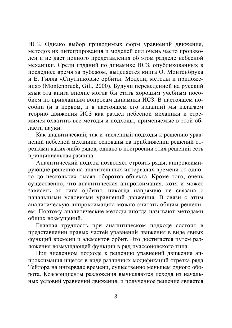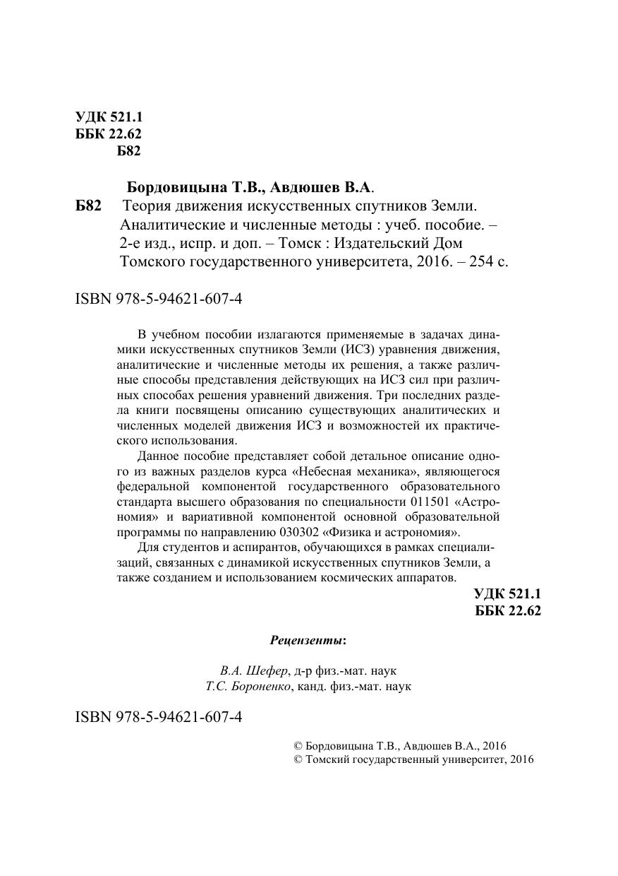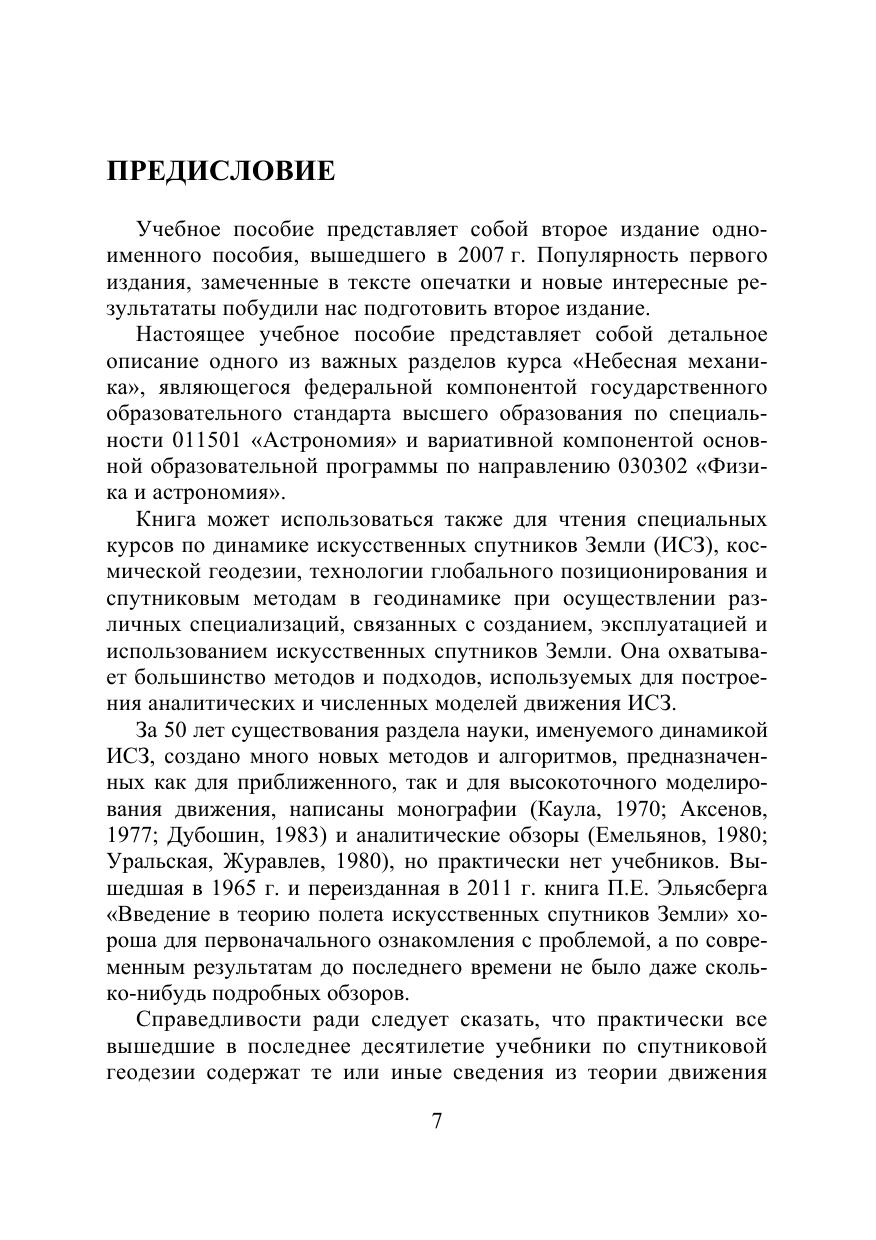 В учебном пособии излагаются применяемые в задачах динамики искусственных спутников Земли (ИСЗ) уравнения движения, аналитические и численные методы их решения, а также различные способы представления действующих на ИСЗ сил при различных способах решения уравнений движения. Три последних раздела книги посвящены описанию существующих аналитических и численных моделей движения ИСЗ и возможностей их практического использования. Данное пособие представляет собой детальное описание одного из важных разделов курса «Небесная механика», являющегося федеральной компонентой государственного образовательного стандарта высшего образования по специальности 011501 «Астрономия» и вариативной компонентой основной образовательной программы по направлению 030302 «Физика и астрономия». Для студентов и аспирантов, обучающихся в рамках специализаций, связанных с динамикой искусственных спутников Земли, а также созданием и использованием космических аппаратов.