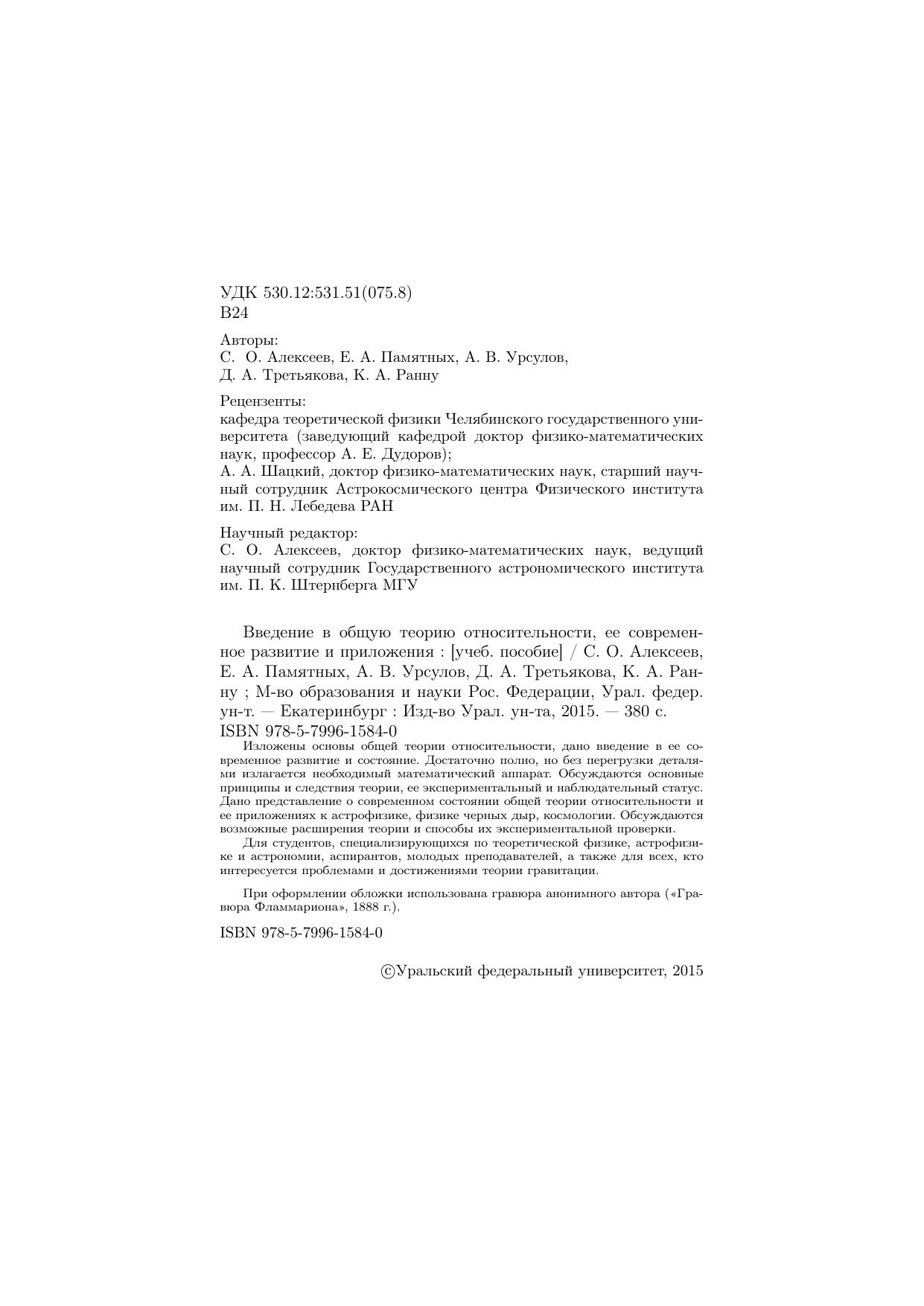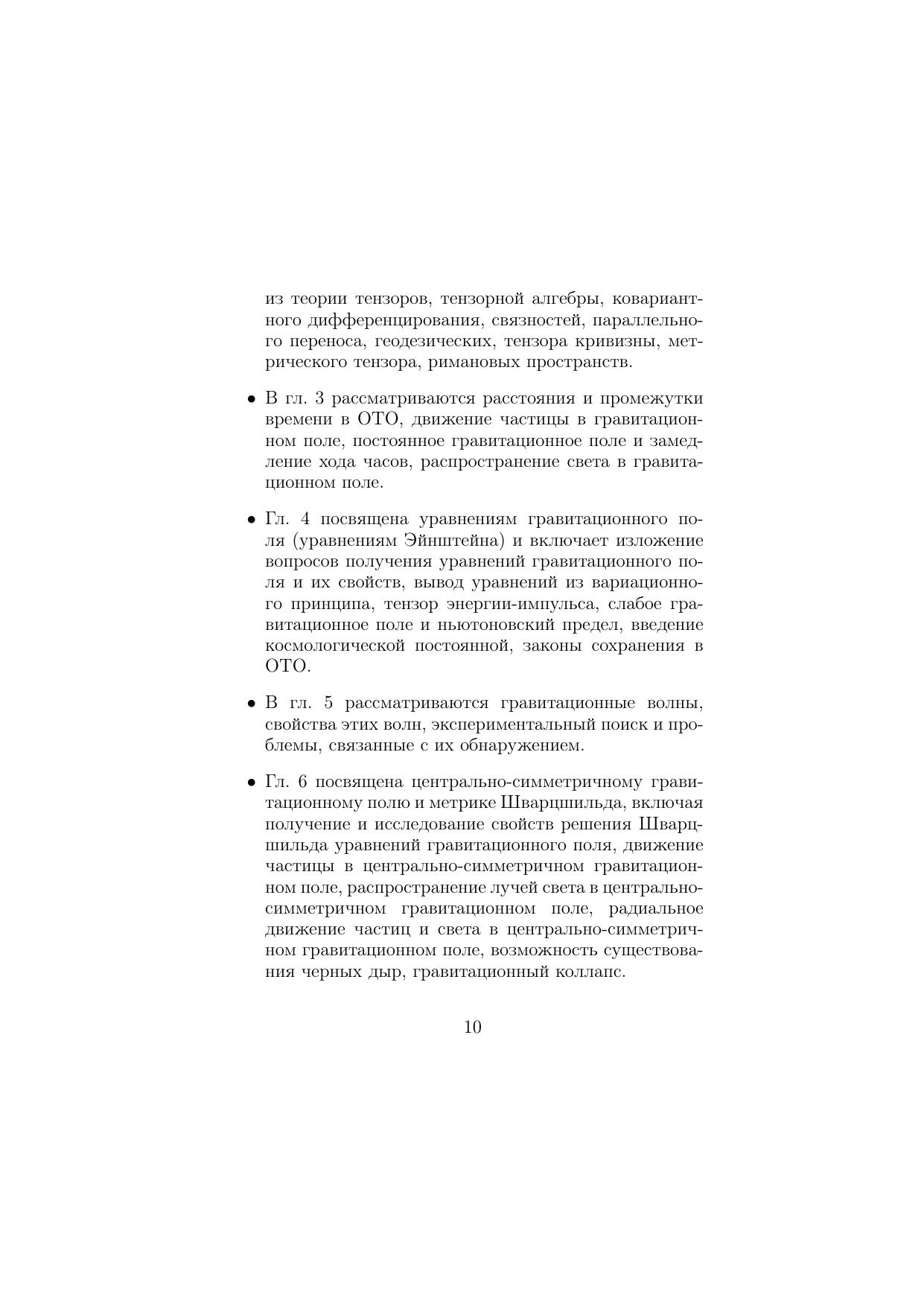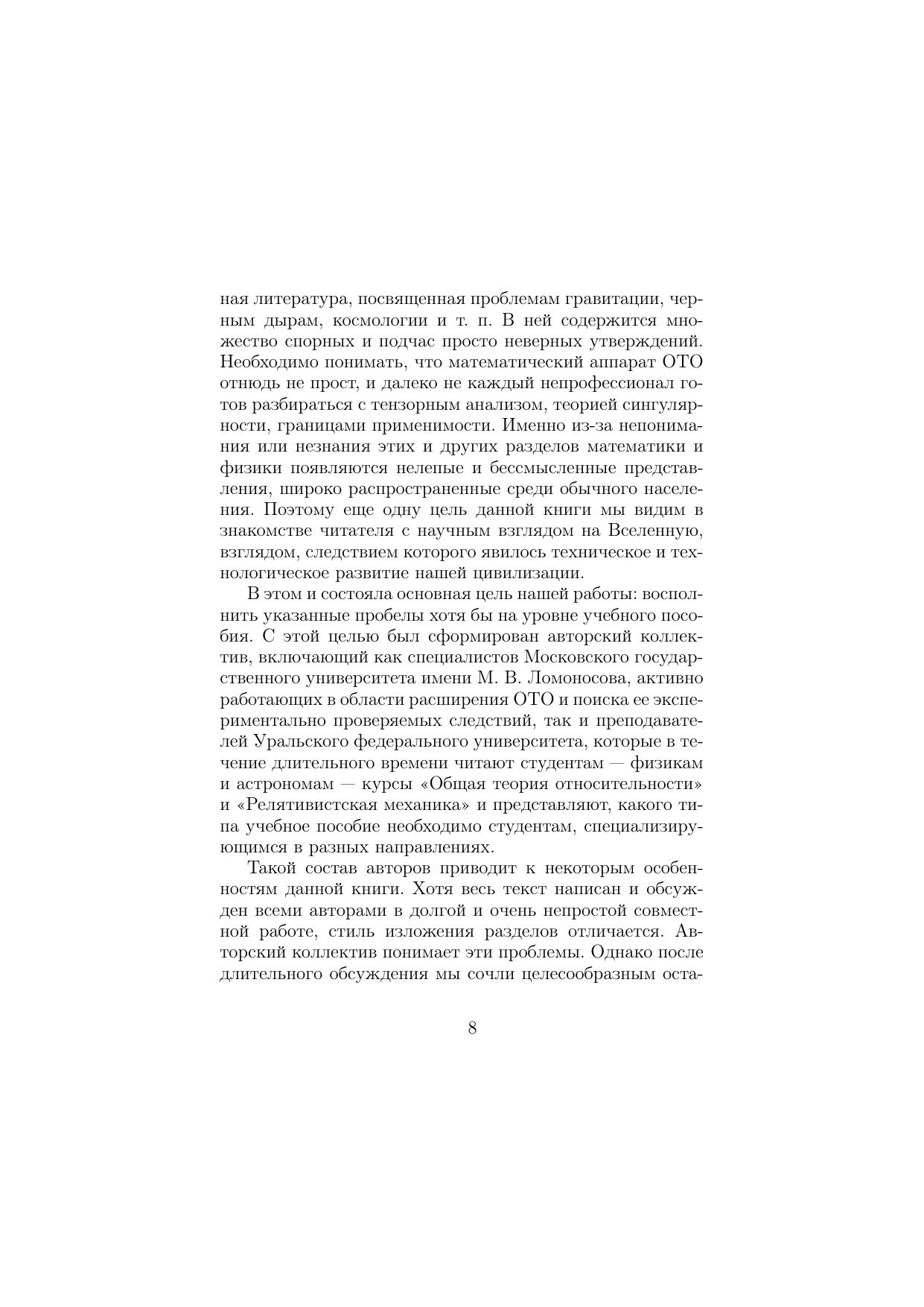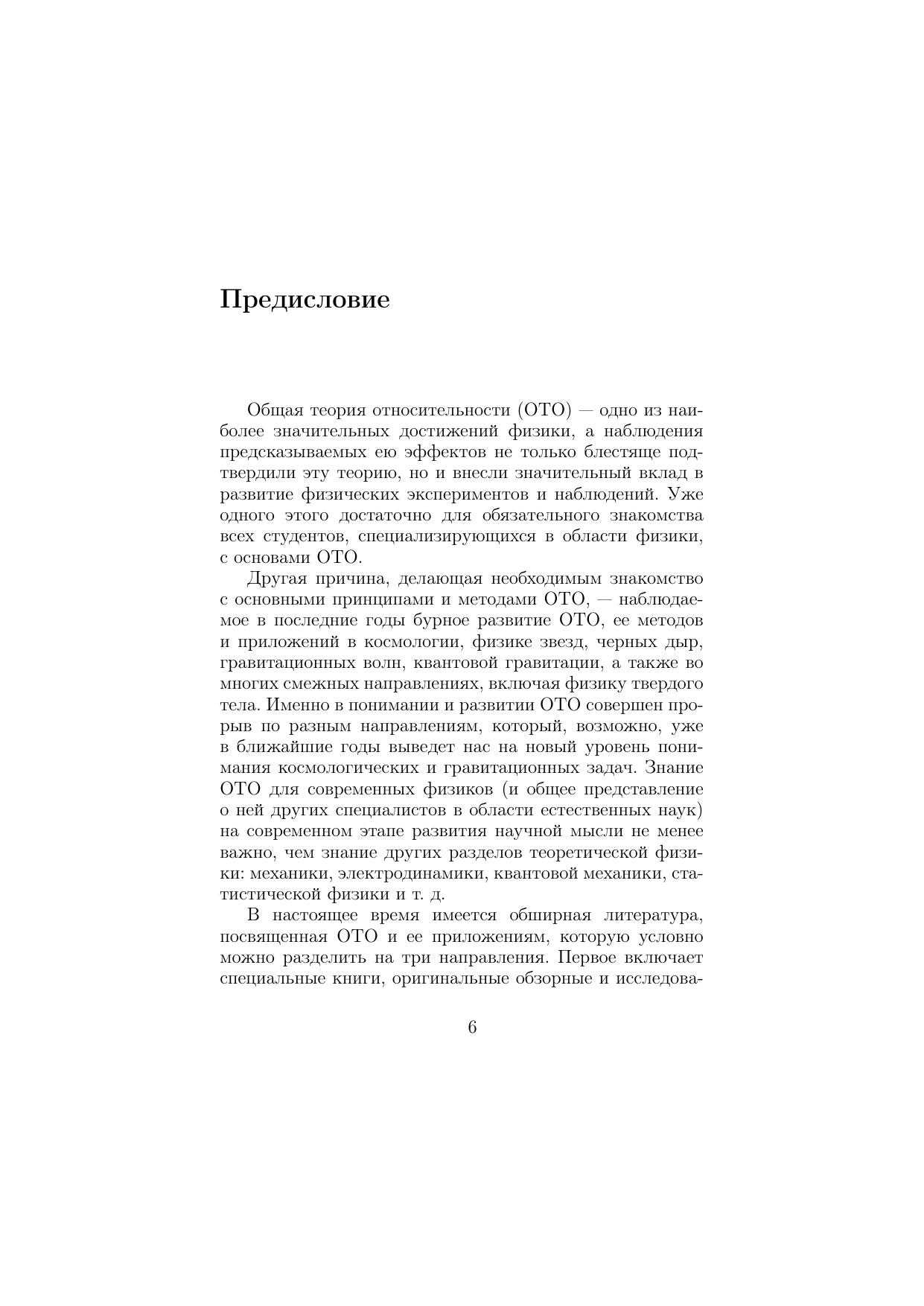 Изложены основы общей теории относительности, дано введение в ее современное развитие и состояние. Достаточно полно, но без перегрузки деталями излагается необходимый математический аппарат. Обсуждаются основные принципы и следствия теории, ее экспериментальный и наблюдательный статус. Дано представление о современном состоянии общей теории относительности и ее приложениях к астрофизике, физике черных дыр, космологии. Обсуждаются возможные расширения теории и способы их экспериментальной проверки. Для студентов, специализирующихся по теоретической физике, астрофизике и астрономии, аспирантов, молодых преподавателей, а также для всех, кто интересуется проблемами и достижениями теории гравитации.
