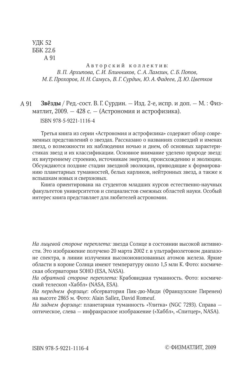 Третья книга из серии "Астрономия и астрофизика" содержит обзор современных представлений о звездах. Рассказано о названиях созвездий и именах звезд, о возможности их наблюдения ночью и днем, об основных характеристиках звезд и их классификации. Основное внимание уделено природе звезд: их внетреннему строению, источником энергии, происхождению и эволюции. Обсуждаются поздние стратегии звездной эволюции, приводящие к формированию планетарных туманностей, белых карликов, нейтронных звезд, а также к вспышкам новых и серрхновых.Книга ориентирована на студентов младших курсив естественно-научных факультетов университетов и специалистов смежных областей науки. Особый интерес книга представляет для любителей астрономии.