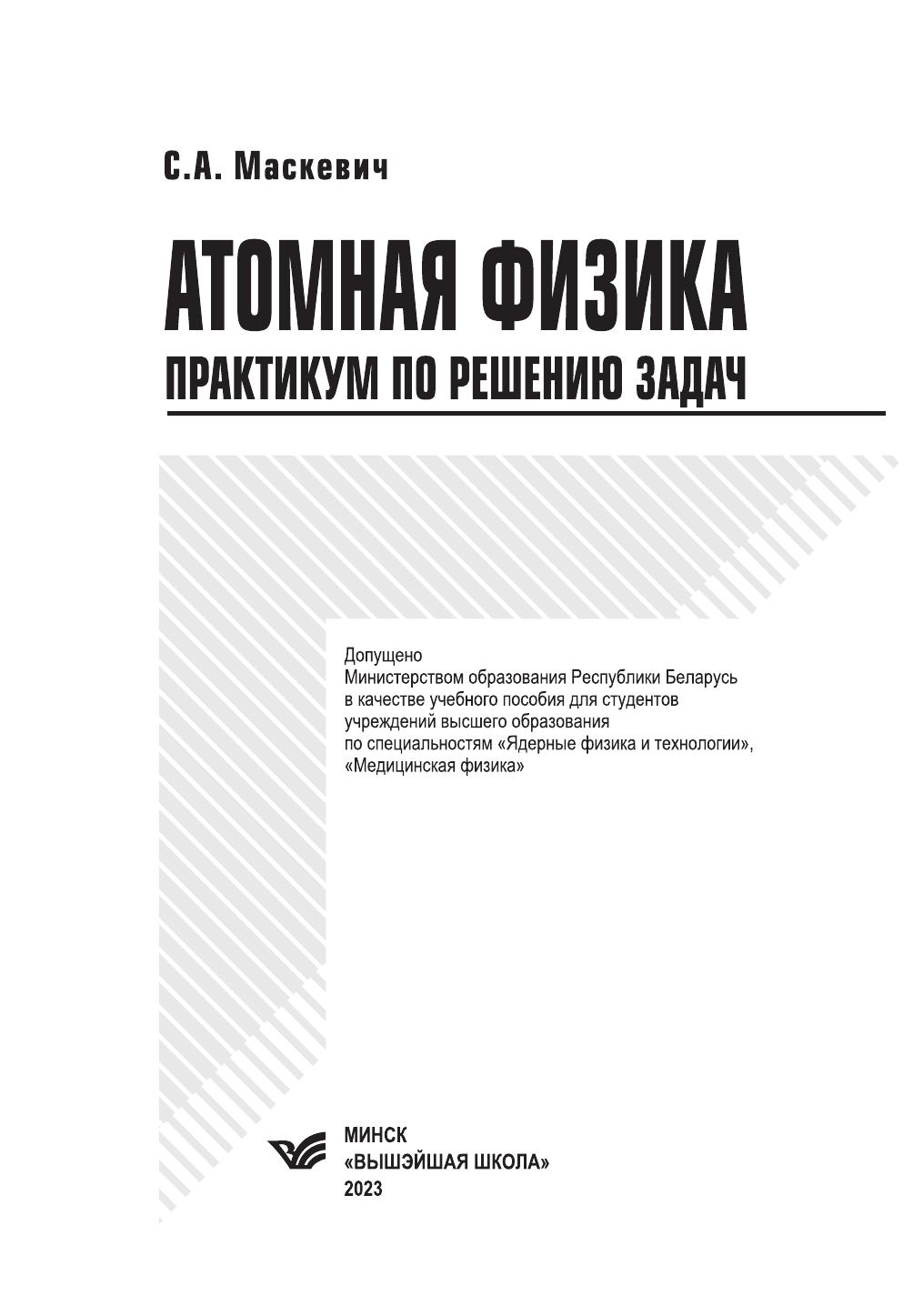 Данное издание является практикумом по решению задач по курсу «Физика атома и атомных явлений». Оно включает краткую теорию, примеры решения задач и задачи для самостоятельной работы студентов по девяти темам в соответствии с программой для студентов специальности «ядерные физика и технологии» и других физических специальностей учреждений высшего образования. Задачи каждой темы сгруппированы по трем уровням сложности, что позволяет легко сформировать индивидуальный пакет заданий для самостоятельной работы как студентам-физикам, так и студентам-инженерам.