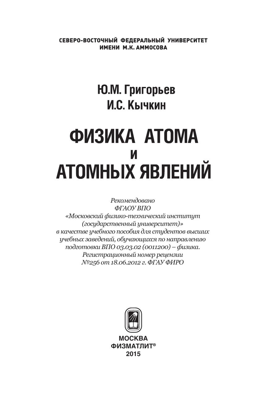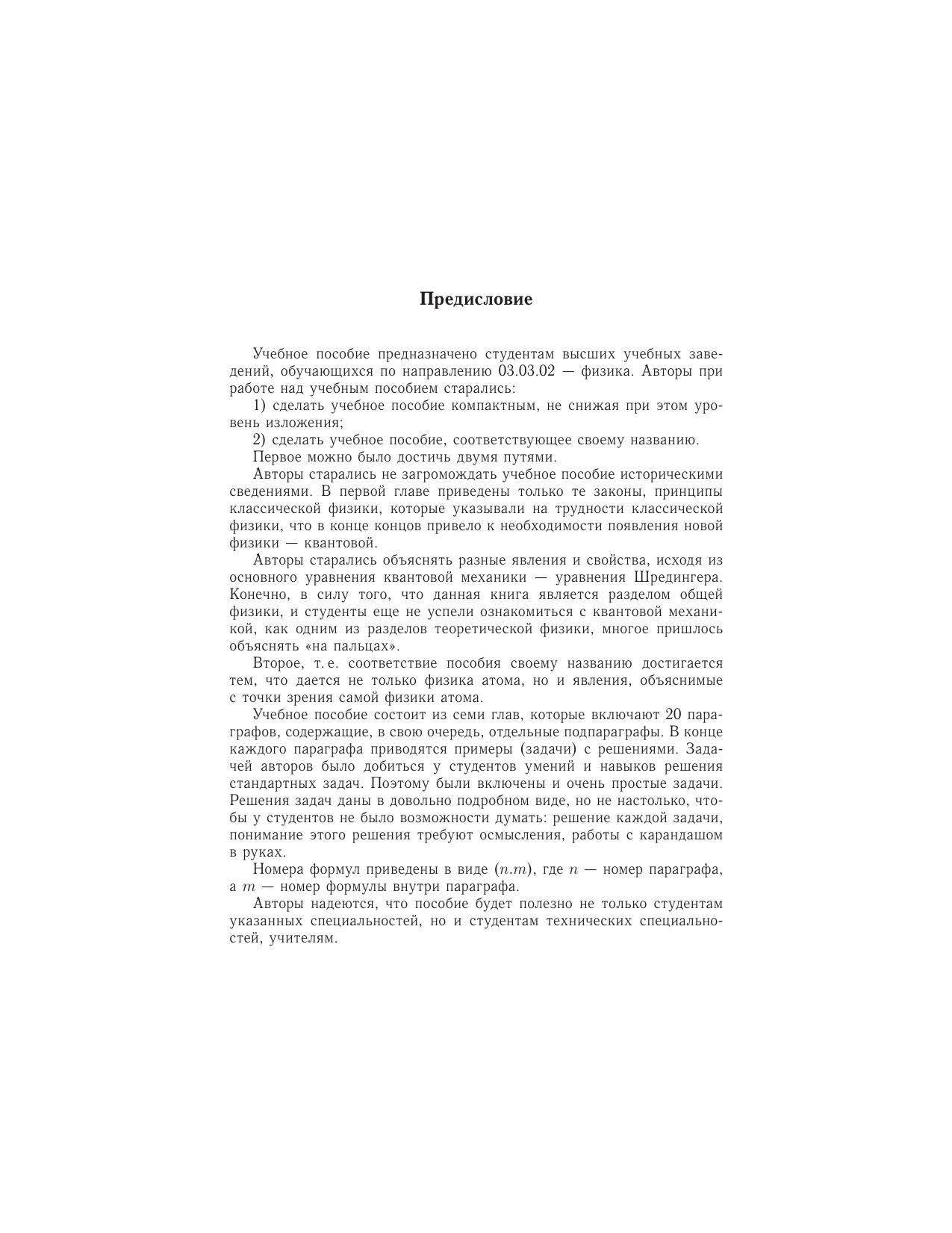 Пособие написано на основе лекций по атомной физике, читаемых на протяжении многих лет в Физико-техническом институте (на физическом факультете) Северо-Восточного федерального университета им. М.К. Аммосова (Якутского государственного университета). Приведены трудности классической физики, ставшие причиной появления квантовой физики. Изложены основы математического аппарата квантовой теории. С помощью уравнения Шрёдингера исследуются строение одно- и многоэлектронных атомов, простейших молекул, действие внешних полей на атомы; приведены элементы физики твердого тела. В конце каждого параграфа даны задачи с решениями. Для студентов высших учебных заведений, обучающихся по направлениям физика и радиофизика, а также студентов технических университетов.