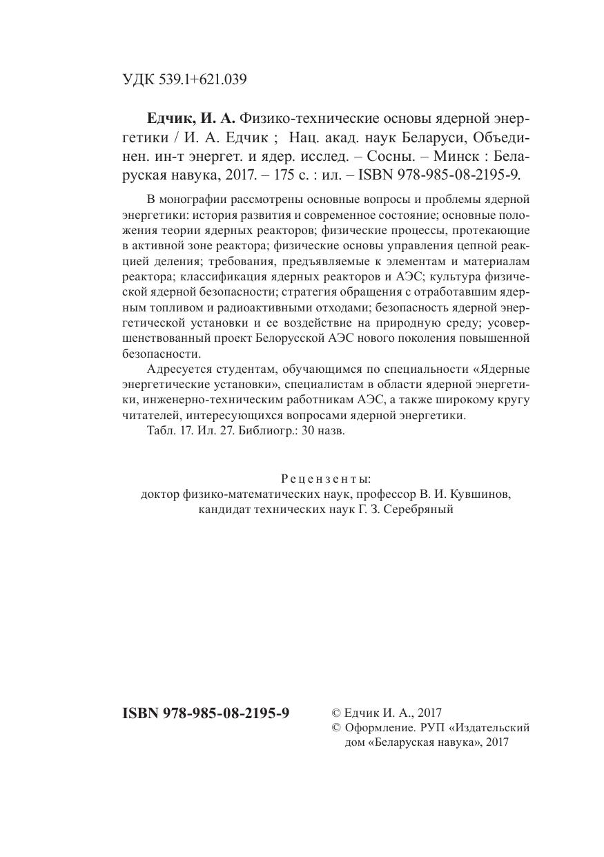 В монографии рассмотрены основные вопросы и проблемы ядерной энергетики: история развития и современное состояние, основные положения теории ядерных реакторов, физические процессы, протекающие в активной зоне реактора, физические основы управления цепной реакцией деления, требования, предъявляемые к элементам и материалам реактора, классификация ядерных реакторов и АЭС, культура физической ядерной безопасности, стратегия обращения с отработавшим ядерным топливом и радио активными отходами, безопасность ядерной энергетической установки и ее воздействие на природную среду, усовершенствованный проект Белорусской АЭС нового поколения повышенной безопасности. Адресуется студентам, обучающимся по специальности «Ядерные энергетические установки», специалистам в области ядерной энергетики, инженерно-техническим работникам АЭС, а также широкому кругу читателей, интересующихся вопросами ядерной энергетики.