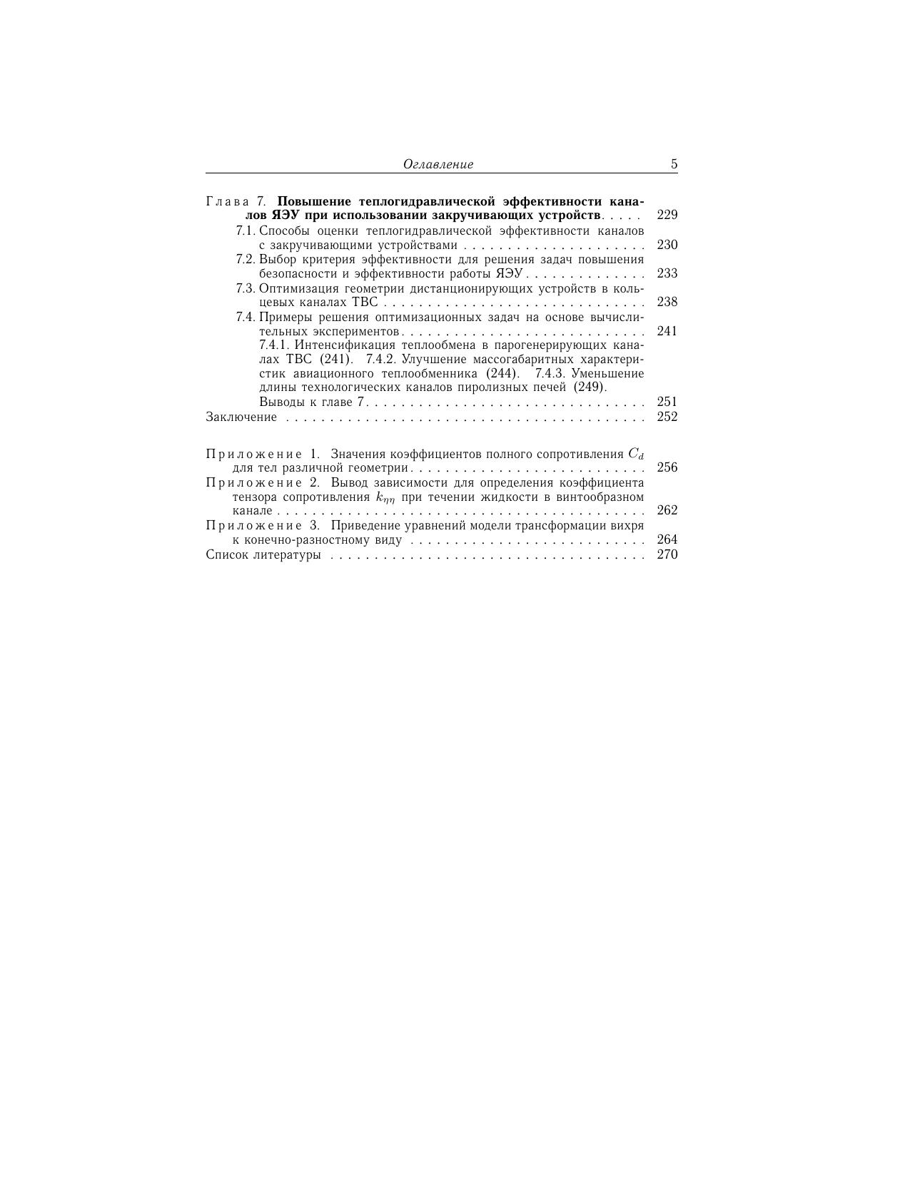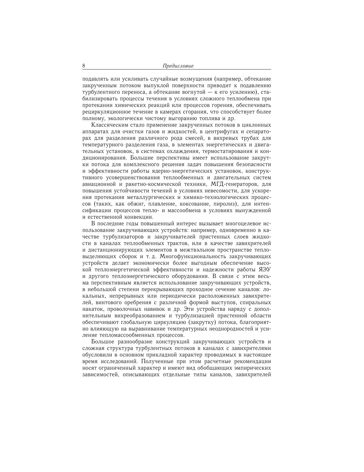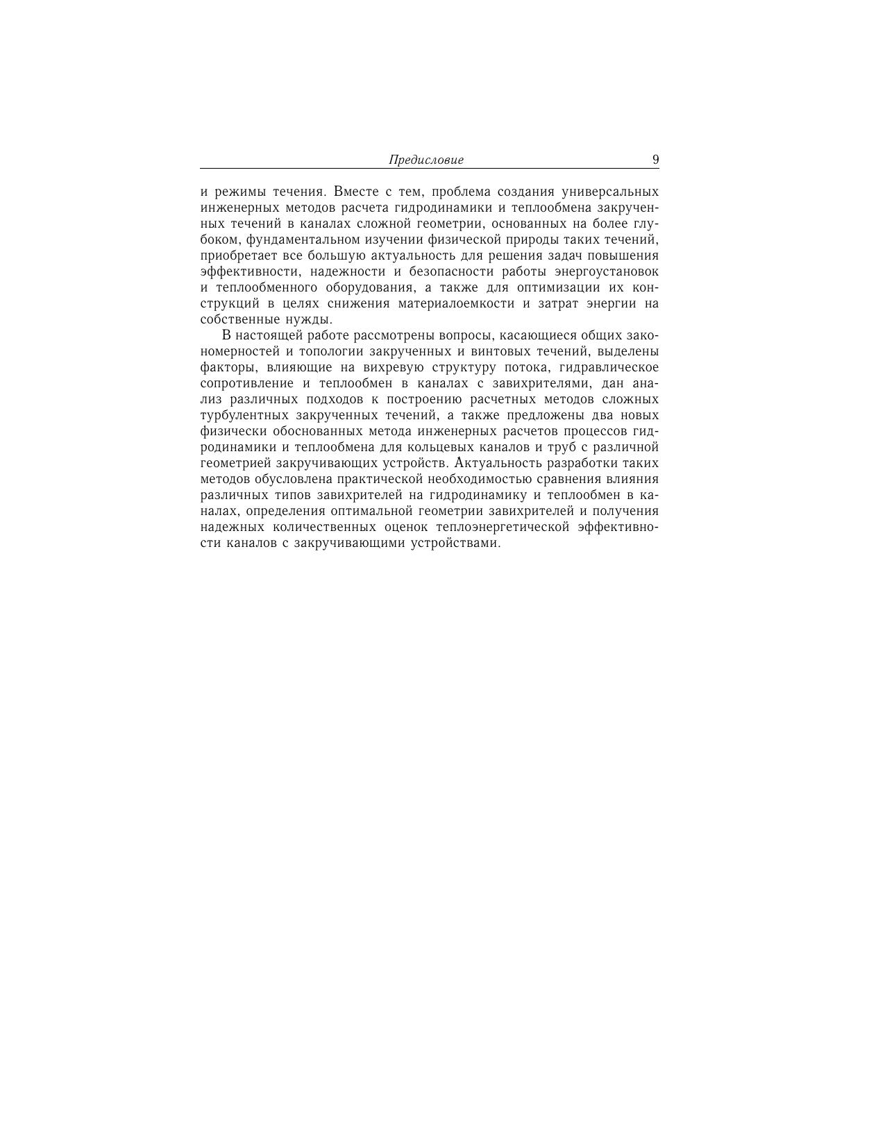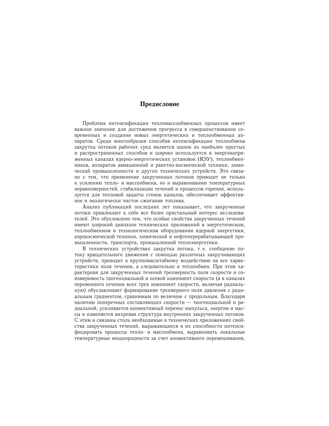 Монография посвящена проблеме моделирования процессов гидродинамики и теплообмена сложных закрученных течений вязкой несжимаемой жидкости в каналах с закручивающими устройствами. Рассмотрены физические особенности турбулентных закрученных потоков, выявлены факторы, влияющие на вихревую структуру течения теплоносителей, гидравлическое сопротивление и теплообмен в каналах ядерно-энергетических установок (ЯЭУ). Основой физико-математического моделирования является комплексное решение проблем пространственного осреднения уравнений динамики сплошной среды для каналов сложной геометрии, описания граничных условий, эффективных коэффициентов переноса и формулировки замыкающих соотношений, полученных в результате экспериментального подтверждения принимаемых физических моделей и гипотез. Разработаны методы математического моделирования гидродинамики и теплообмена для наиболее характерных типов каналов с завихрителями различной конфигурации. Получены аналитические решения в форме модифицированных интегралов Лайона для оценки теплоотдачи в кольцевых каналах с завихрителями, а также для винтового течения теплоносителя. Проведено расчетное исследование влияния интенсивности завихренности потока и геометрических параметров каналов на вихревую структуру закрученных течений. Рассмотрены способы повышения теплогидравлической эффективности каналов ЯЭУ при использовании закручивающих устройств. Для научных работников, инженеров, аспирантов и студентов физических факультетов университетов, чьи интересы связаны с теплофизикой, механикой жидкости и газа и процессами теплообмена в технических и природных система