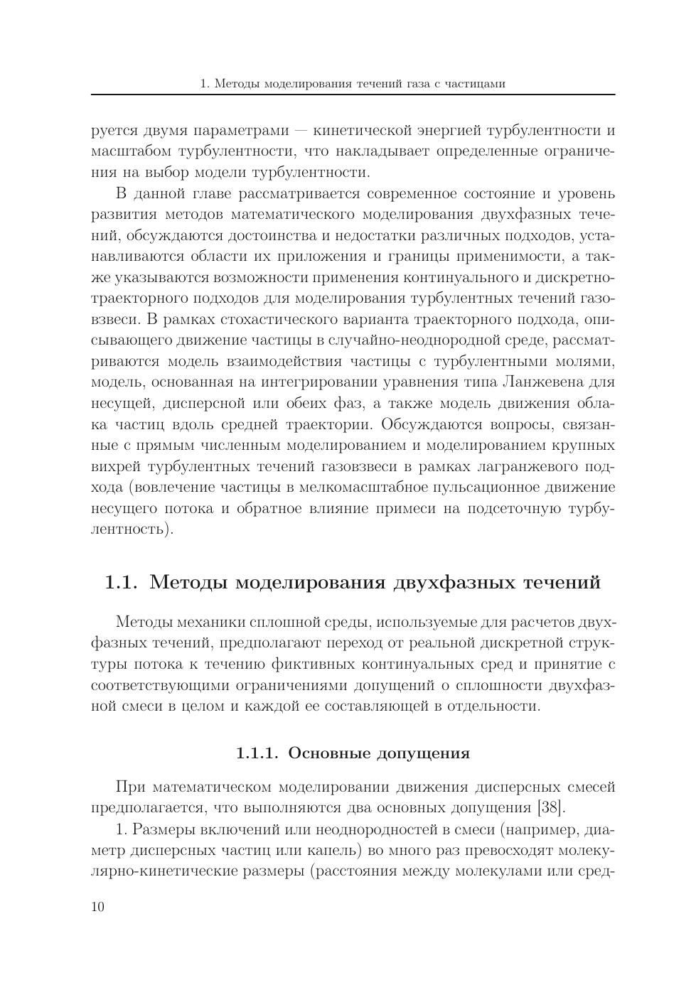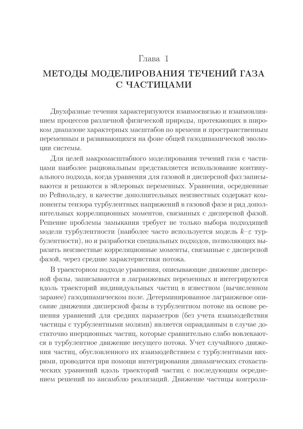 Рассматриваются математические модели и приводятся результаты численного моделирования турбулентных течений газа с твердыми частицами. Обсуждаются вопросы, связанные с движением частиц, взвешенных в турбулентном потоке, и их обратным влиянием на характеристики течения несущего газа. Развиваются стохастические модели, основанные на лагранжевом подходе к описанию движения и теплообмена частиц в турбулентном потоке, а также прямое численное моделирование и моделирование крупных вихрей турбулентных течений газовзвеси, включая влияние дисперсной фазы на структуру подсеточной турбулентности. Рассматриваются особенности численной реализации математических моделей двухфазных течений.