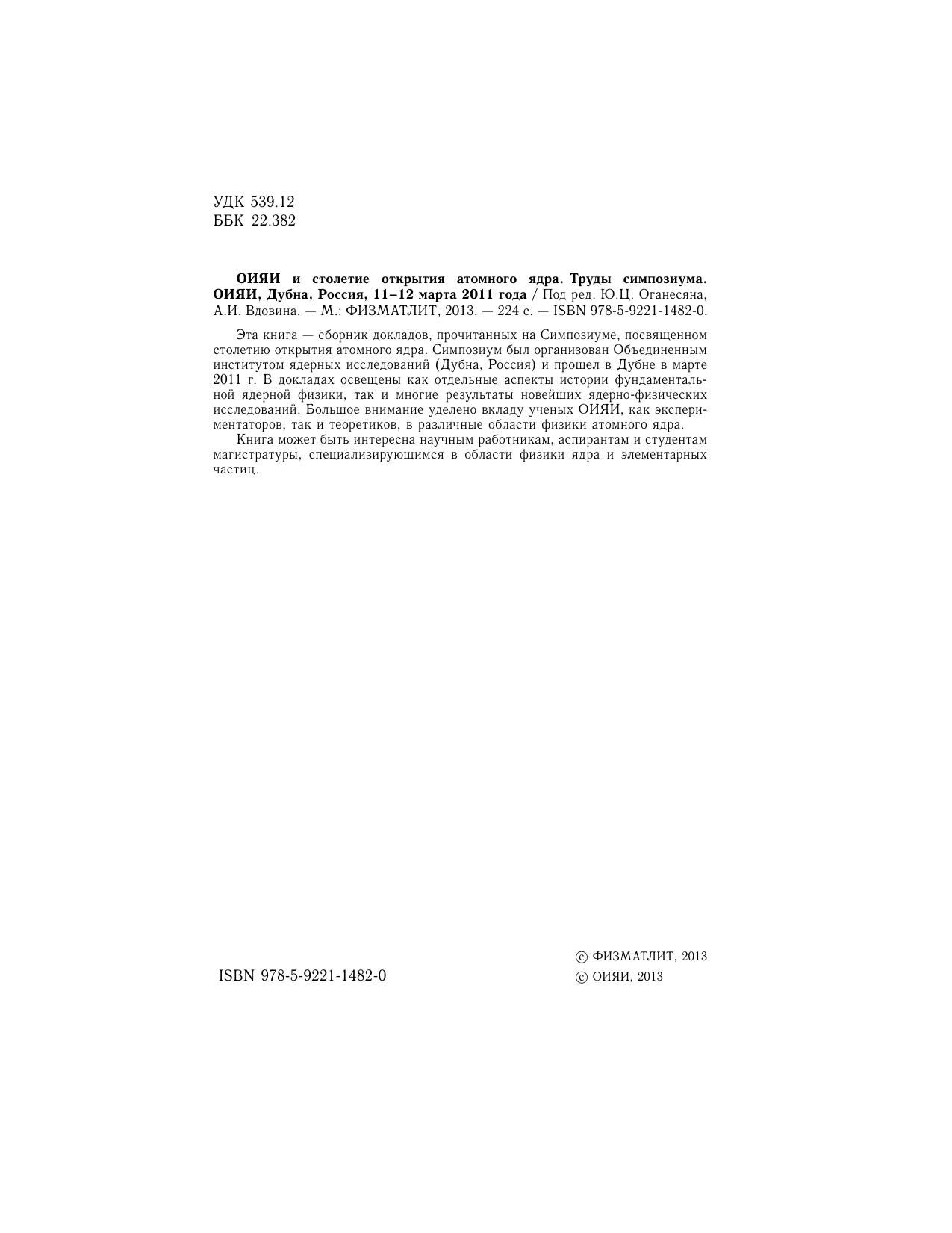 Эта книга — сборник докладов, прочитанных на Симпозиуме, посвященном столетию открытия атомного ядра. Симпозиум был организован Объединенным институтом ядерных исследований (Дубна, Россия) и прошел в Дубне в марте 2011 г. В докладах освещены как отдельные аспекты истории фундаментальной ядерной физики, так и многие результаты новейших ядерно-физических исследований. Большое внимание уделено вкладу ученых ОИЯИ, как экспериментаторов, так и теоретиков, в различные области физики атомного ядра. Книга может быть интересна научным работникам, аспирантам и студентам магистратуры, специализирующимся в области физики ядра и элементарных частиц.