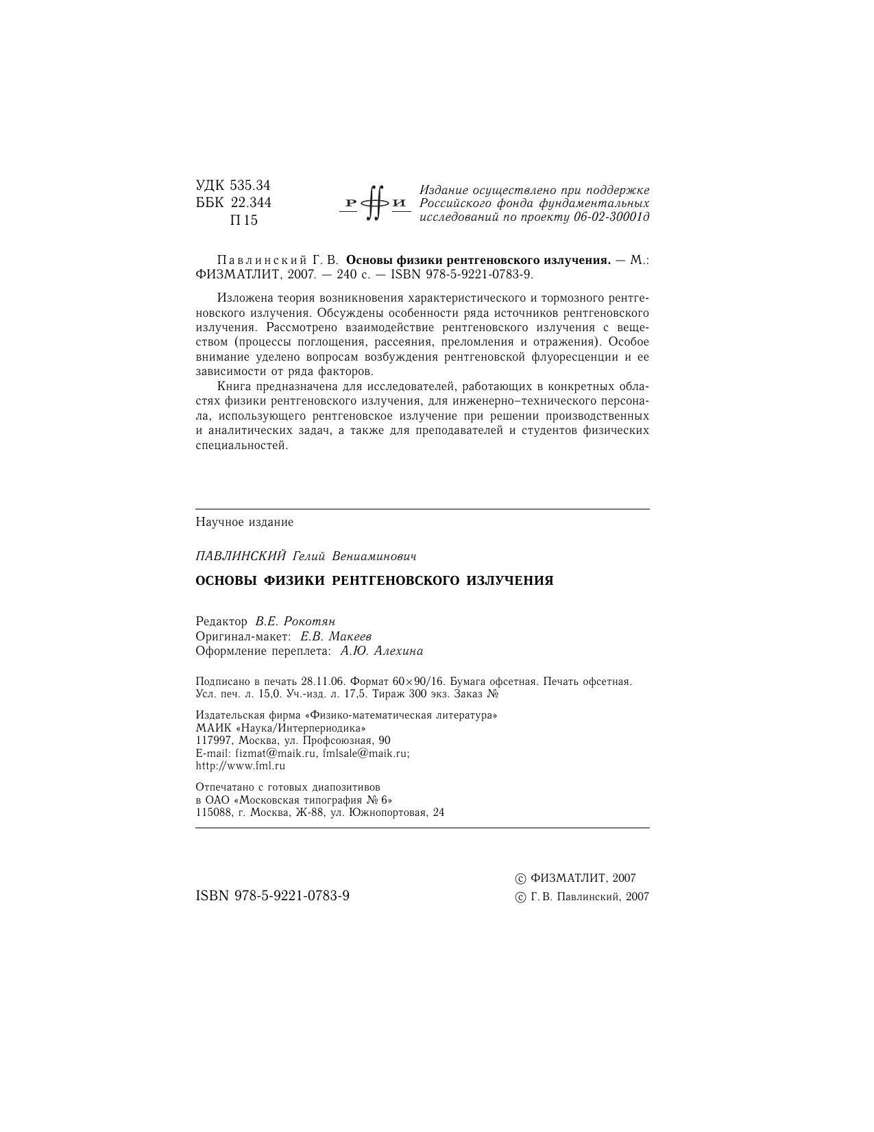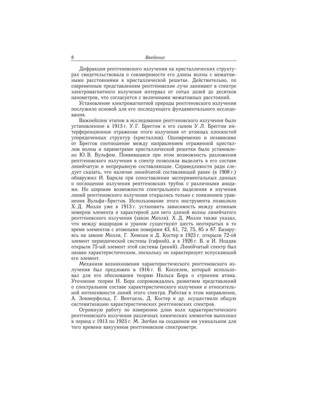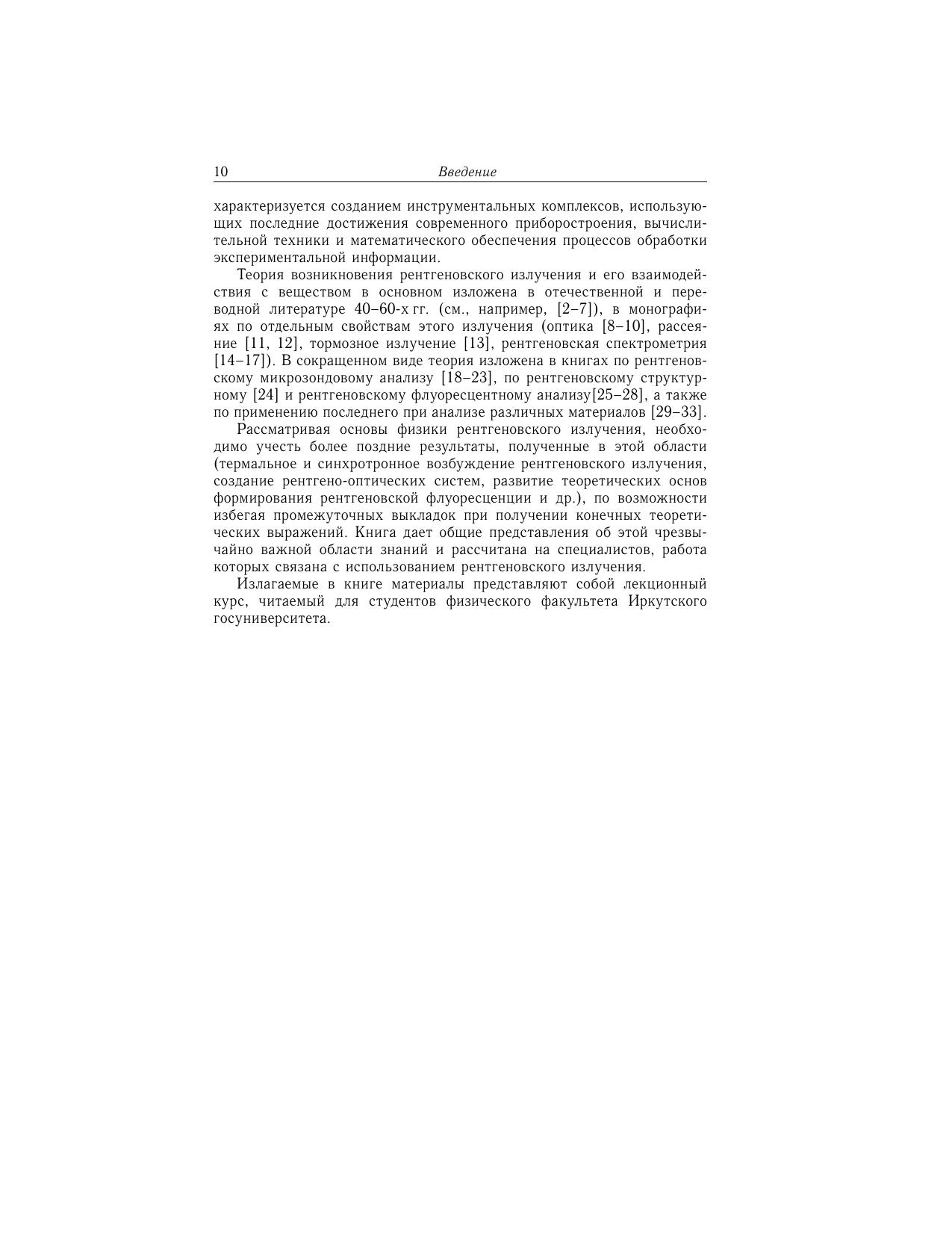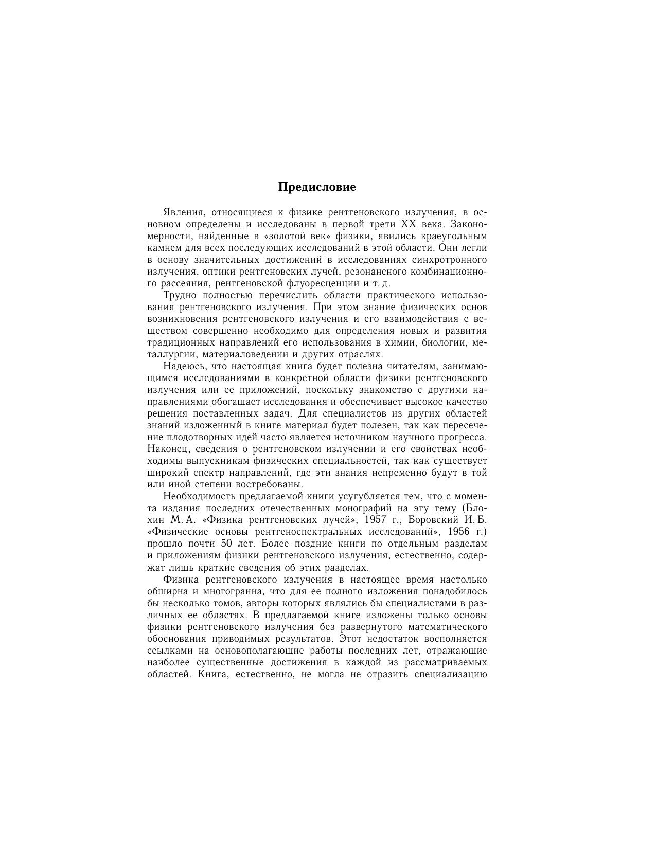 Изложена теория возникновения характеристического и тормозного рентгеновского излучения. Обсуждены особенности ряда источников рентгеновского излучения. Рассмотрено взаимодействие рентгеновского излучения с веществом (процессы поглощения, рассеяния, преломления и отражения). Особое внимание уделено вопросам возбуждения рентгеновской флуоресценции и ее зависимости от ряда факторов. Книга предназначена для исследователей, работающих в конкретных областях физики рентгеновского излучения, для инженерно-технического персонала, использующего рентгеновское излучение при решении производственных и аналитических задач, а также для преподавателей и студентов физических специальностей.
