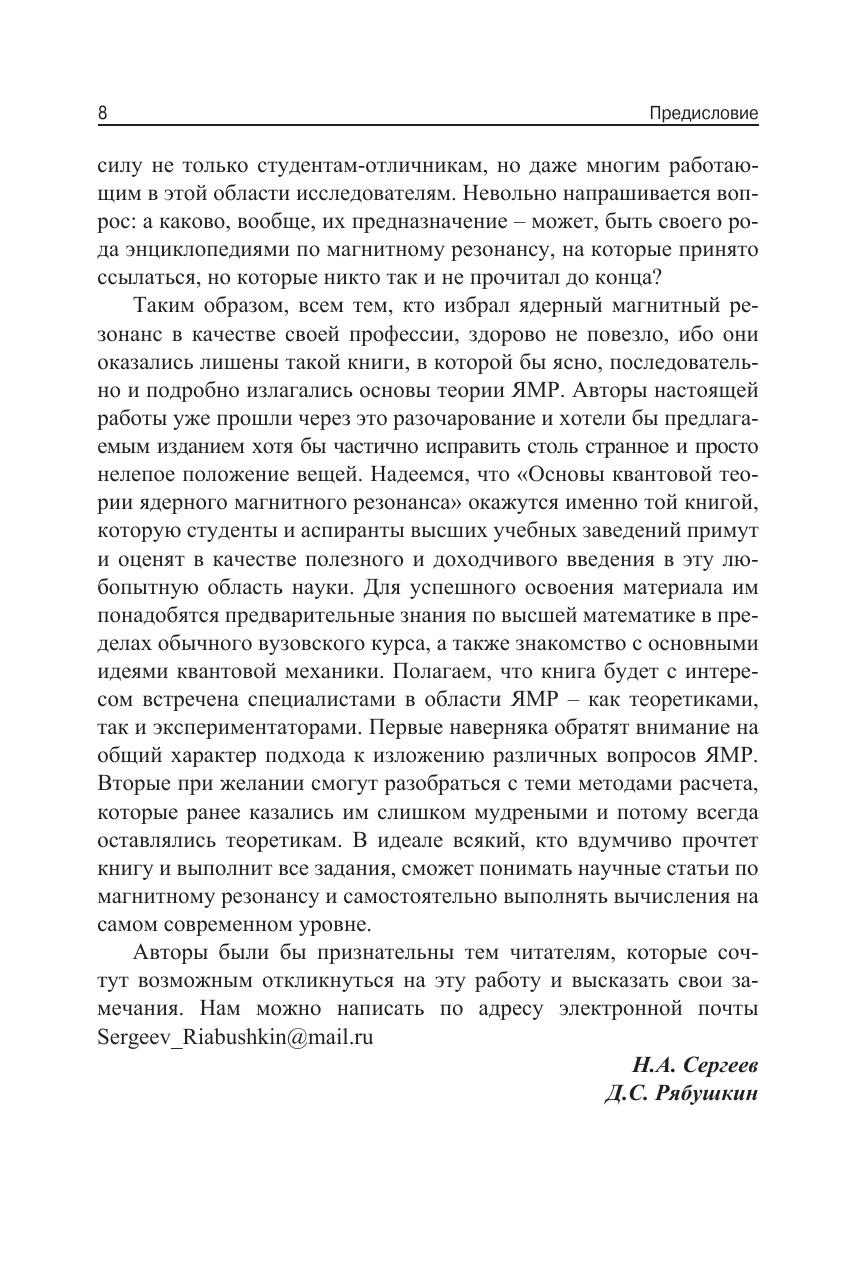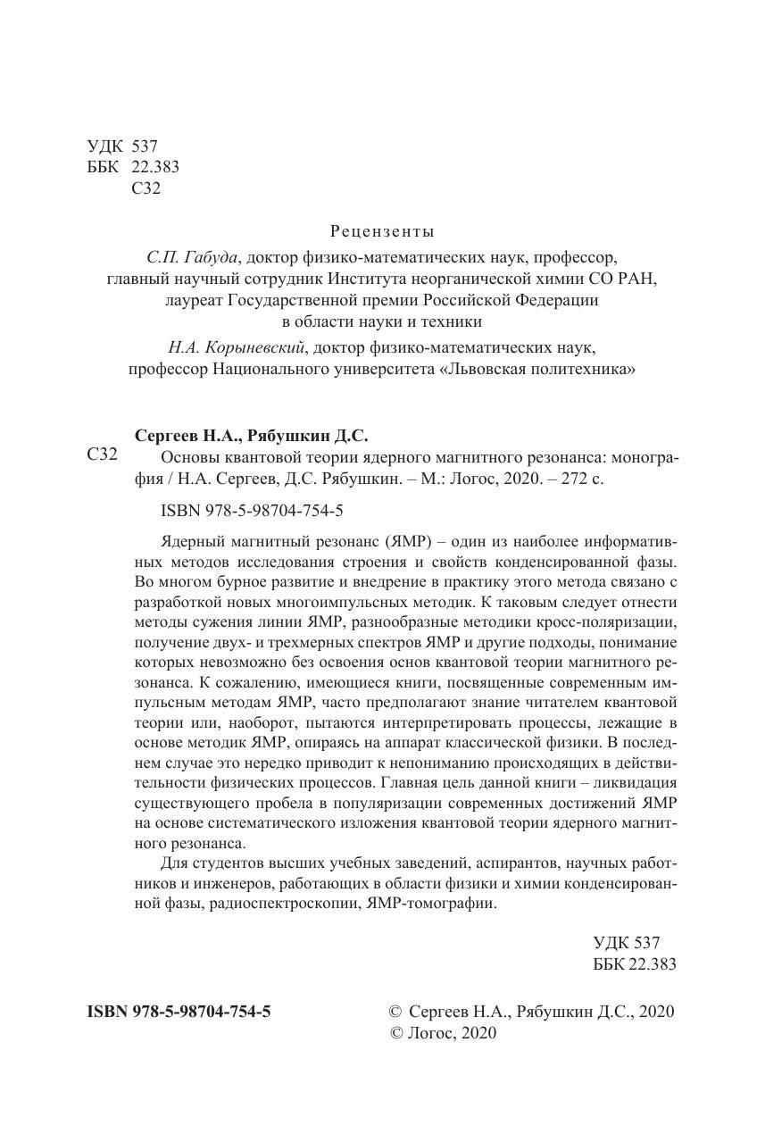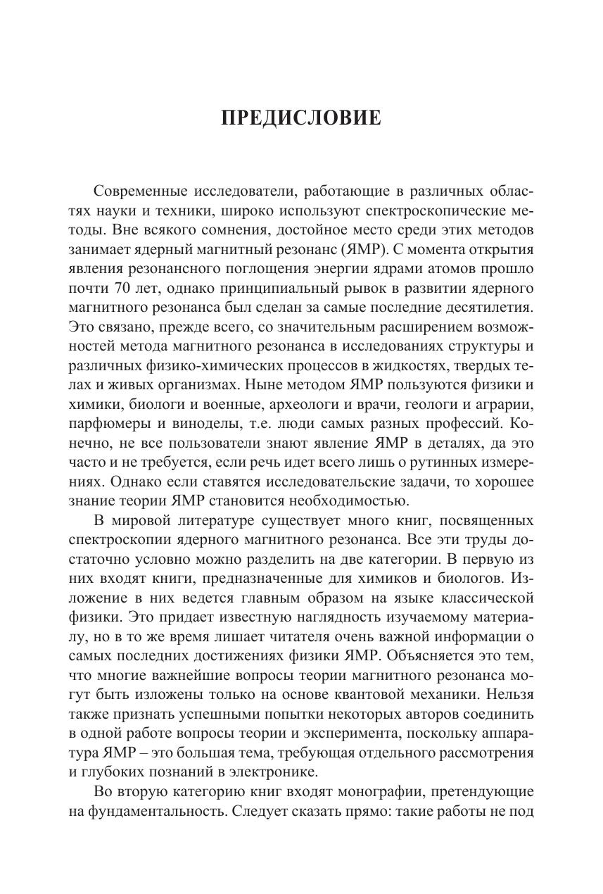 Ядерный магнитный резонанс (ЯМР) – один из наиболее информативных методов исследования строения и свойств конденсированной фазы. Во многом бурное развитие и внедрение в практику этого метода связано с разработкой новых многоимпульсных методик. К таковым следует отнести методы сужения линии ЯМР, разнообразные методики кросс-поляризации, получение двух- и трехмерных спектров ЯМР и другие подходы, понимание которых невозможно без освоения основ квантовой теории магнитного резонанса. К сожалению, имеющиеся книги, посвященные современным импульсным методам ЯМР, часто предполагают знание читателем квантовой теории или, наоборот, пытаются интерпретировать процессы, лежащие в основе методик ЯМР, опираясь на аппарат классической физики. В последнем случае это нередко приводит к непониманию происходящих в действительности физических процессов. Главная цель данной книги – ликвидация существующего пробела в популяризации современных достижений ЯМР на основе систематического изложения квантовой теории ядерного магнитного резонанса. Для студентов высших учебных заведений, аспирантов, научных работников и инженеров, работающих в области физики и химии конденсированной фазы, радиоспектроскопии, ЯМР-томографии.
