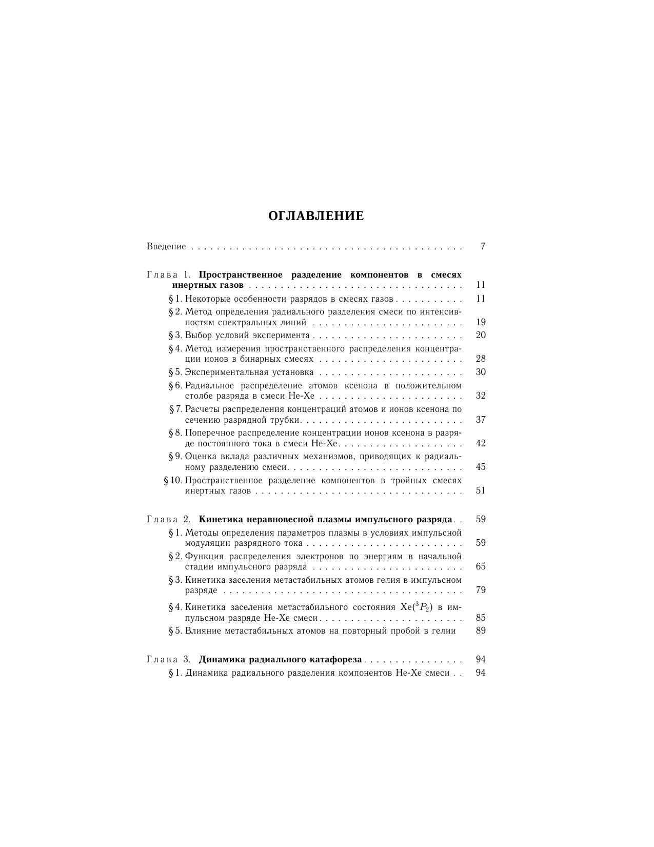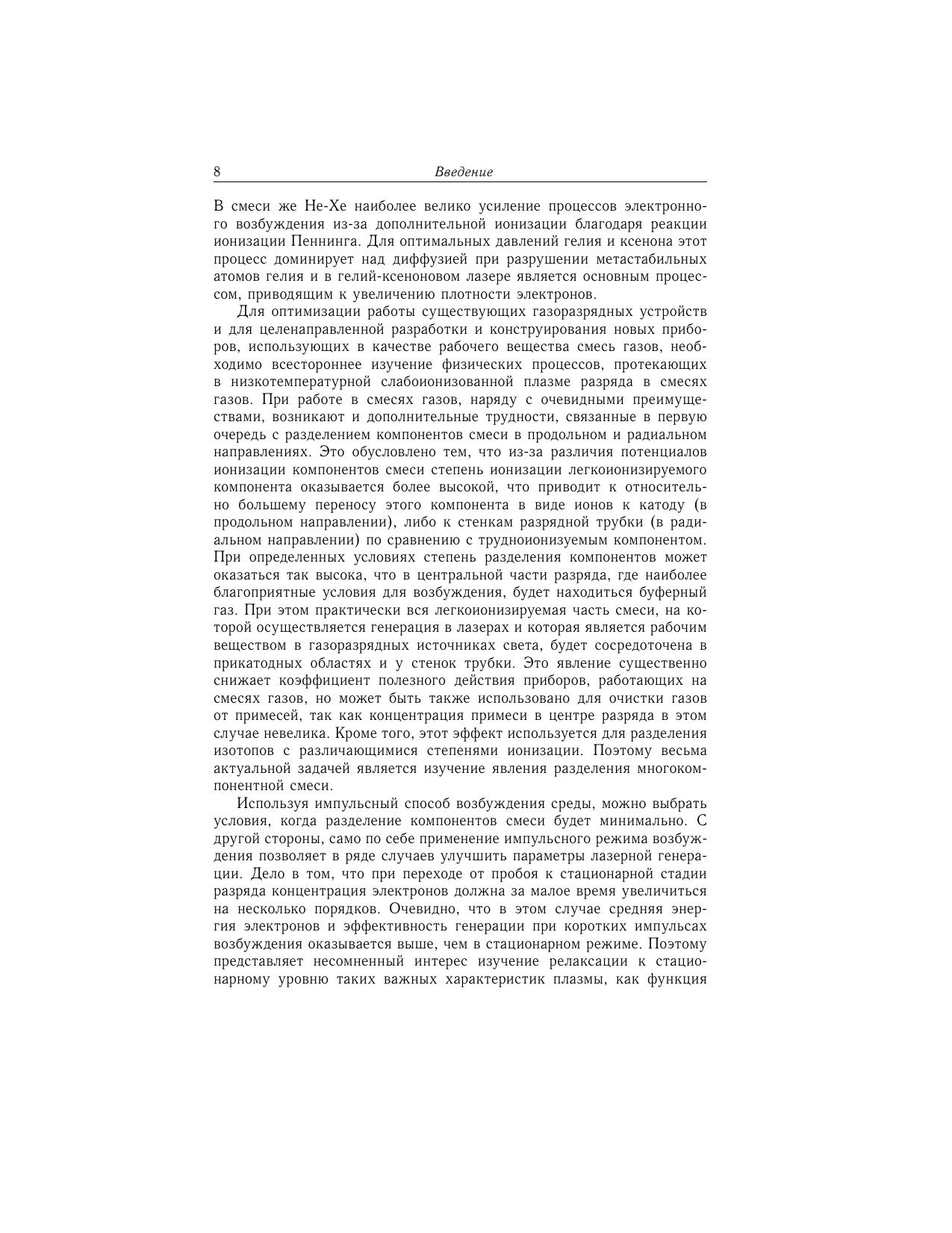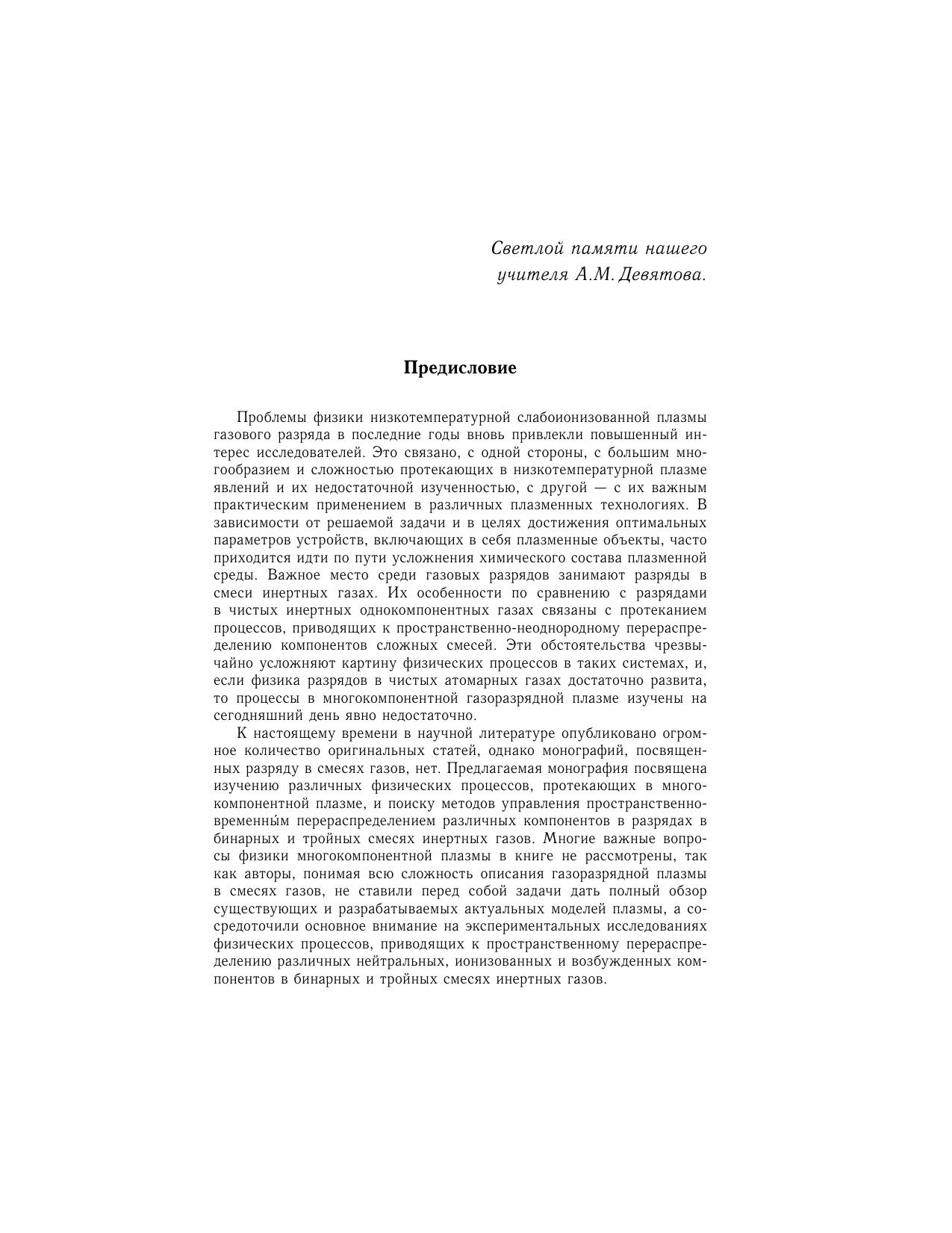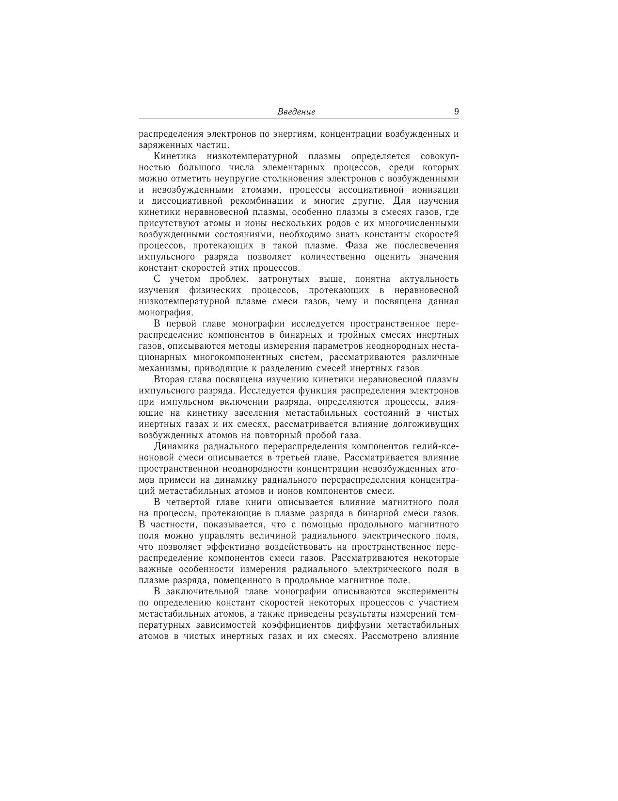 Монография отражает современный уровень исследований в области неравновесной низкотемпературной плазмы газового разряда в смесях инертных газов. В ней обобщены и систематизированы результаты экспериментальных исследований физических процессов, протекающих в нестационарной многокомпонентной плазме инертных газов. Особое внимание уделено изучению процессов, приводящих к пространственному перераспределению компонентов бинарных смесей, динамики установления стационарного уровня разделения, влиянию продольного магнитного поля на радиальное разделение компонентов и характеристики газового разряда в смесях газов. Для научных работников, инженеров, аспирантов и студентов, специализирующихся в области физики плазмы и газового разряда, атомной физики, физической кинетики, а также в смежных областях физики.