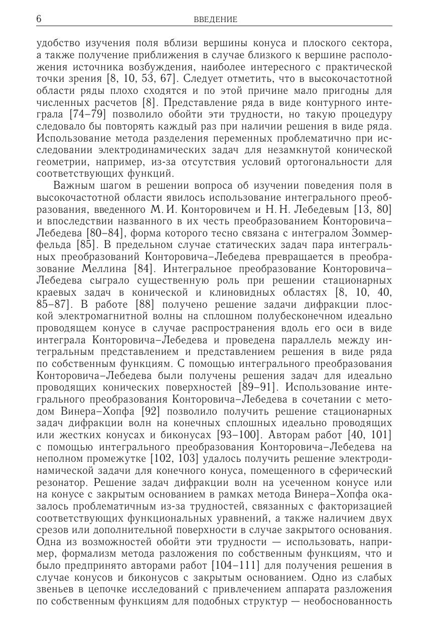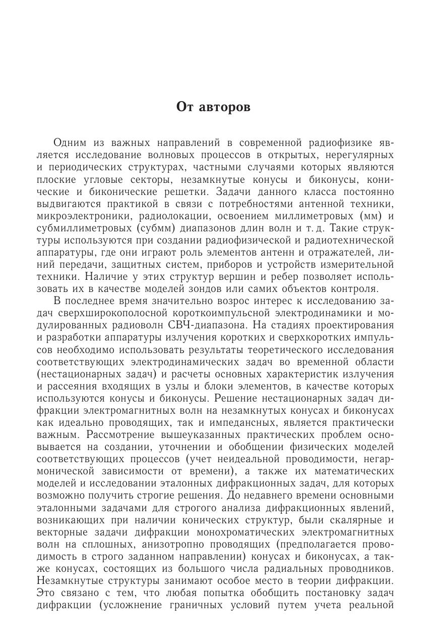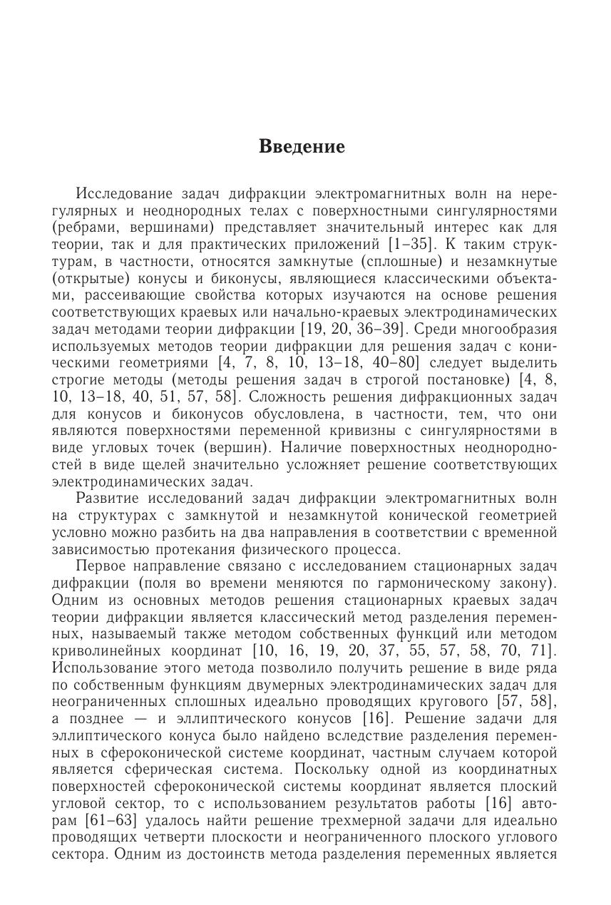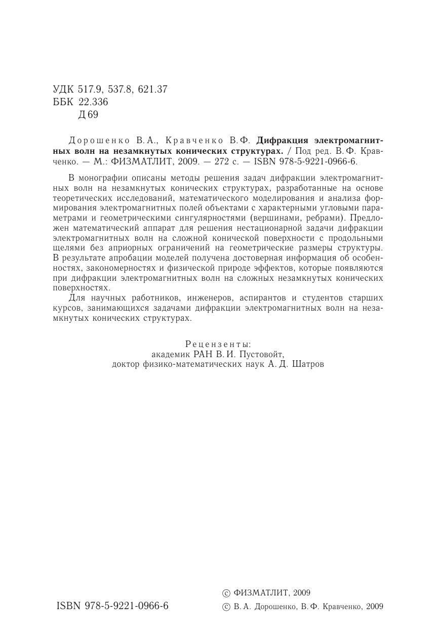 В монографии описаны методы решения задач дифракции электромагнитных волн на незамкнутых конических структурах, разработанные на основе теоретических исследований, математического моделирования и анализа формирования электромагнитных полей объектами с характерными угловыми параметрами и геометрическими сингулярностями (вершинами, ребрами). Предложен математический аппарат для решения нестационарной задачи дифракции электромагнитных волн на сложной конической поверхности с продольными щелями без априорных ограничений на геометрические размеры структуры. В результате апробации моделей получена достоверная информация об особенностях, закономерностях и физической природе эффектов, которые появляются при дифракции электромагнитных волн на сложных незамкнутых конических поверхностях.Для научных работников, инженеров, аспирантов и студентов старших курсов, занимающихся задачами дифракции электромагнитных волн на незамкнутых конических структурах.