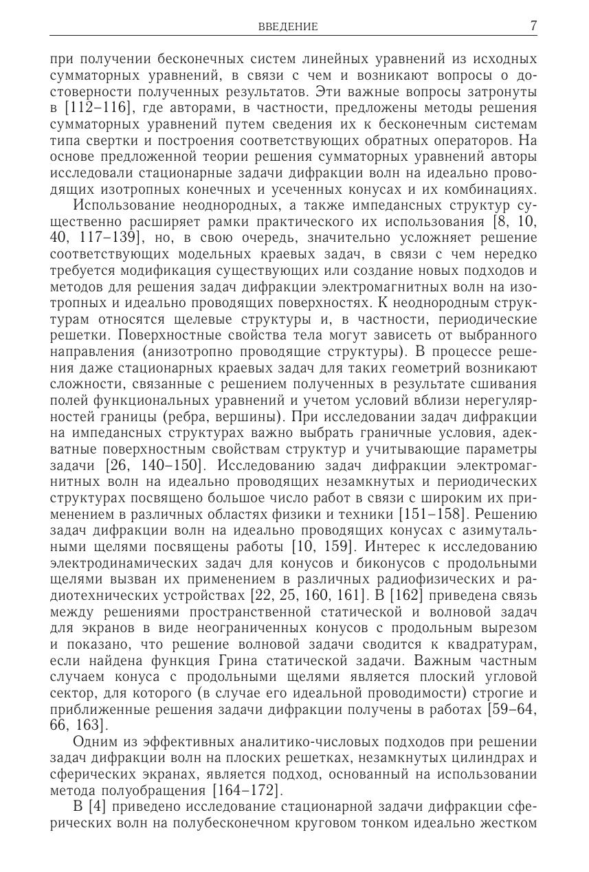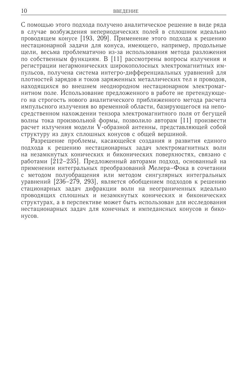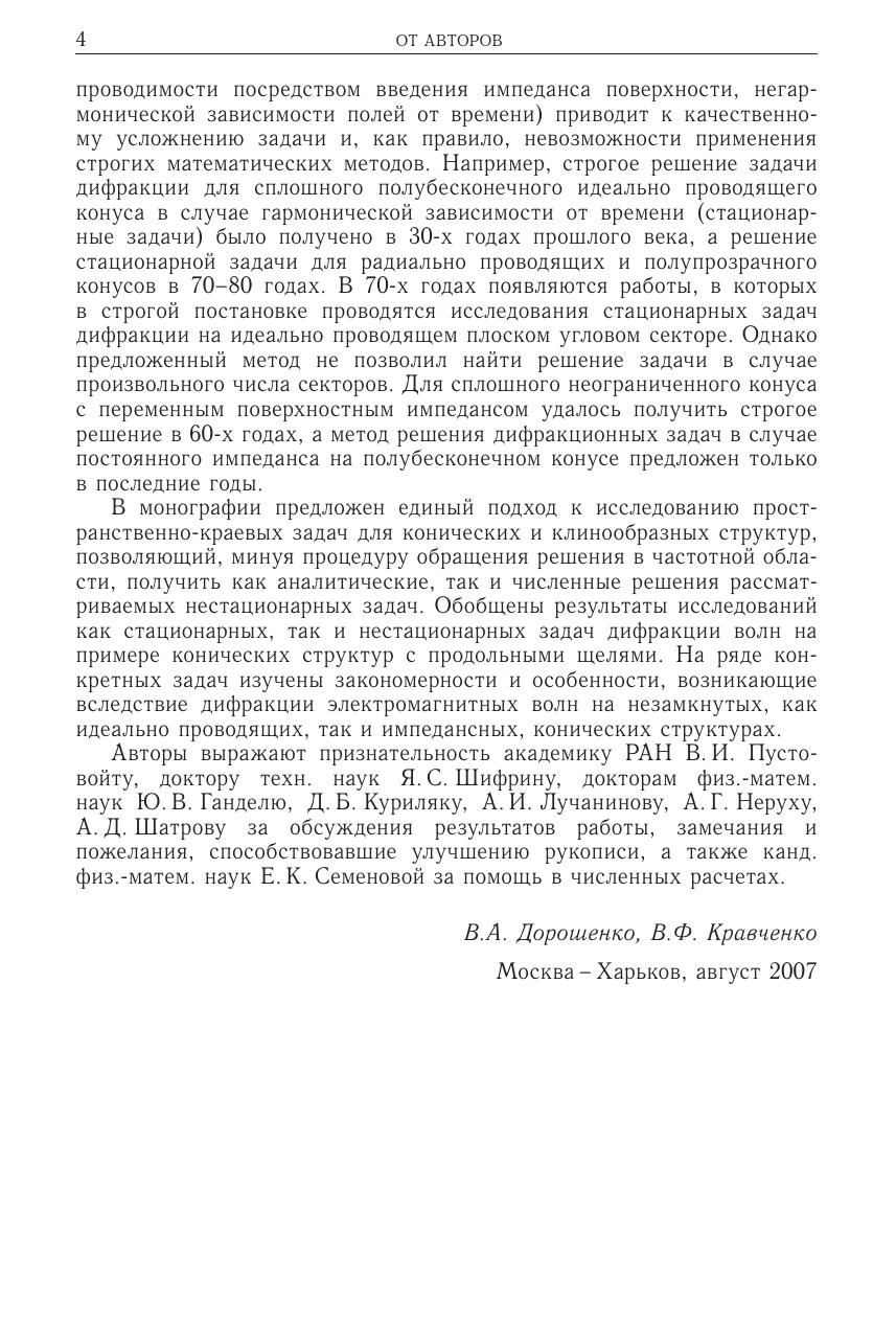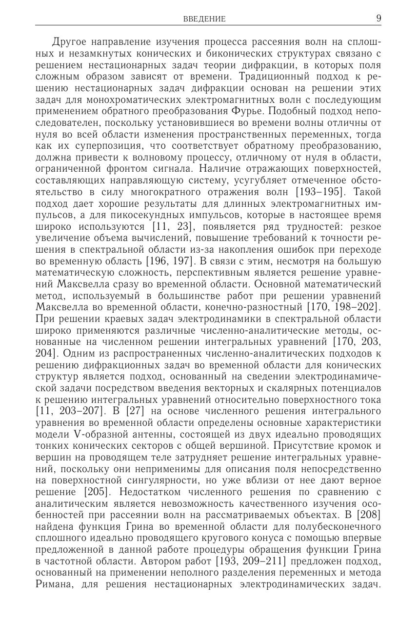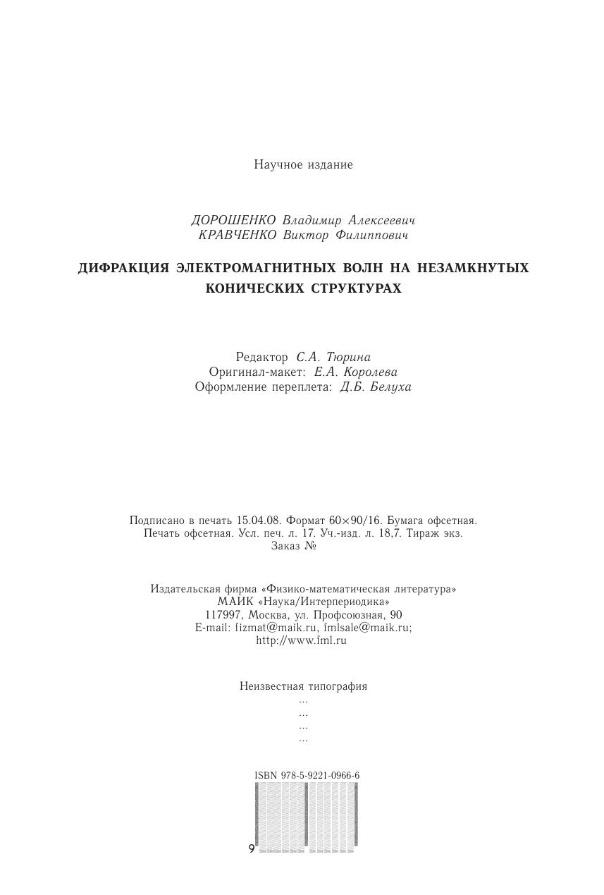 В монографии описаны методы решения задач дифракции электромагнитных волн на незамкнутых конических структурах, разработанные на основе теоретических исследований, математического моделирования и анализа формирования электромагнитных полей объектами с характерными угловыми параметрами и геометрическими сингулярностями (вершинами, ребрами). Предложен математический аппарат для решения нестационарной задачи дифракции электромагнитных волн на сложной конической поверхности с продольными щелями без априорных ограничений на геометрические размеры структуры. В результате апробации моделей получена достоверная информация об особенностях, закономерностях и физической природе эффектов, которые появляются при дифракции электромагнитных волн на сложных незамкнутых конических поверхностях.Для научных работников, инженеров, аспирантов и студентов старших курсов, занимающихся задачами дифракции электромагнитных волн на незамкнутых конических структурах.