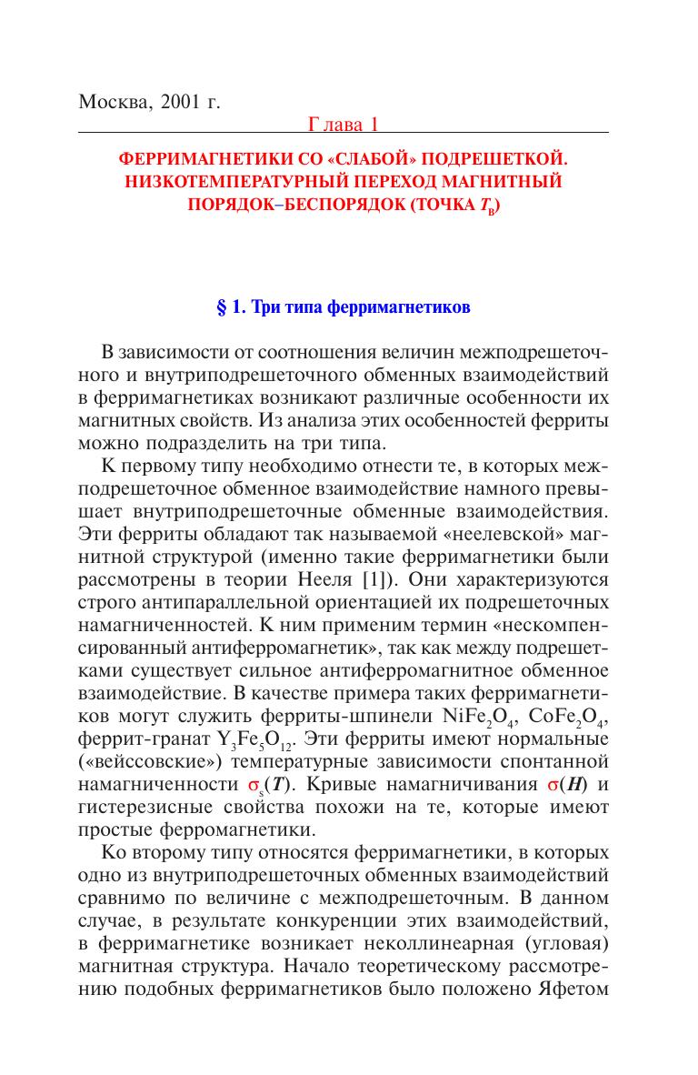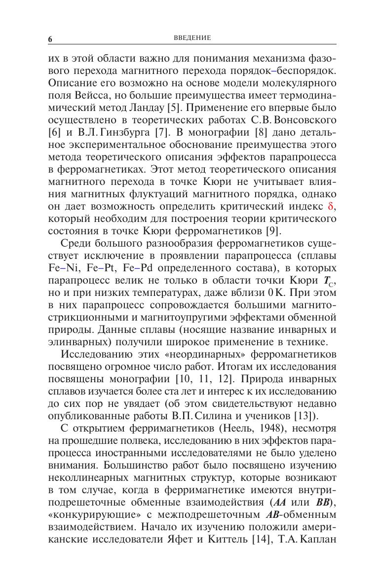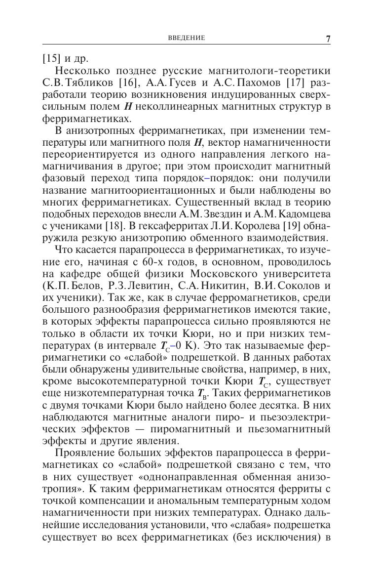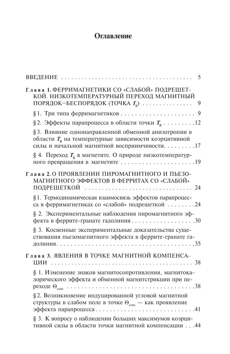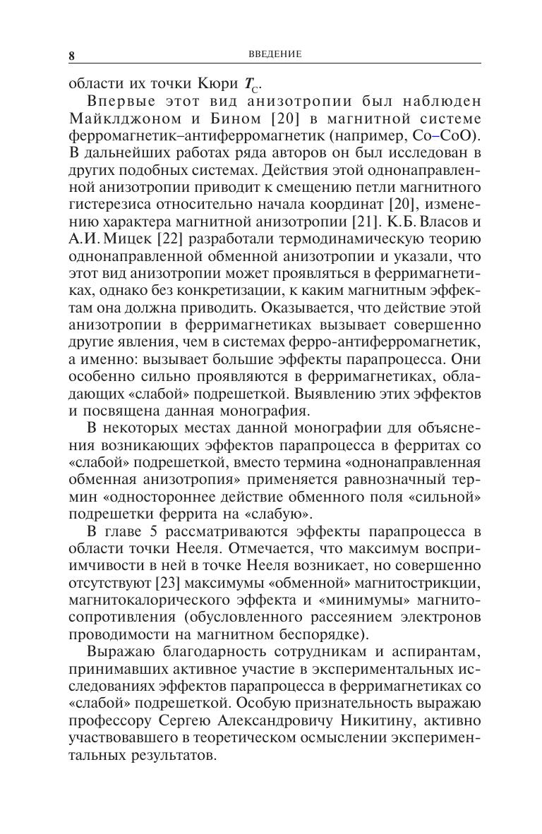Подведены итоги изучения парапроцесса и сопутствующих ему явлений: <<обменной>> магнитострикции, магнитокалорического эффекта и магнитосопротивления в ферримагнетиках в области точки Кюри и в некоторых из них при низких температурах (например, в феррите-гранате гадолиния). Эти явления, по сравнению с ферромагнетиками, носят очень сложный характер. Причина этого - различие подрешеток (действие <<сильной>> подрешетки на <<слабую>>), вследствие чего в них возникает <<однонаправленная обменная анизотропия>>, вызывающая аномальные эффекты парапроцесса. Для научных работников, аспирантов и студентов, интересующихся проблемами магнетизма