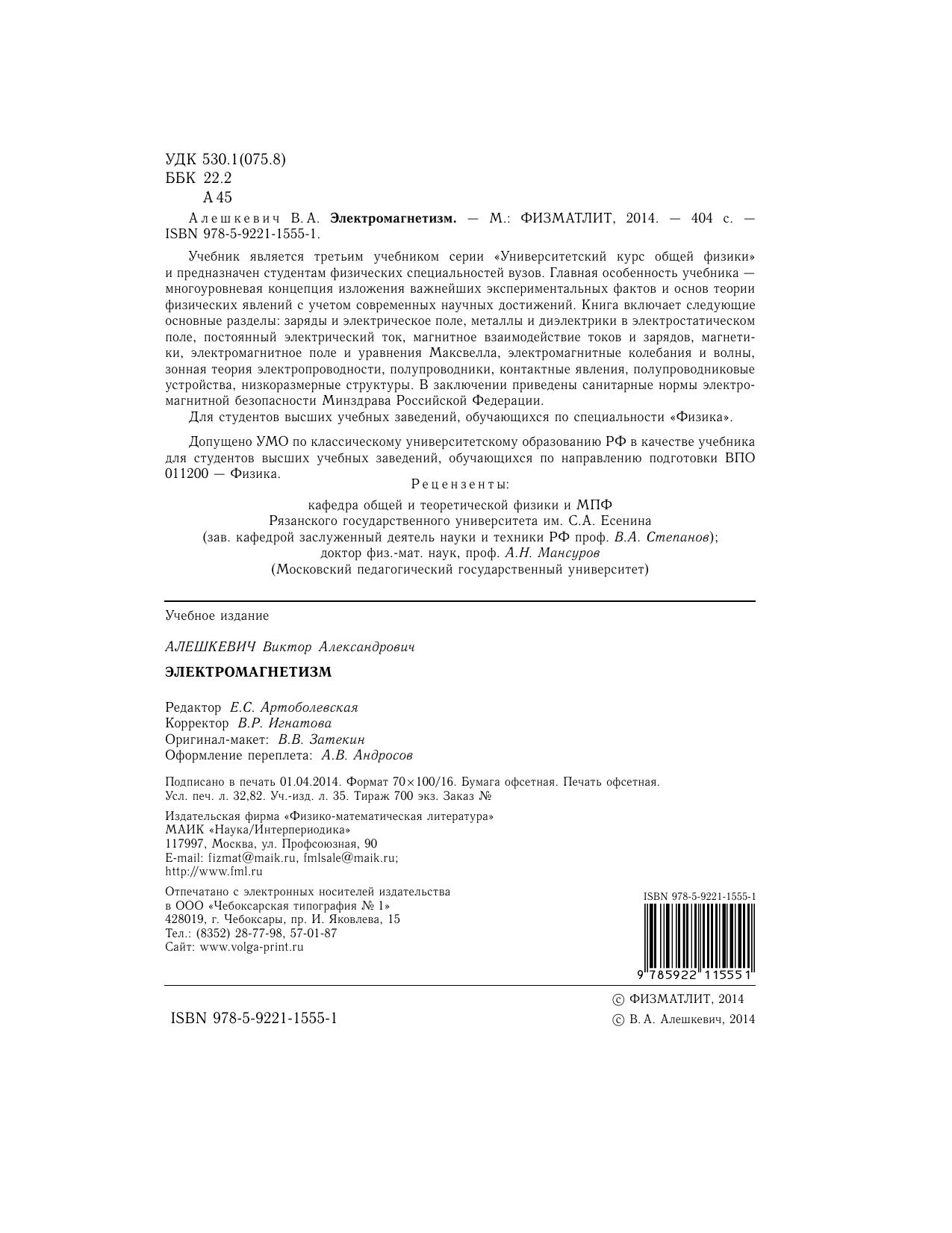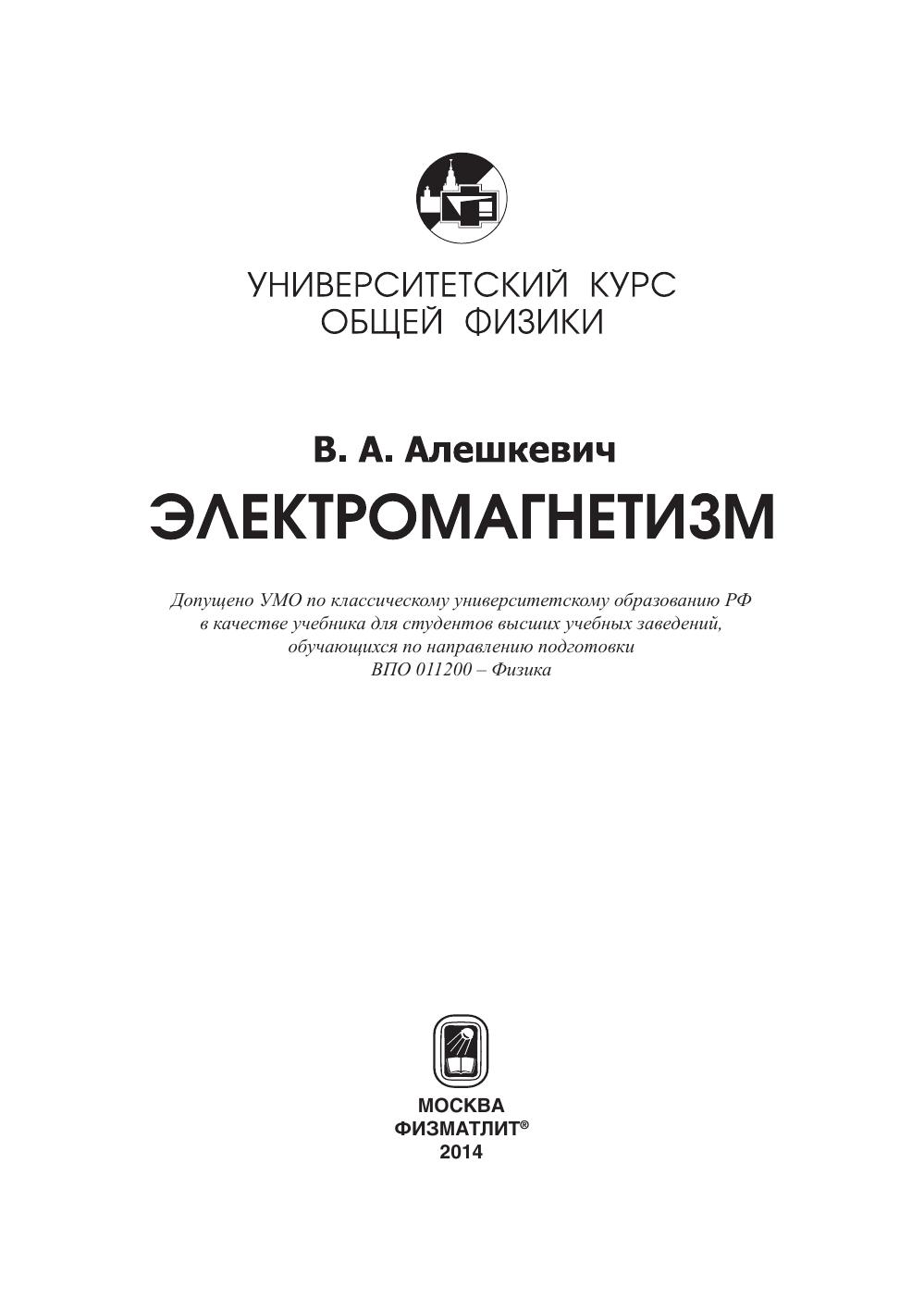 Гриф: Допущено УМО по классическому университетскому образованию РФ в качестве учебника для студентов высших учебных заведений, обучающихся по направлению подготовки ВПО 011200 – Физика