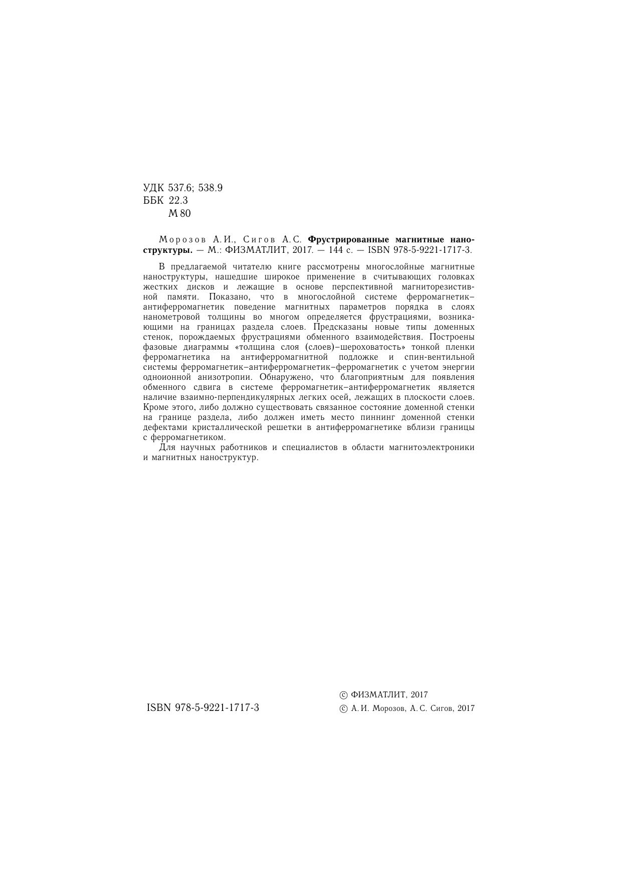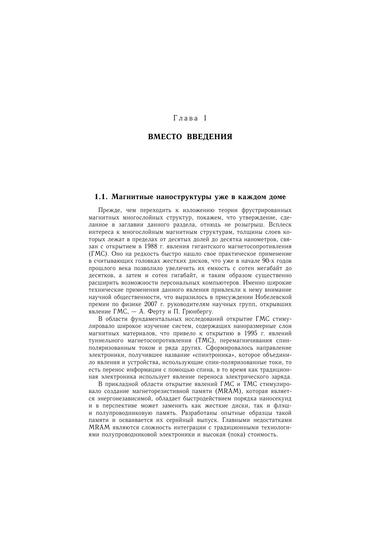 В предлагаемой читателю книге рассмотрены многослойные магнитные наноструктуры, нашедшие широкое применение в считывающих головках жестких дисков и лежащие в основе перспективной магниторезистивной памяти. Показано, что в многослойной системе ферромагнетик– антиферромагнетик поведение магнитных параметров порядка в слоях нанометровой толщины во многом определяется фрустрациями, возникающими на границах раздела слоев. Предсказаны новые типы доменных стенок, порождаемых фрустрациями обменного взаимодействия. Построены фазовые диаграммы «толщина слоя (слоев)–шероховатость» тонкой пленки
